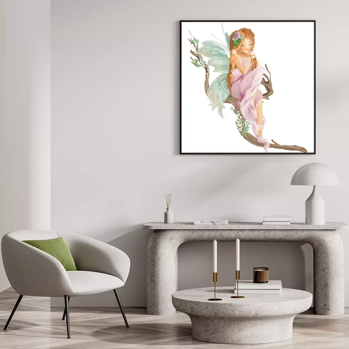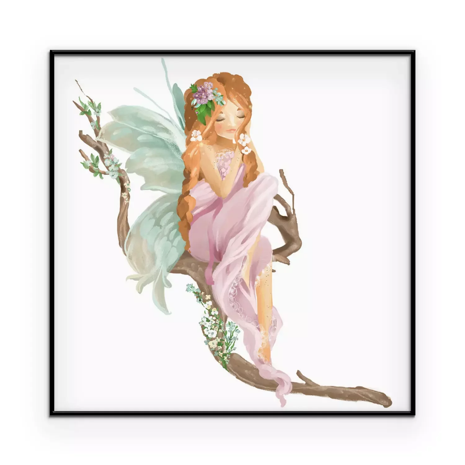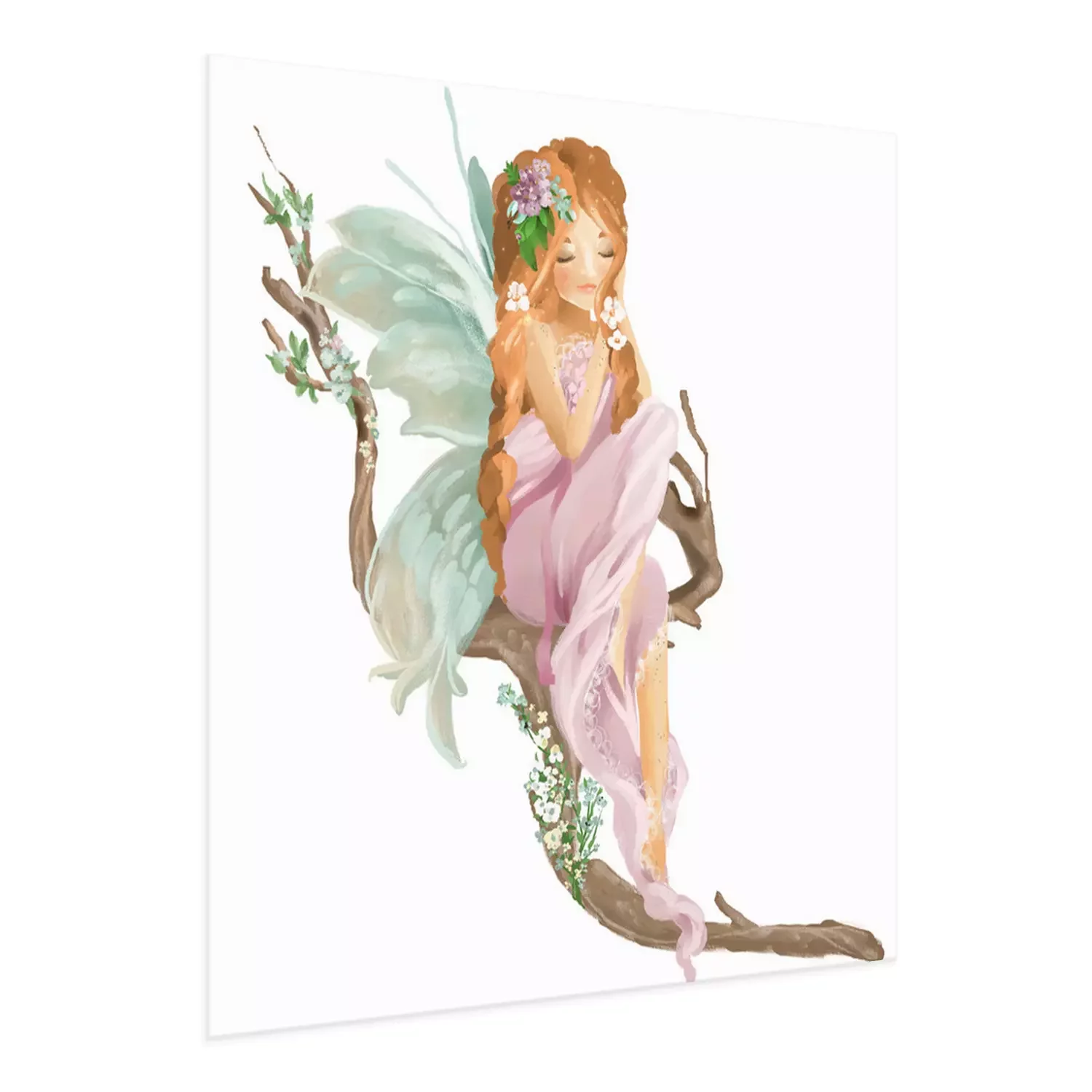 Poster: Waldfee auf einem Ast mit Blumen sitzend
