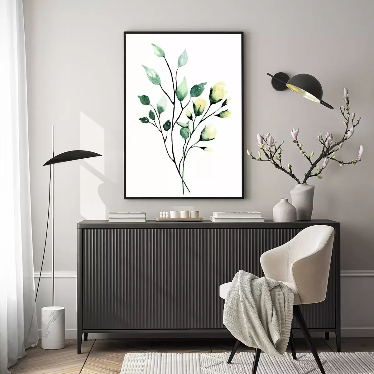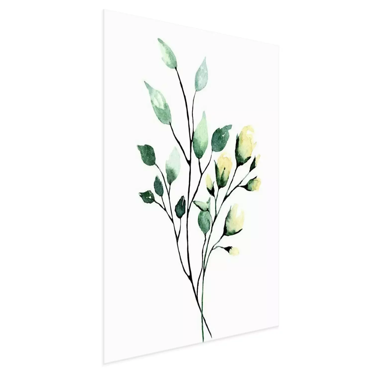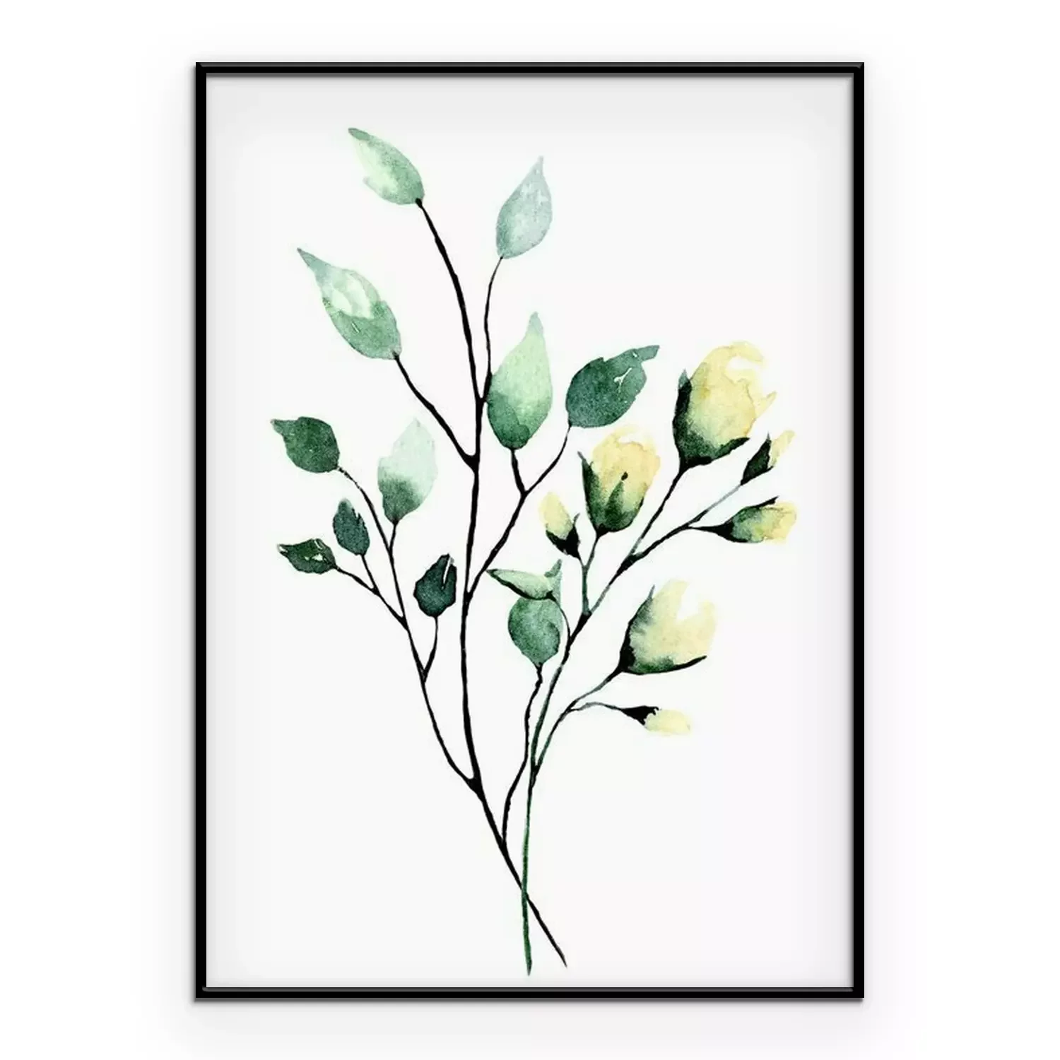Poster: Watercolor branch with green leaves and flowers roses. Hand painting floral illustration. Leaf, plant isolated on white background.