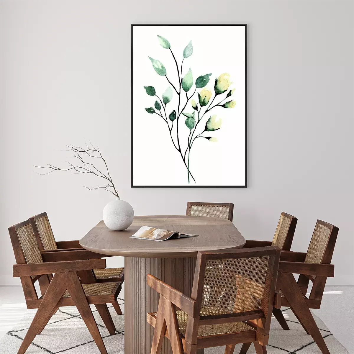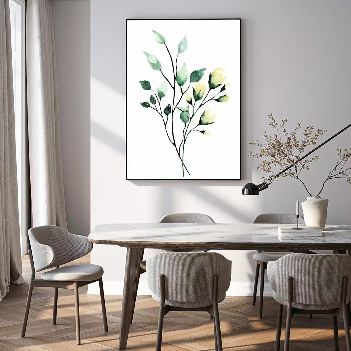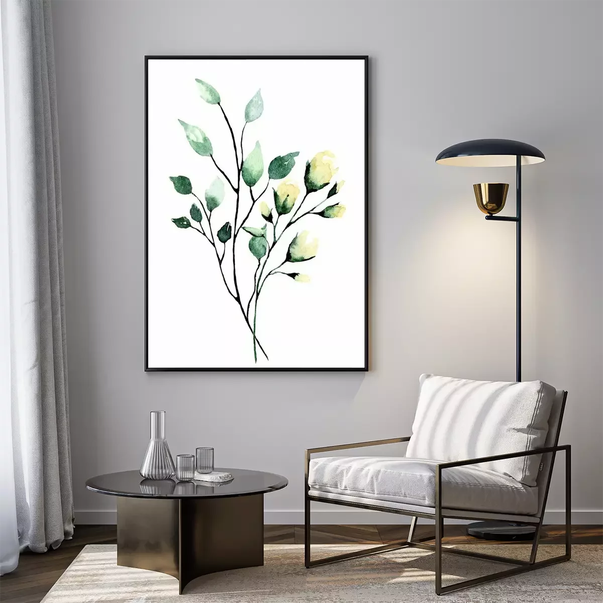 Poster: Watercolor branch with green leaves and flowers roses. Hand painting floral illustration. Leaf, plant isolated on white background.