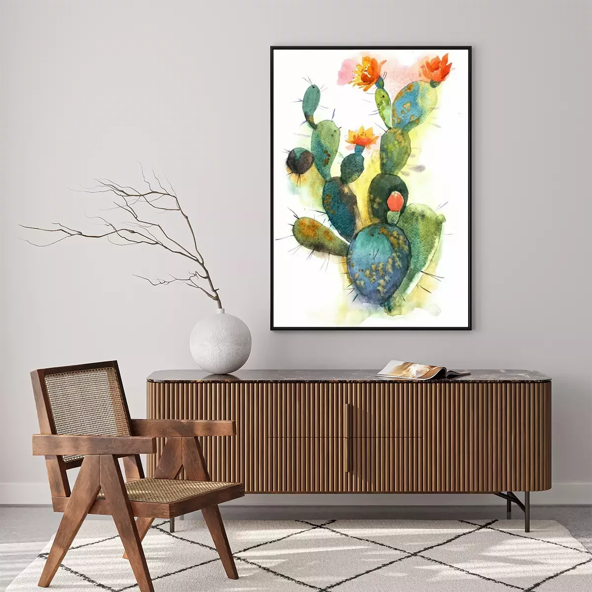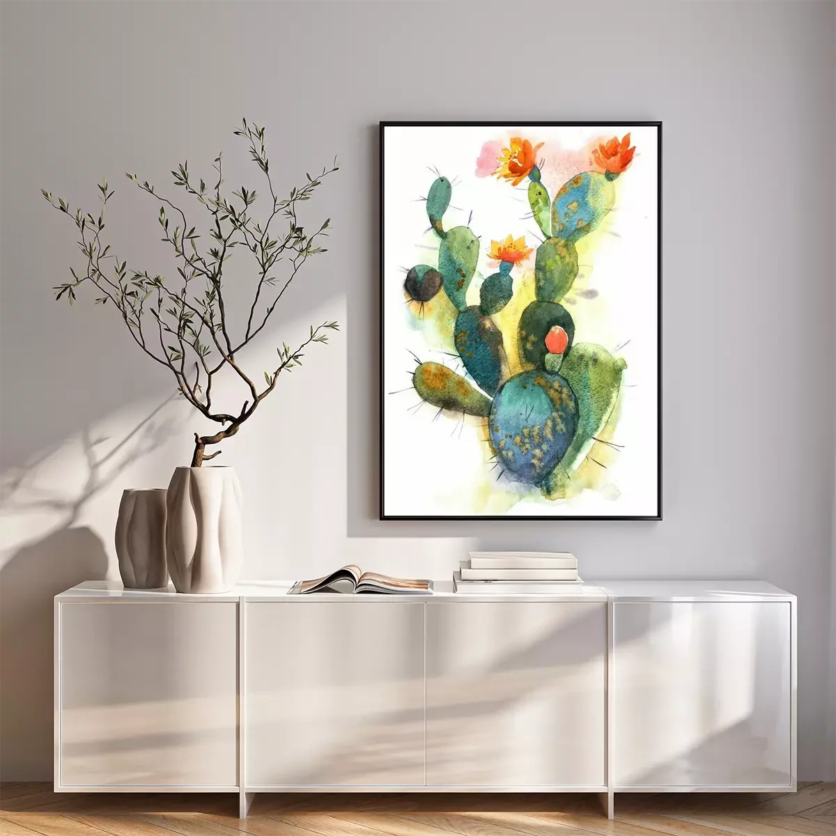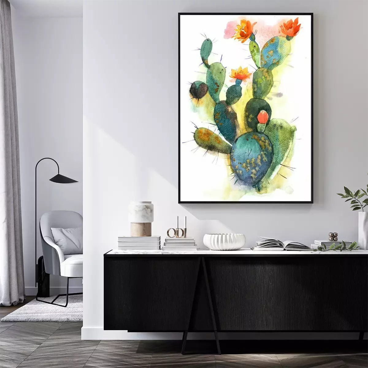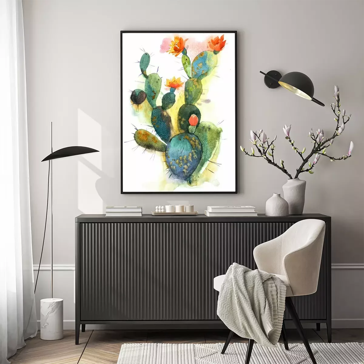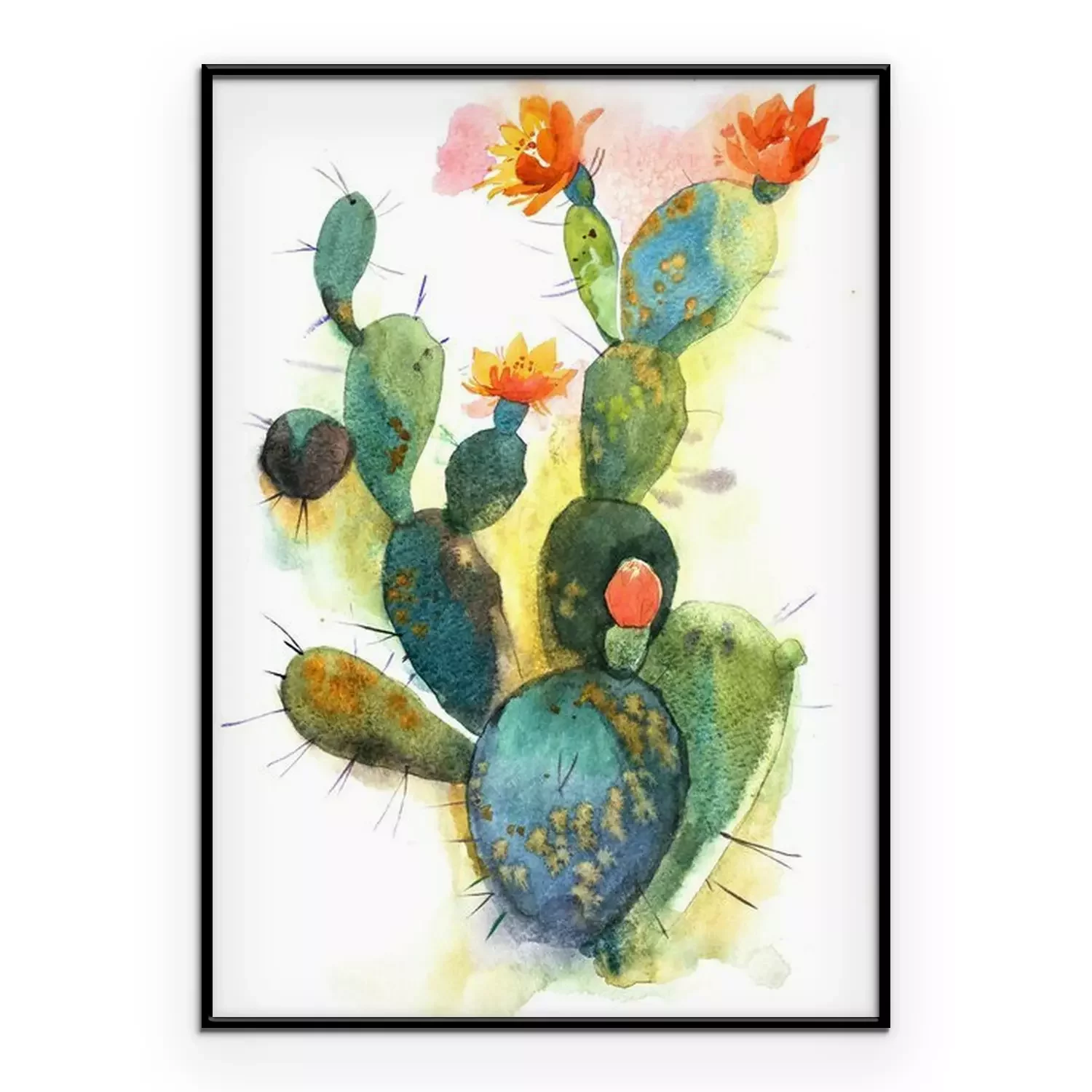 Poster Watercolor hand drawn spiky cactus bloom flower