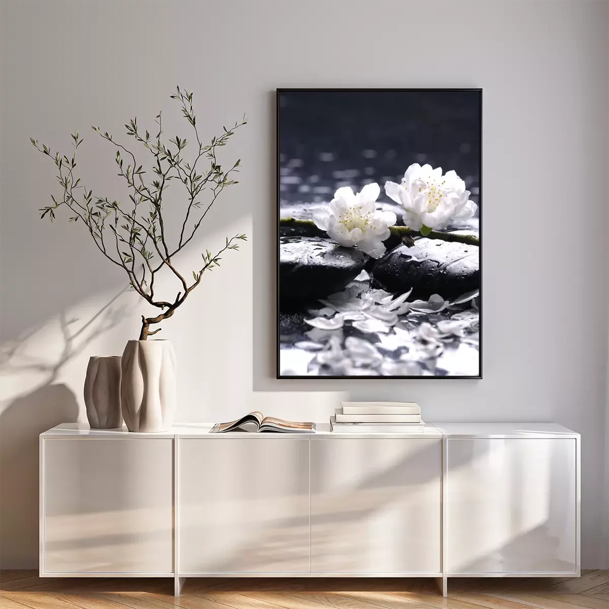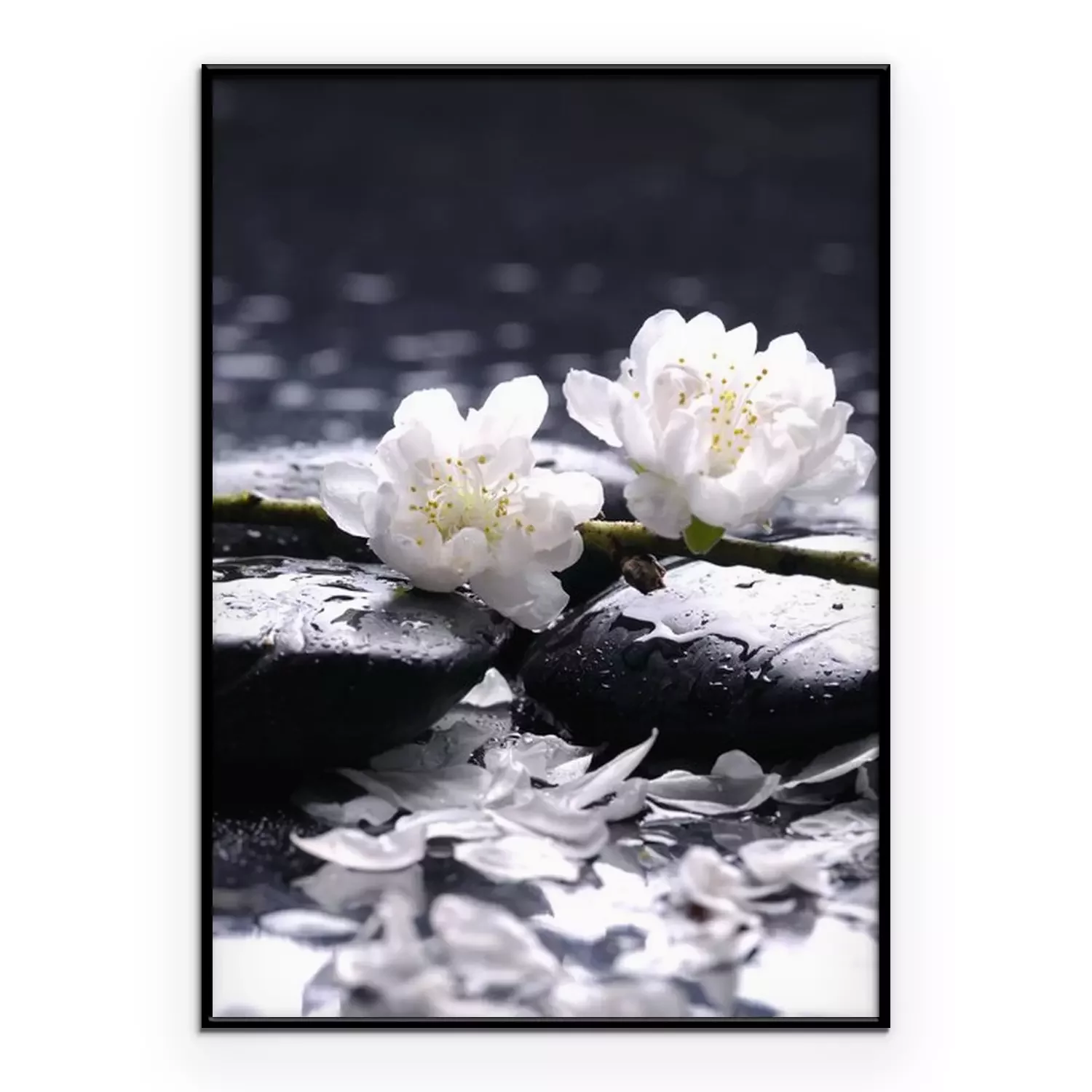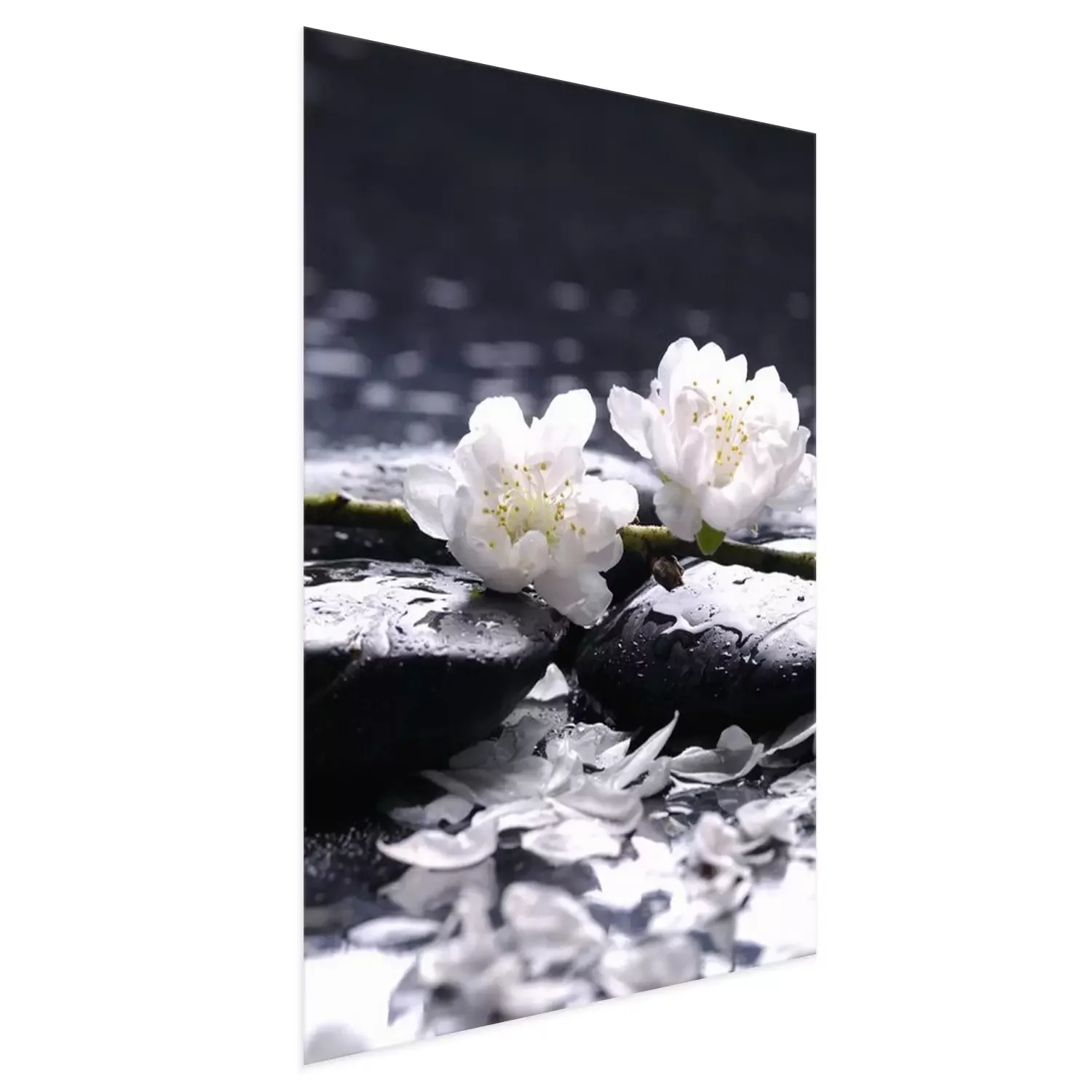 Poster: Weiße Blumen lehnen auf nassen Steinen