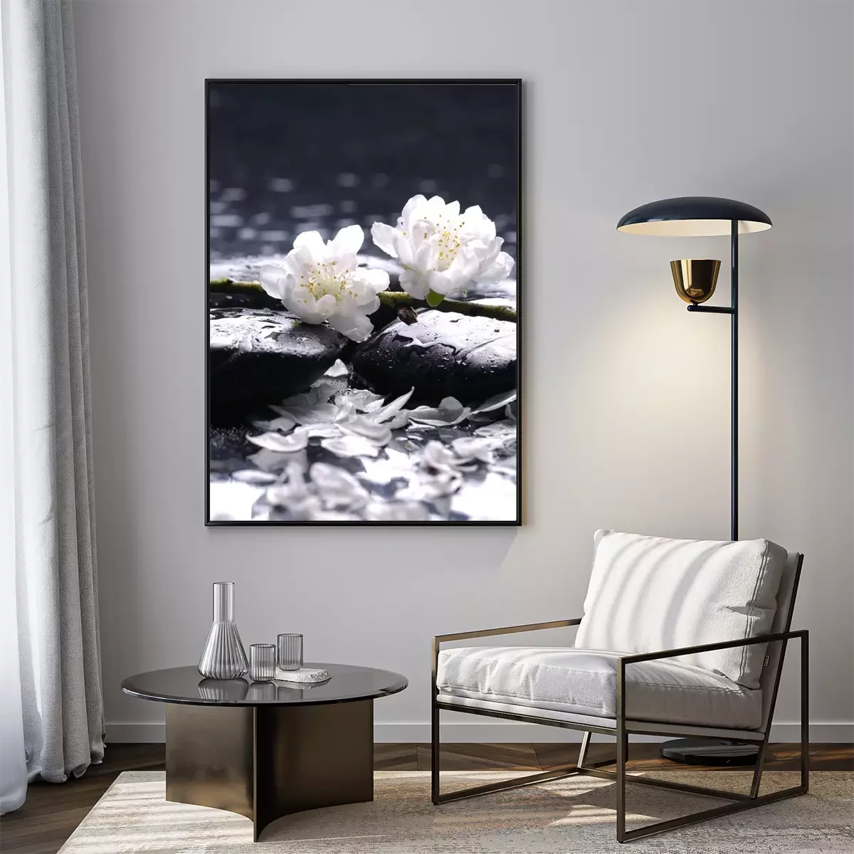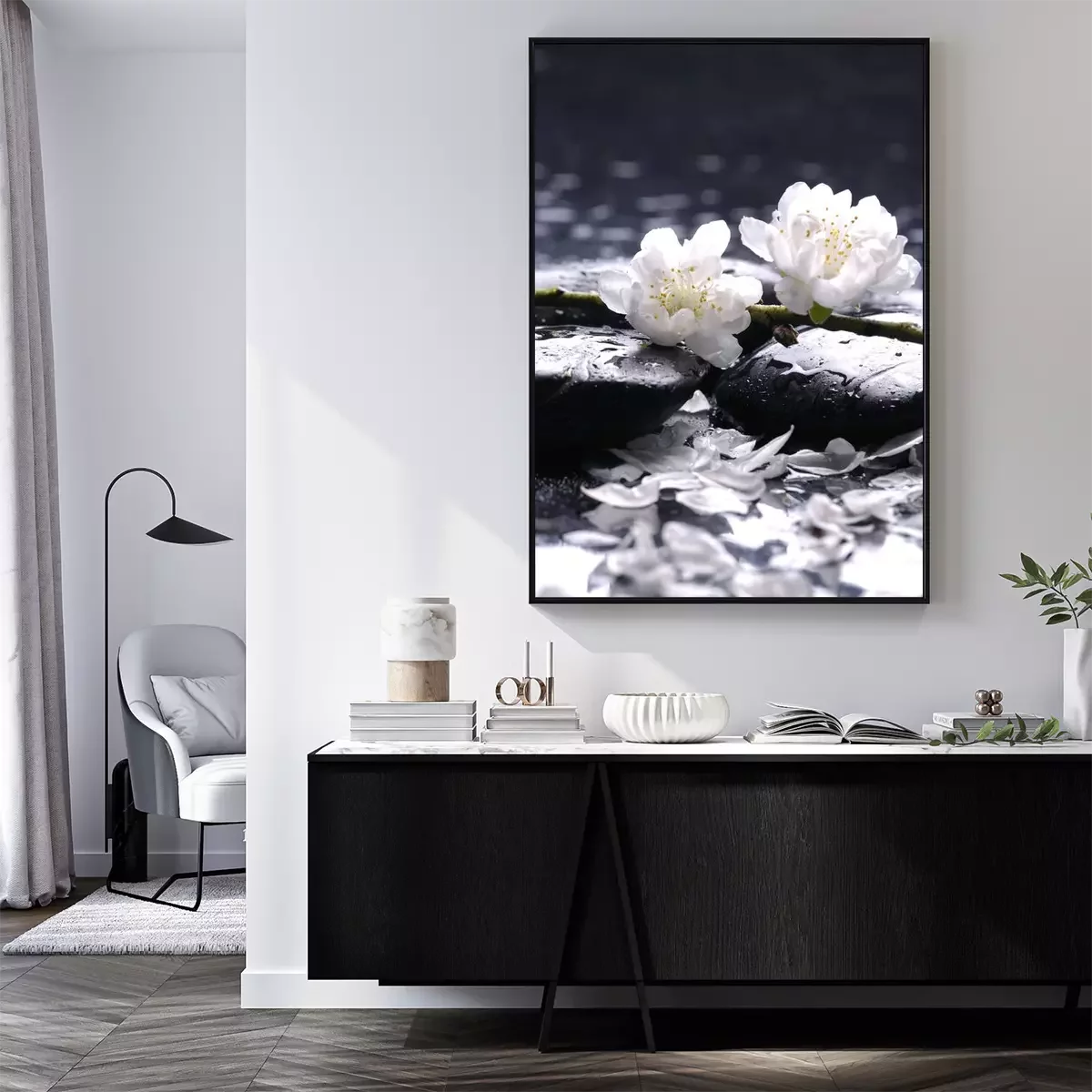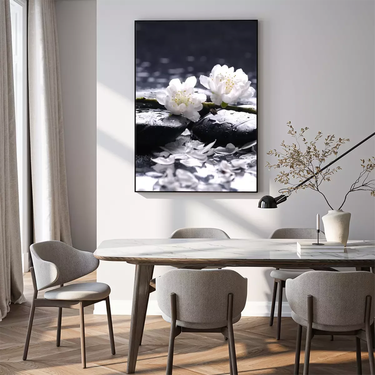 Poster: Weiße Blumen lehnen auf nassen Steinen