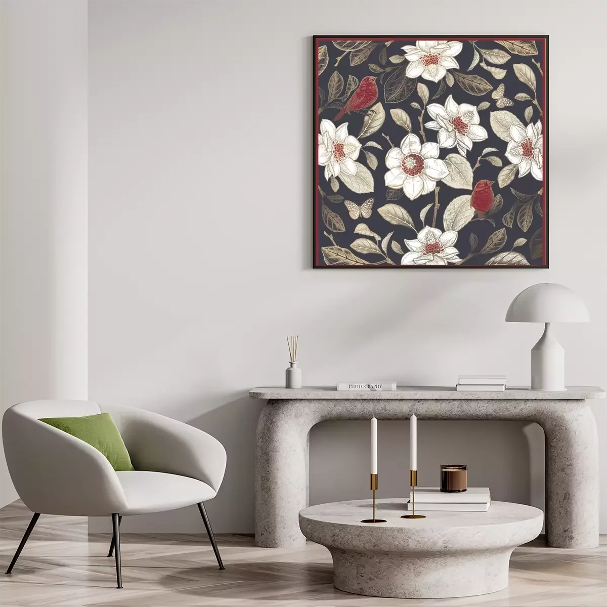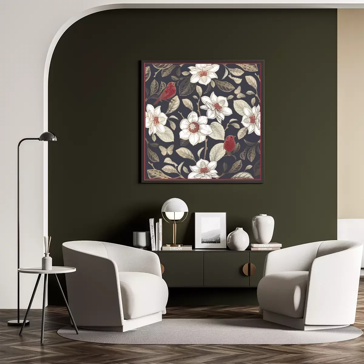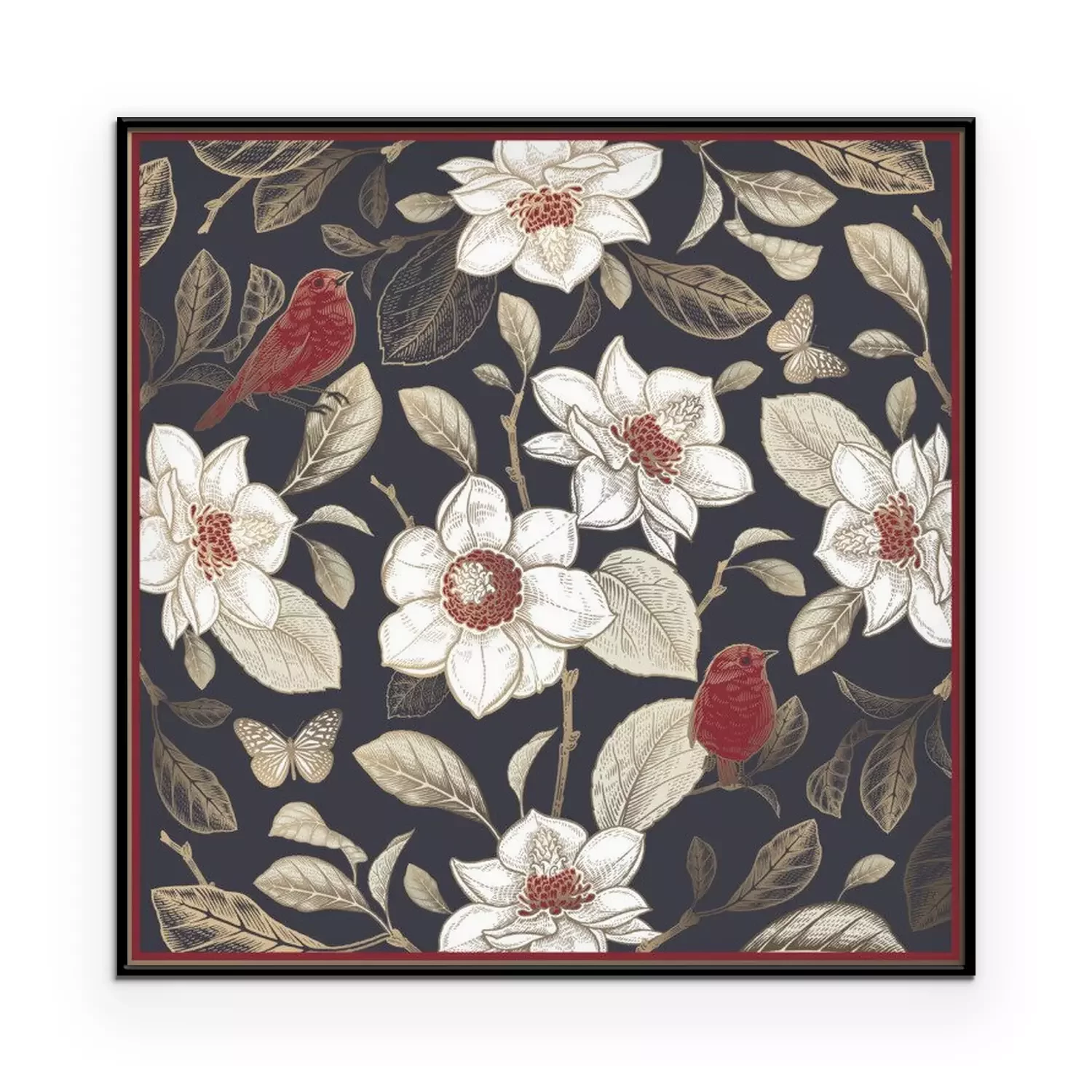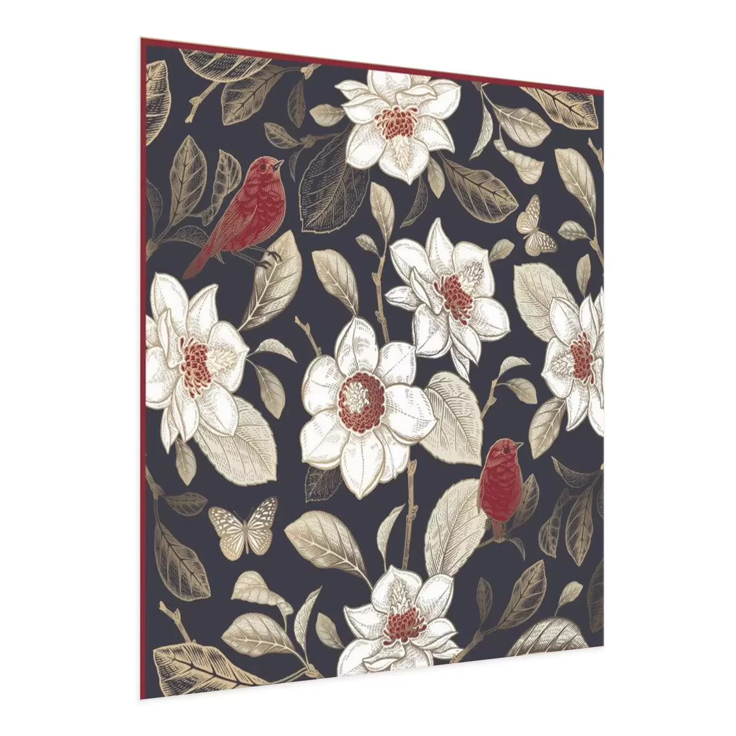 Poster: Weiße Magnolie und rote Vögel auf den Blättern