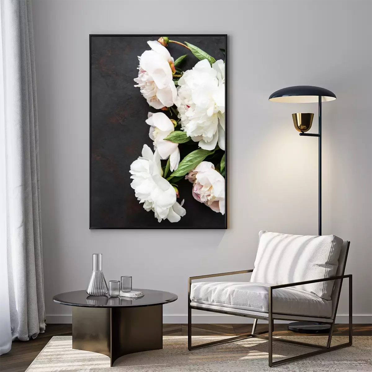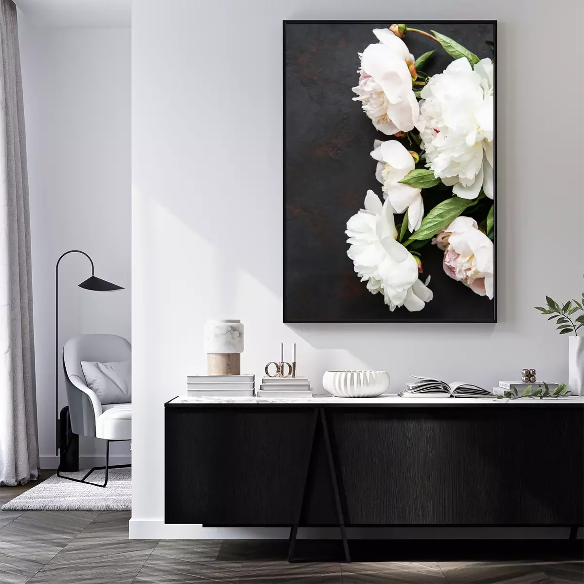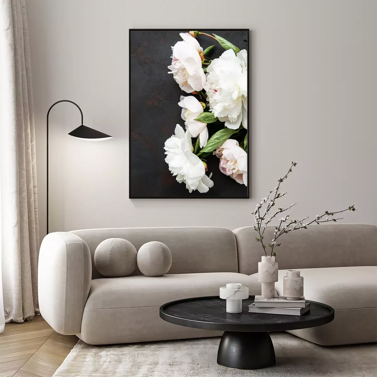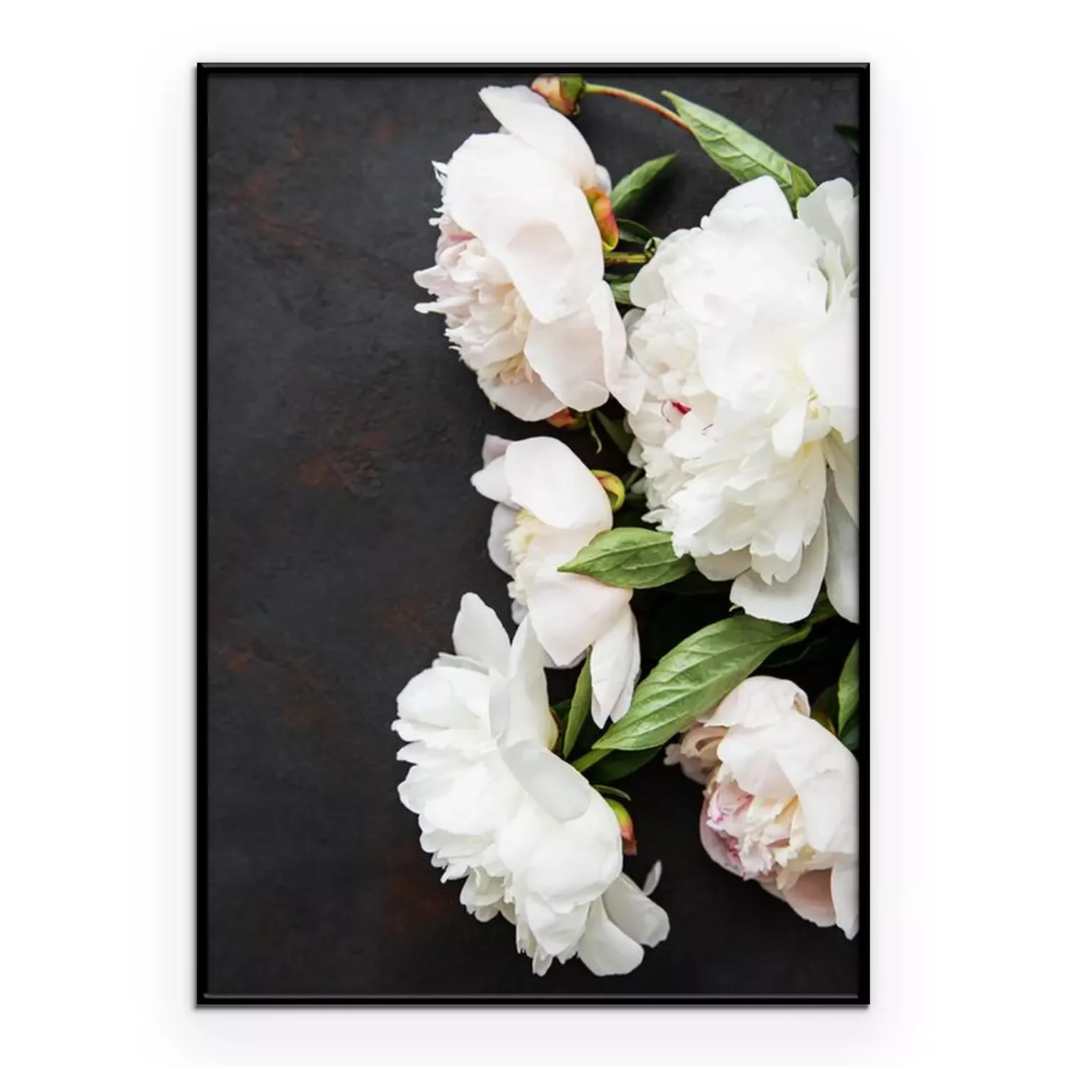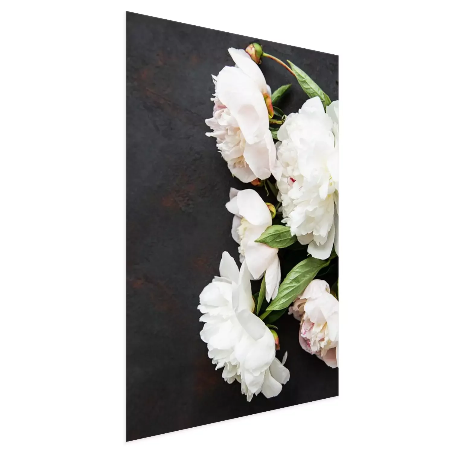 Poster: Weiße Pfingstrosen auf einem dunklen Stein angeordnet