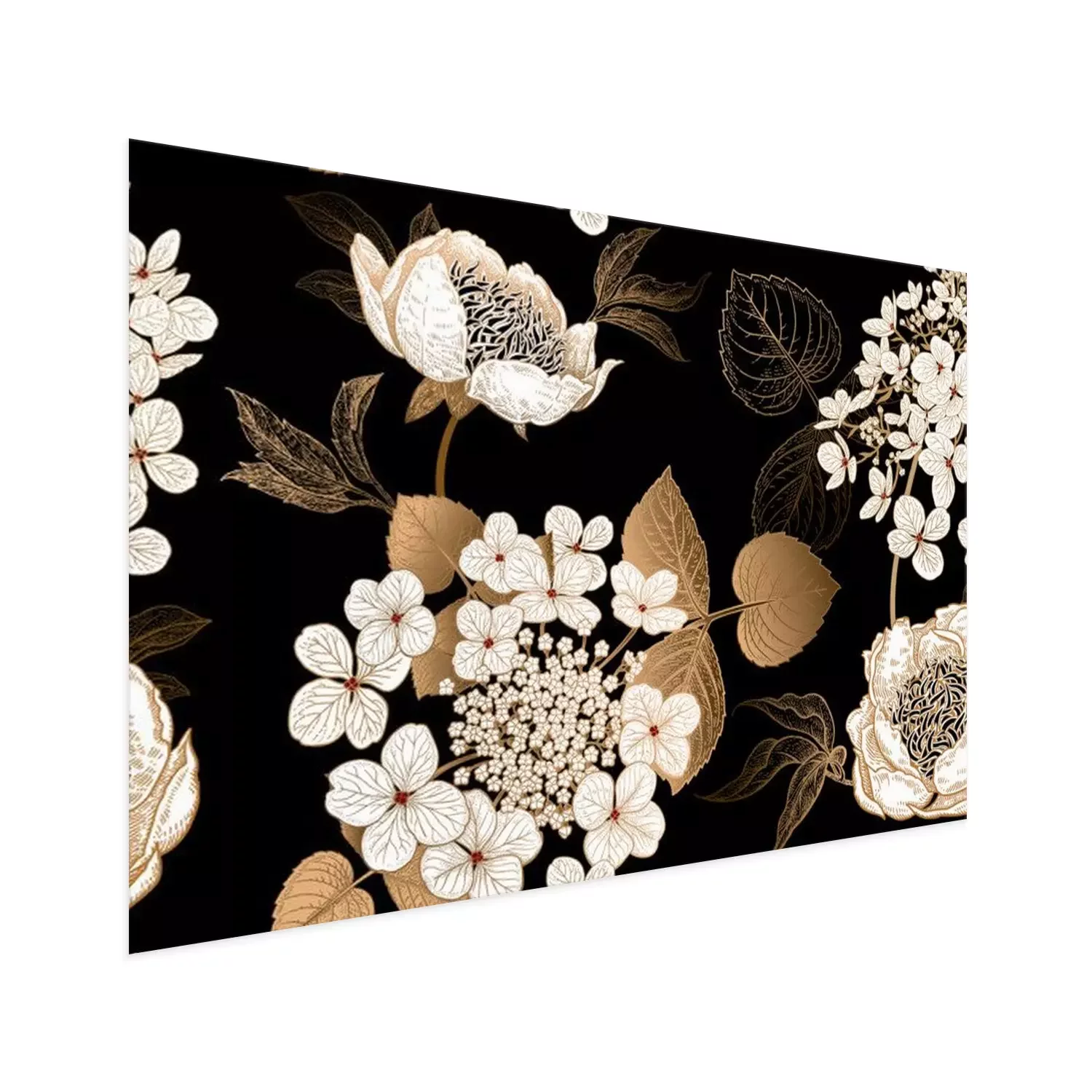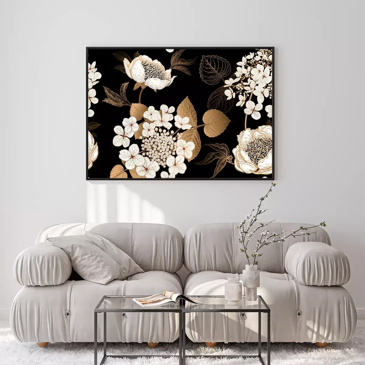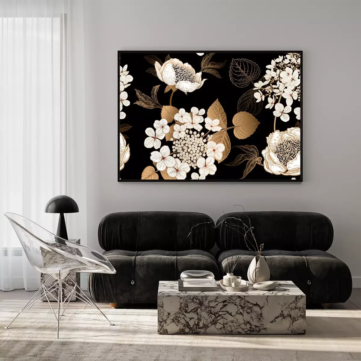 Poster: Weiße Pfingstrosen und goldene Blätter in Schwarz