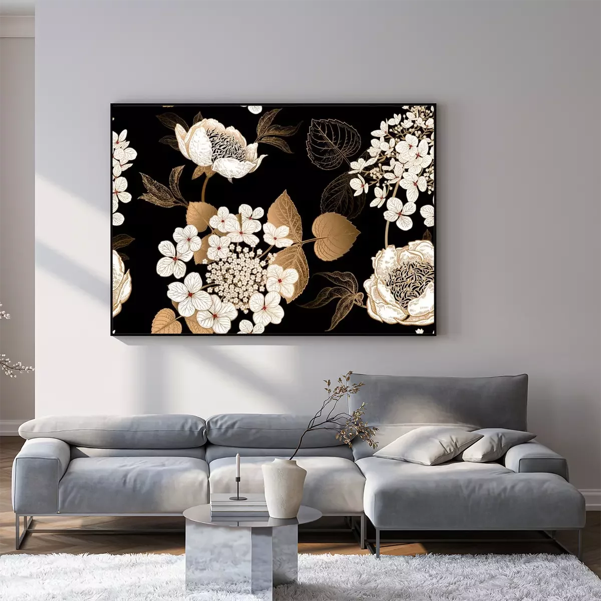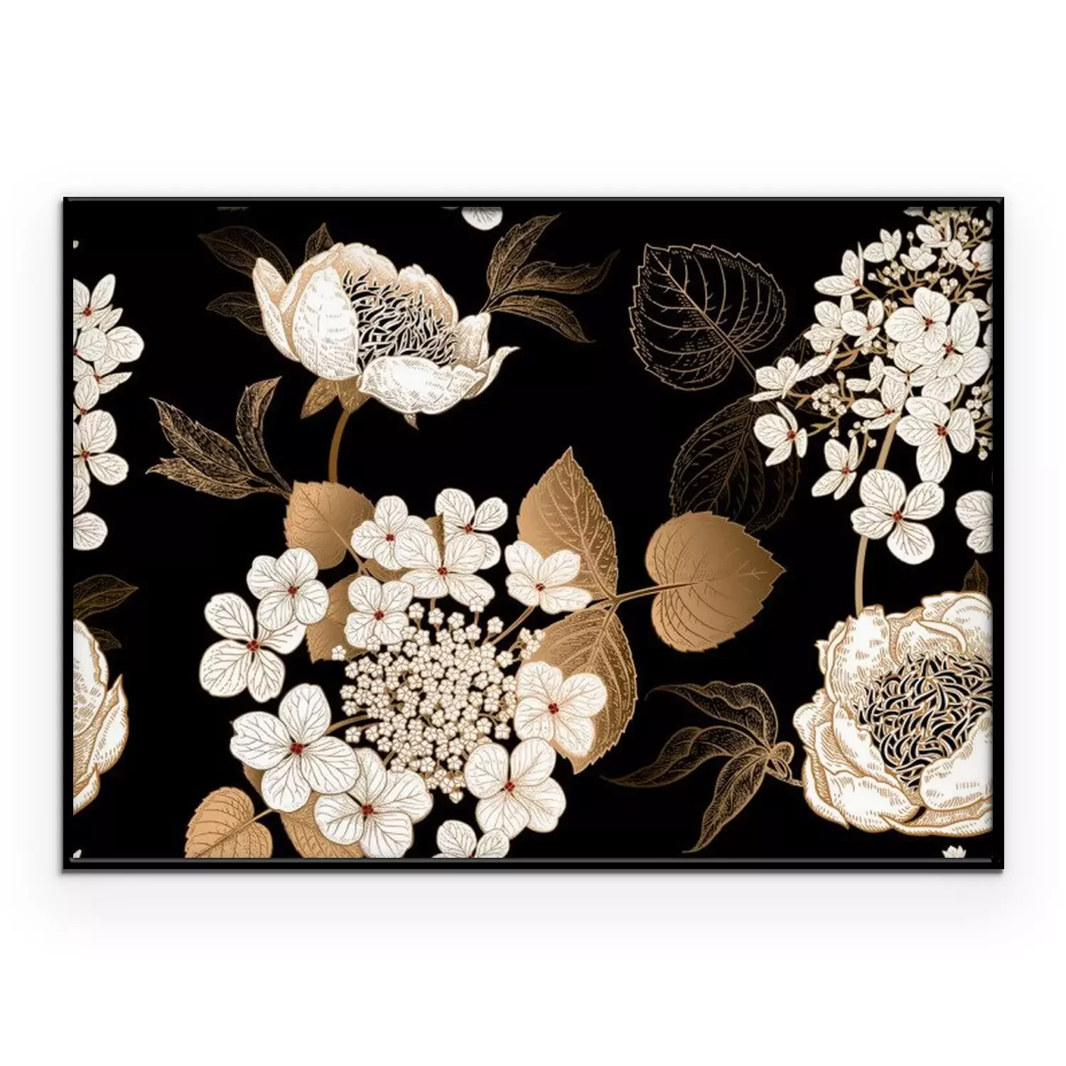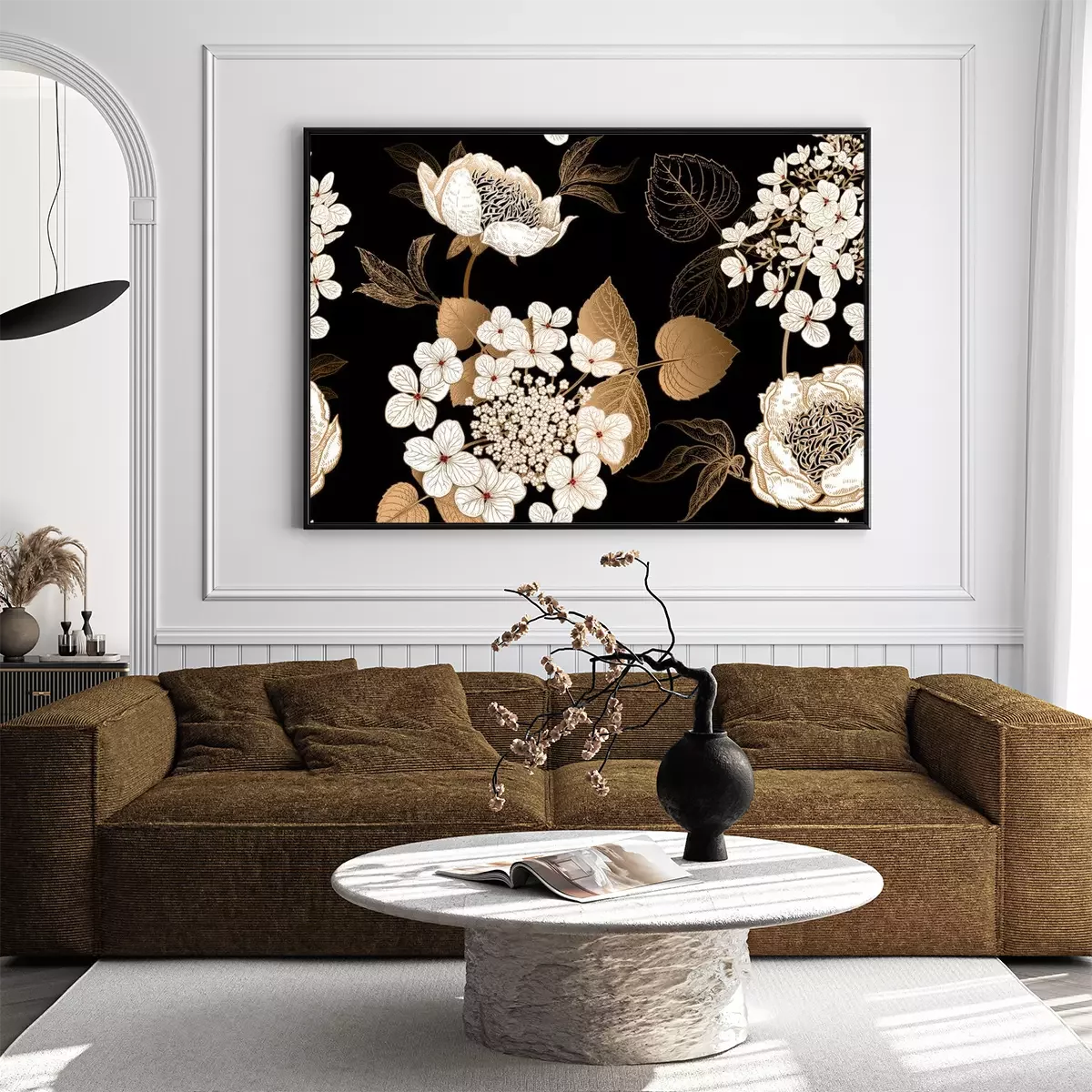 Poster: Weiße Pfingstrosen und goldene Blätter in Schwarz