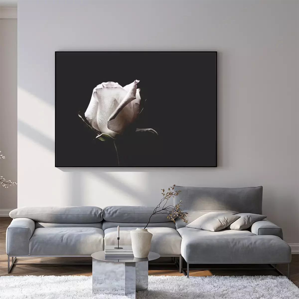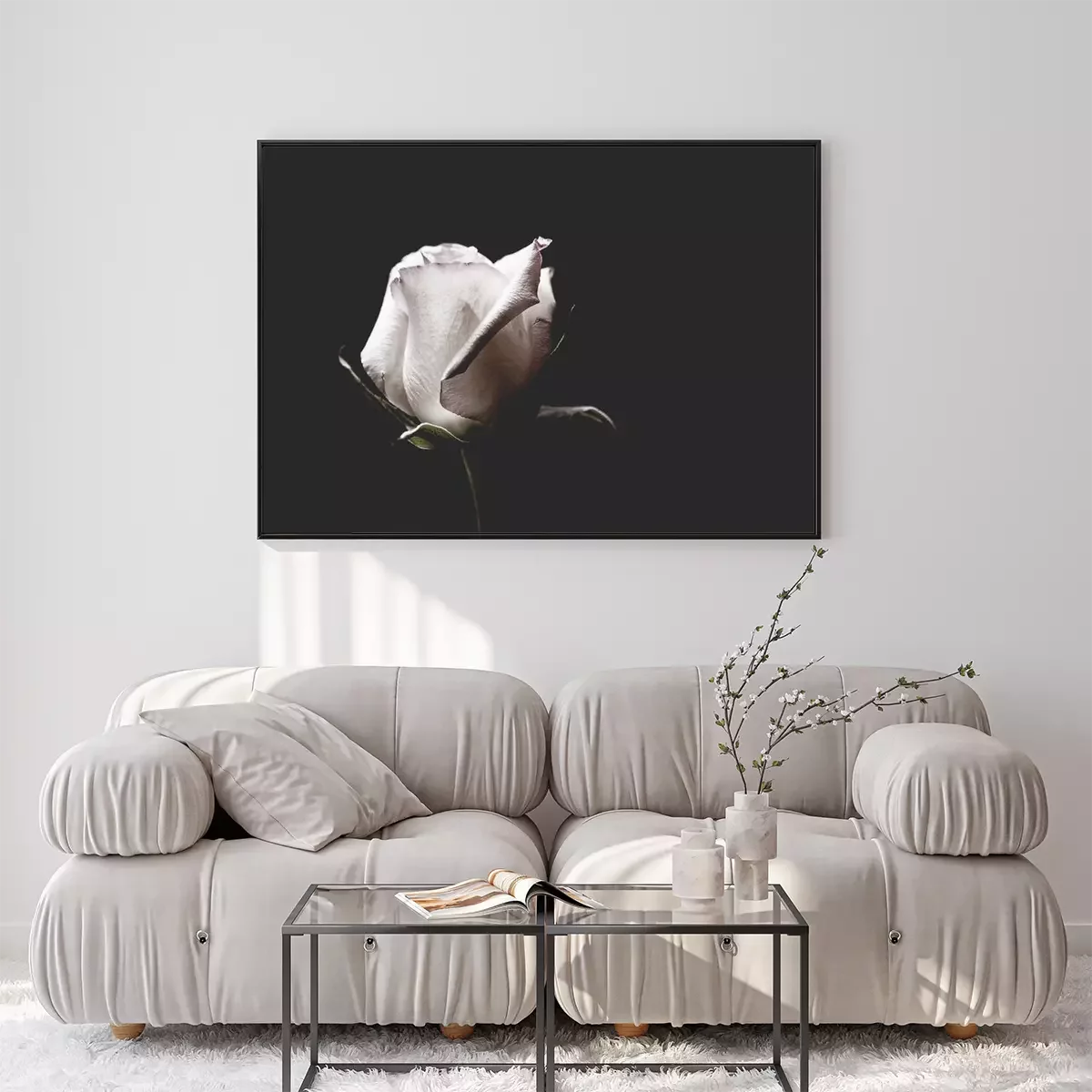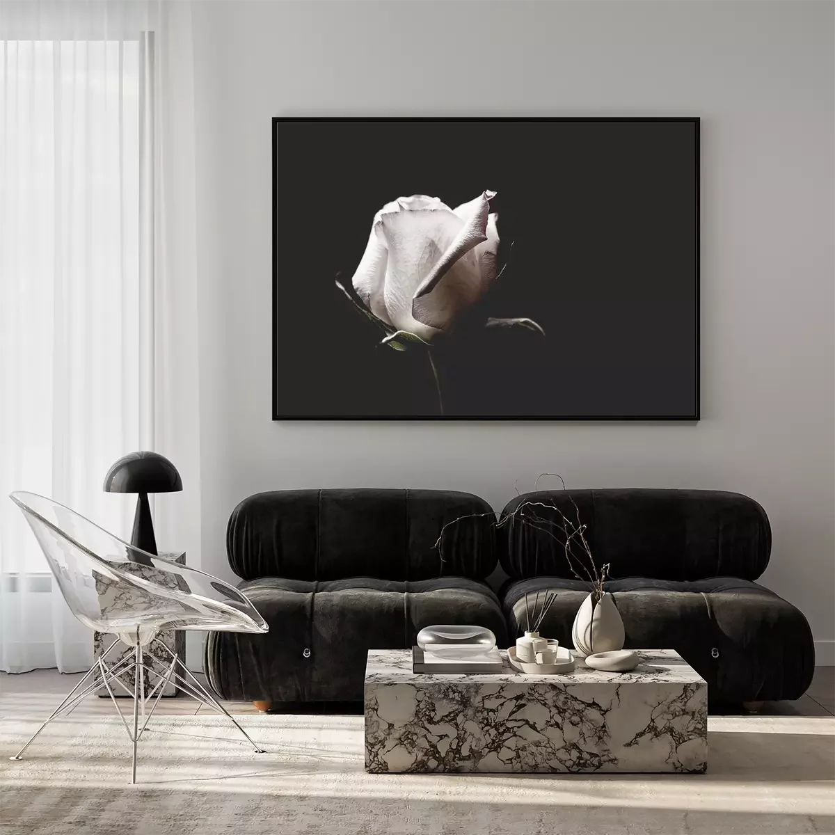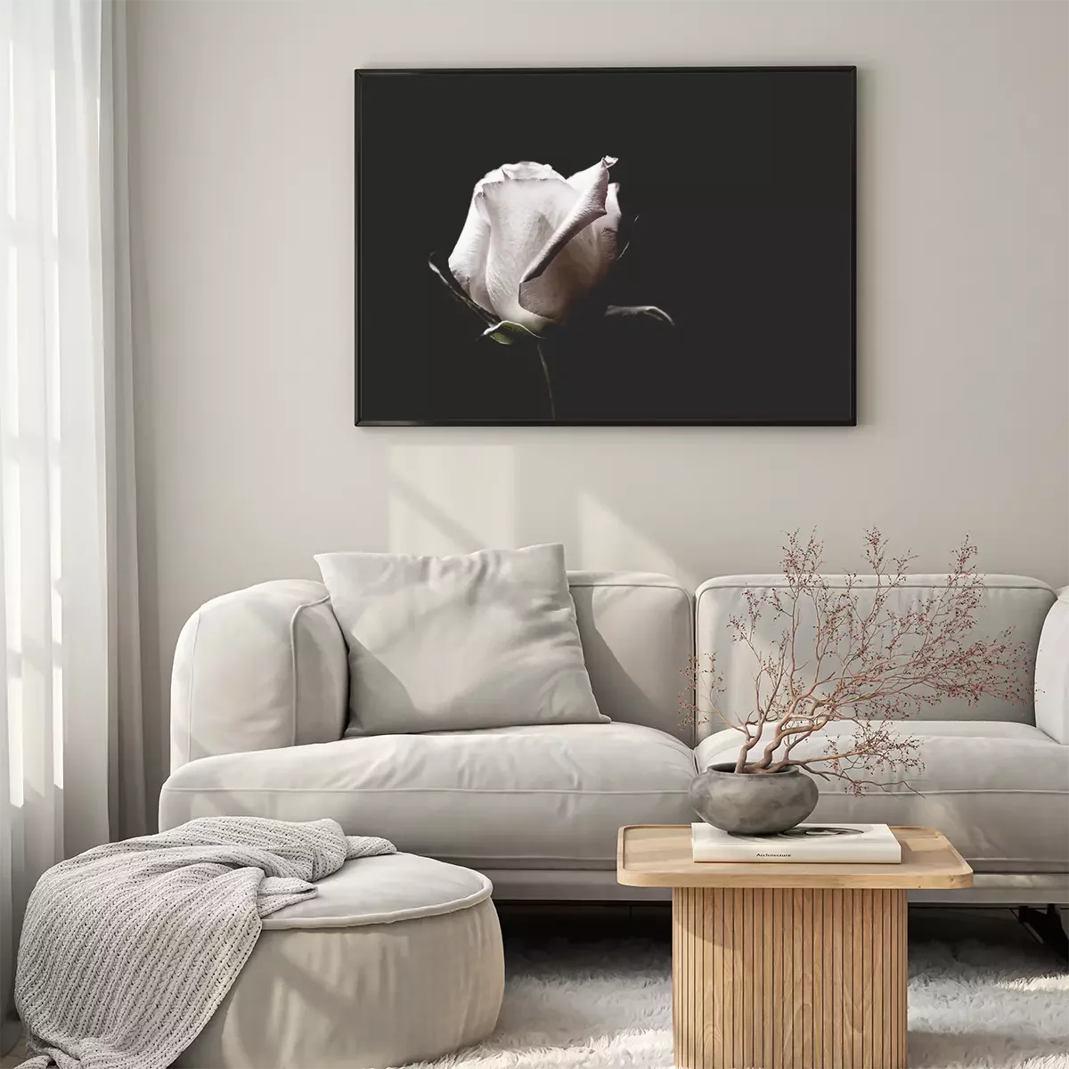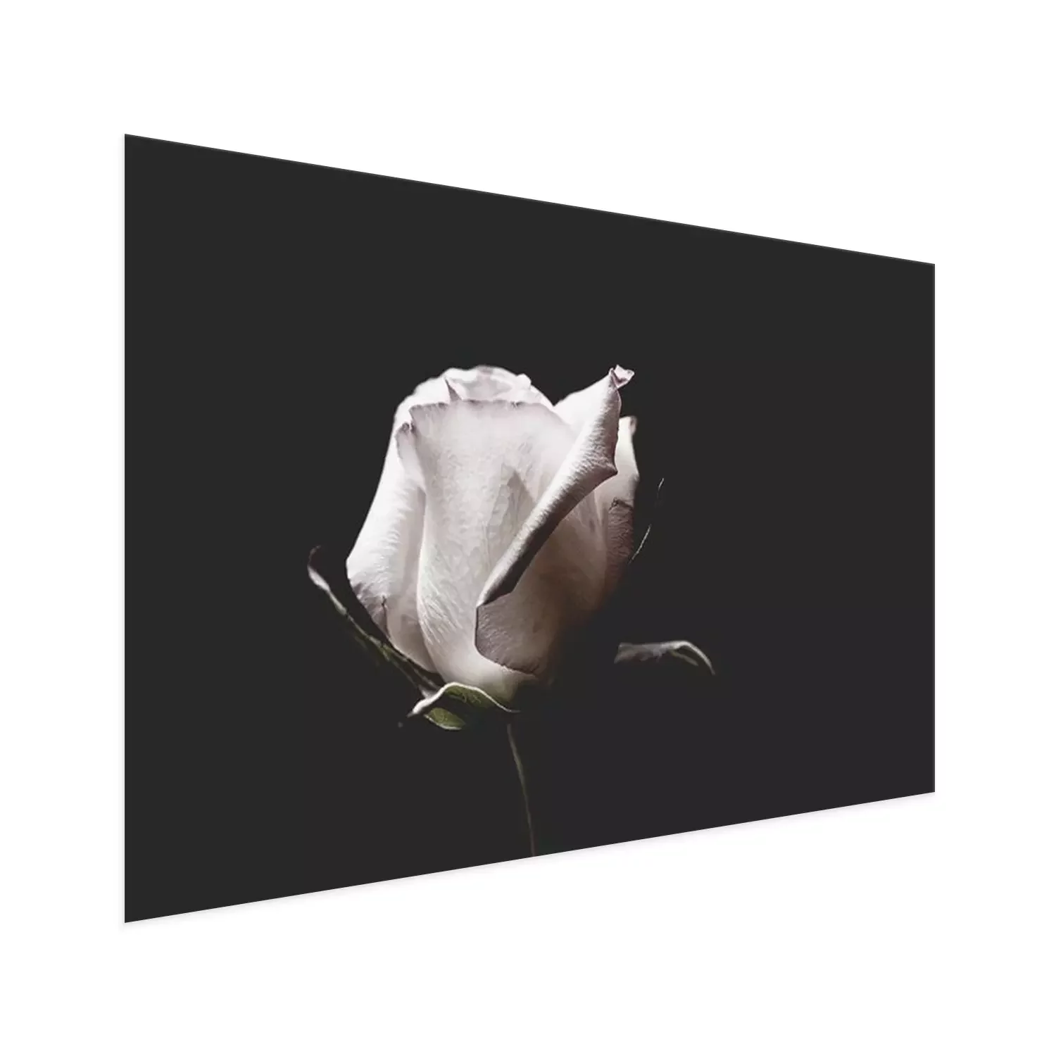 Poster: Weiße Rose, die die Tiefe des Schwarz freilegt