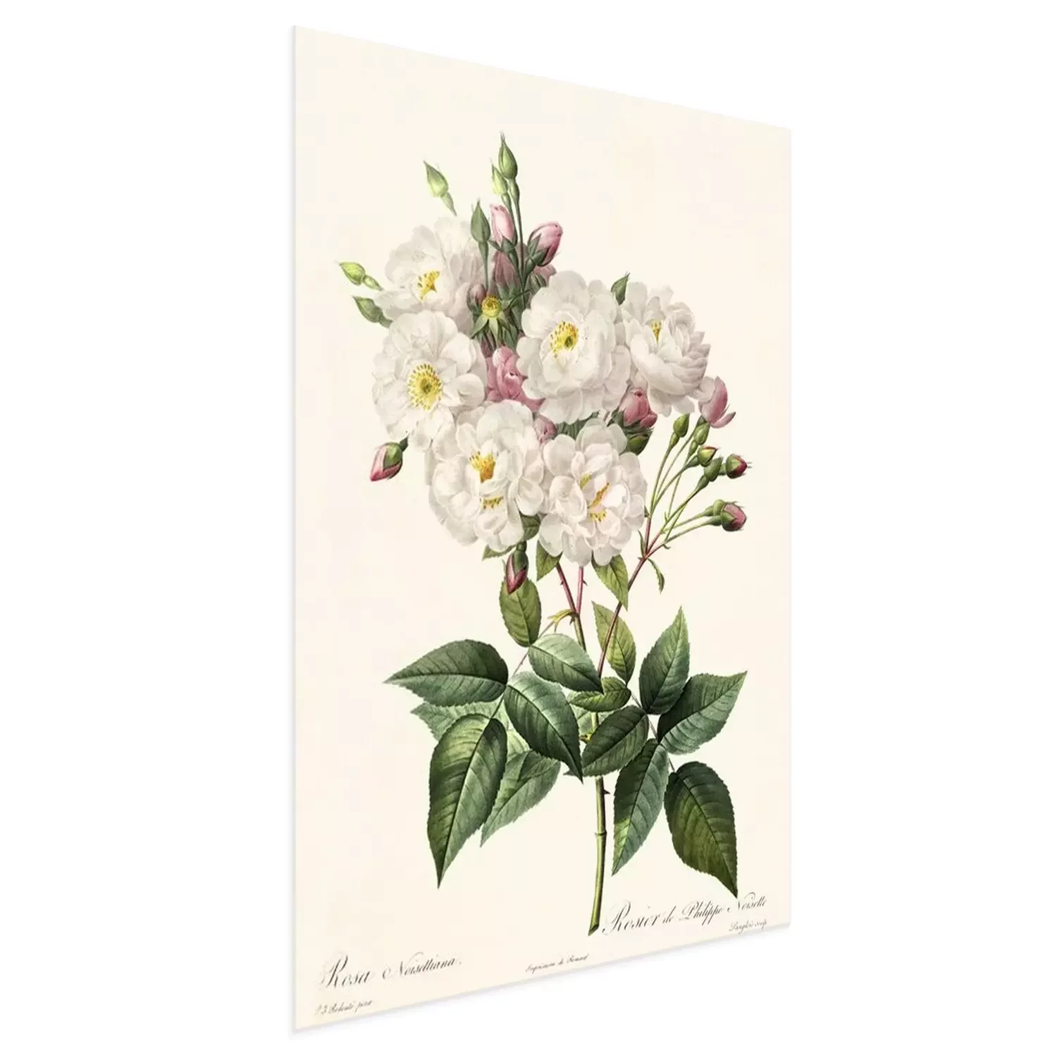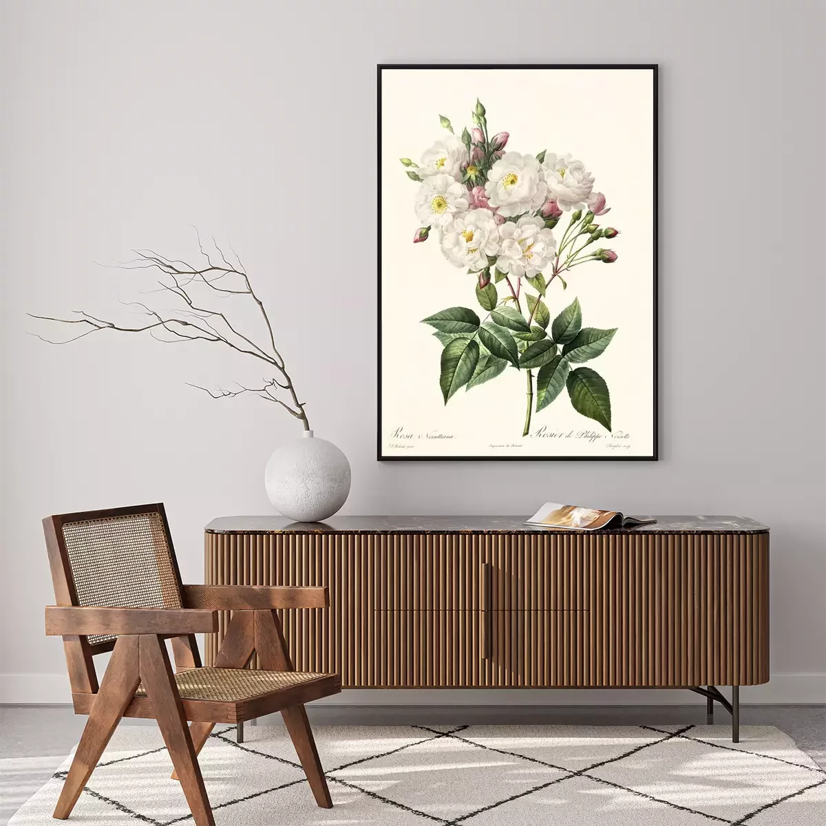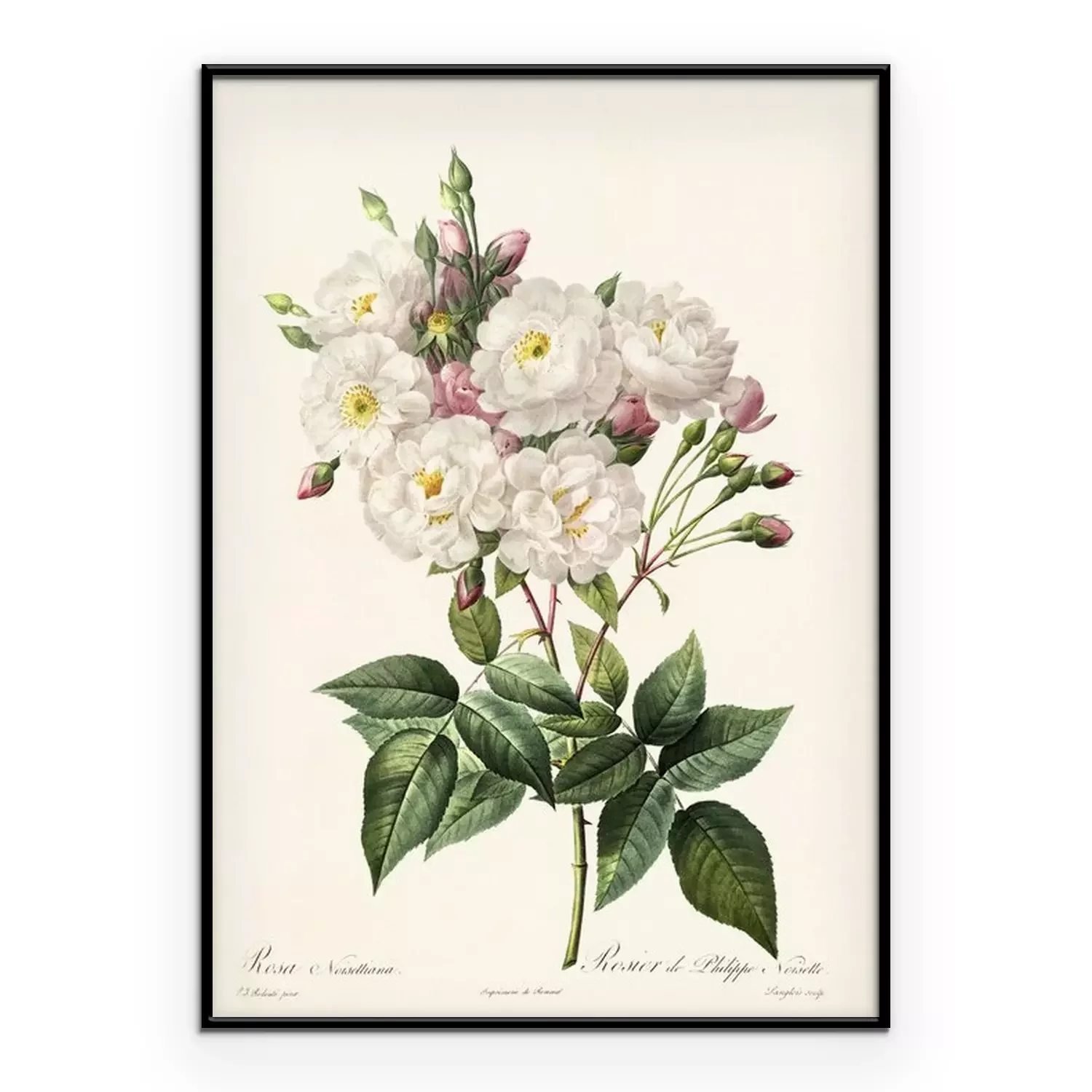 Botanische Grafik der weißen Rose mit Beschreibungen