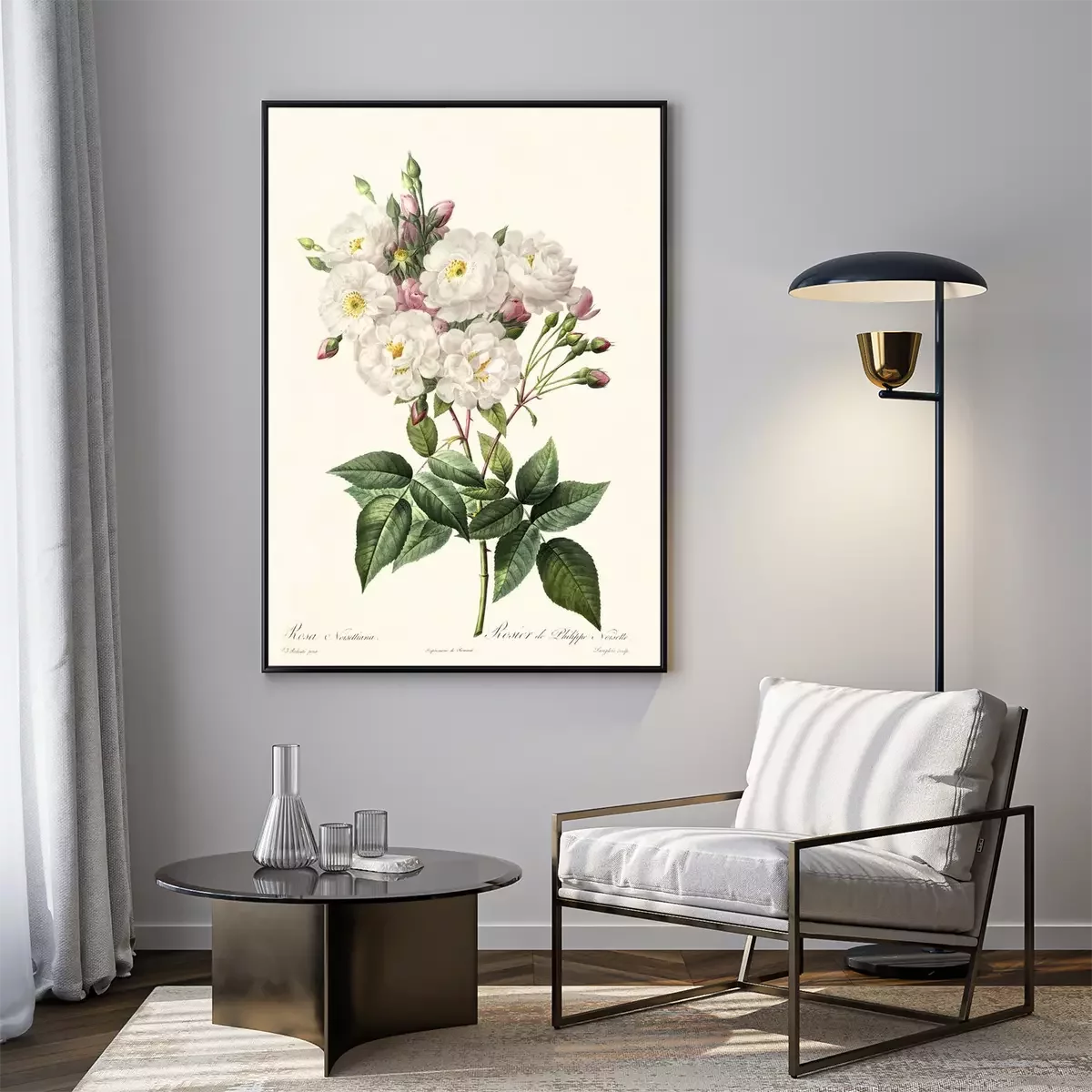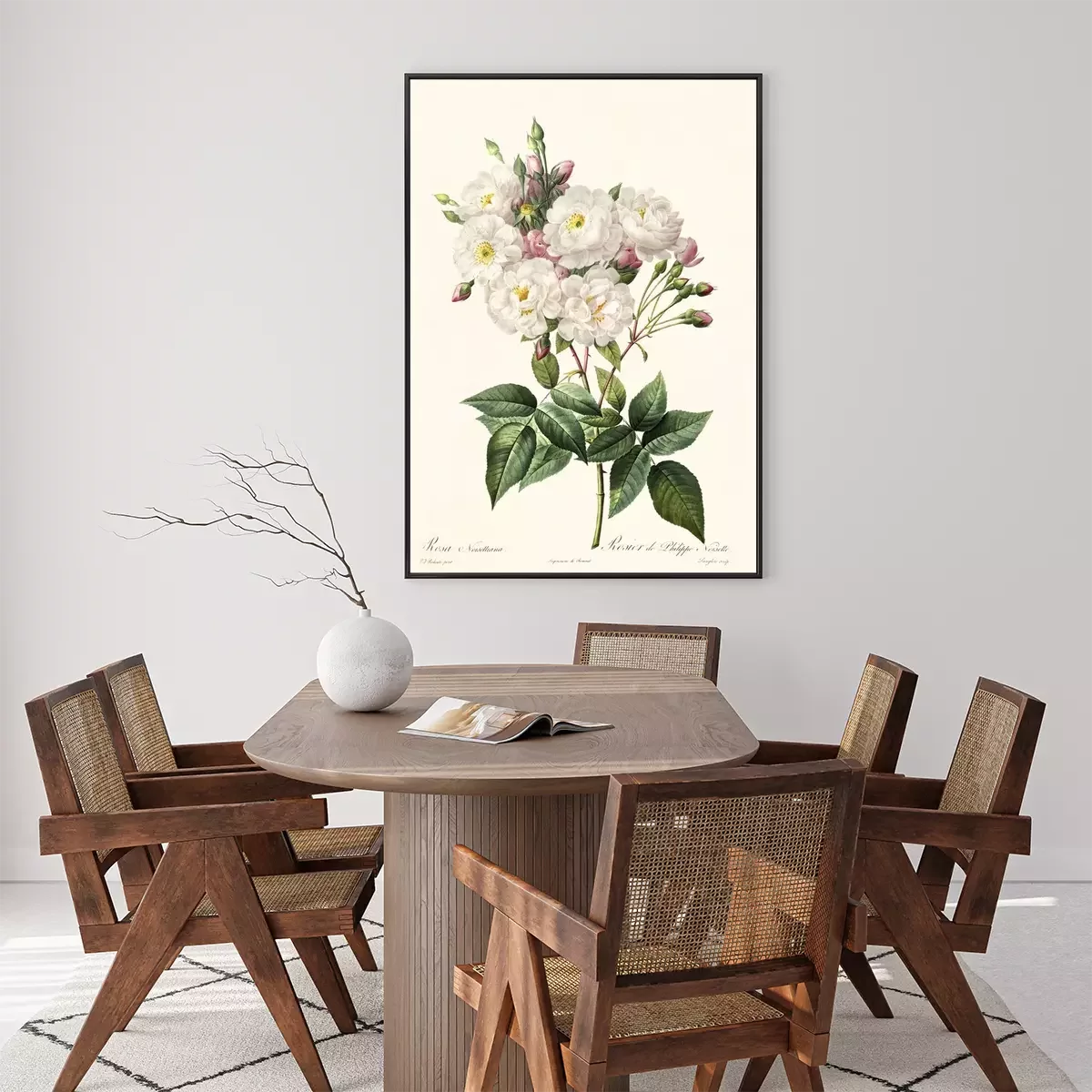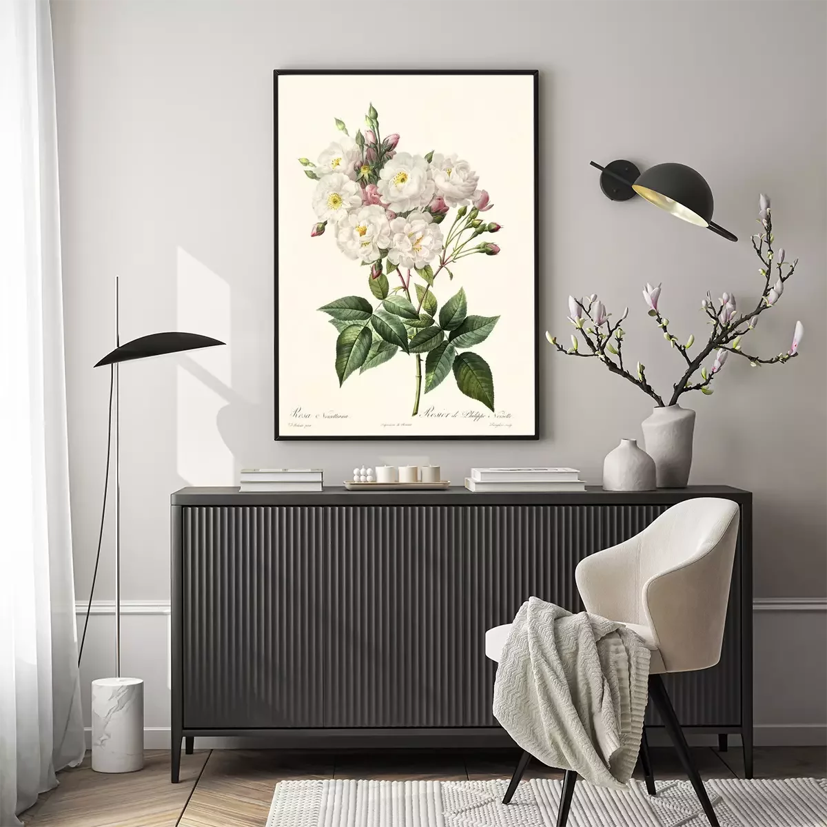Botanische Grafik der weißen Rose mit Beschreibungen