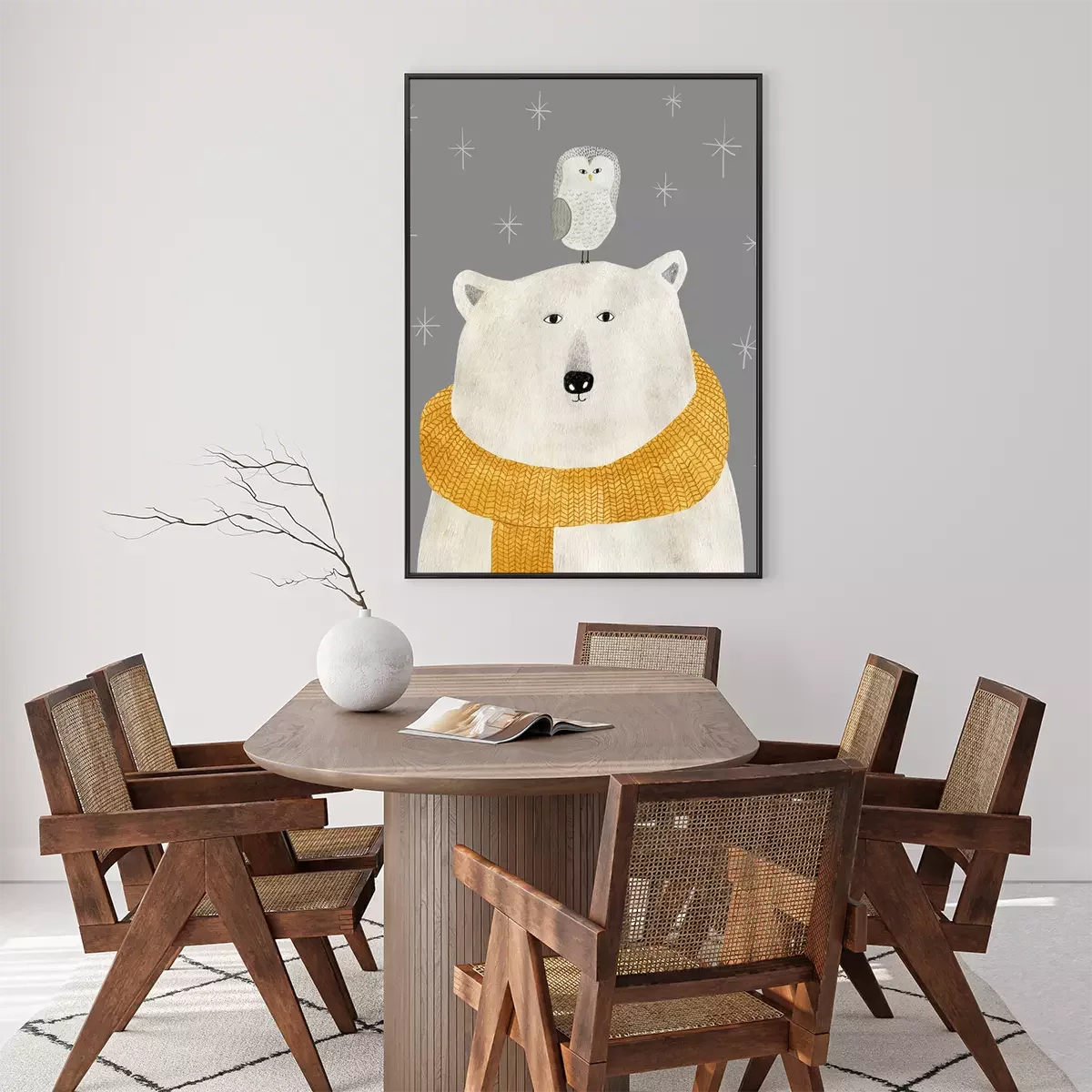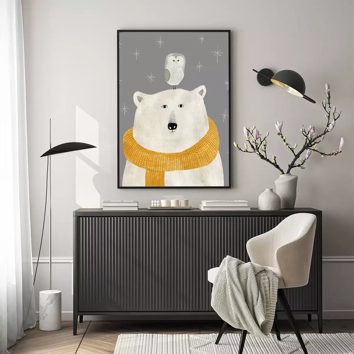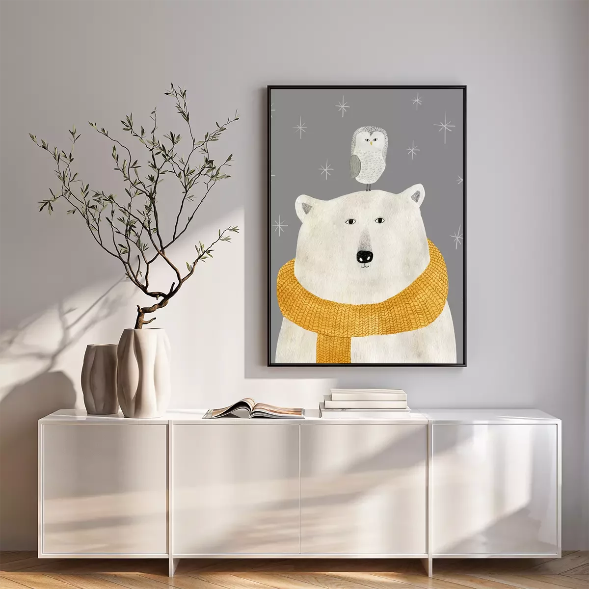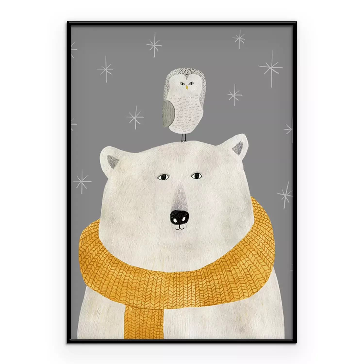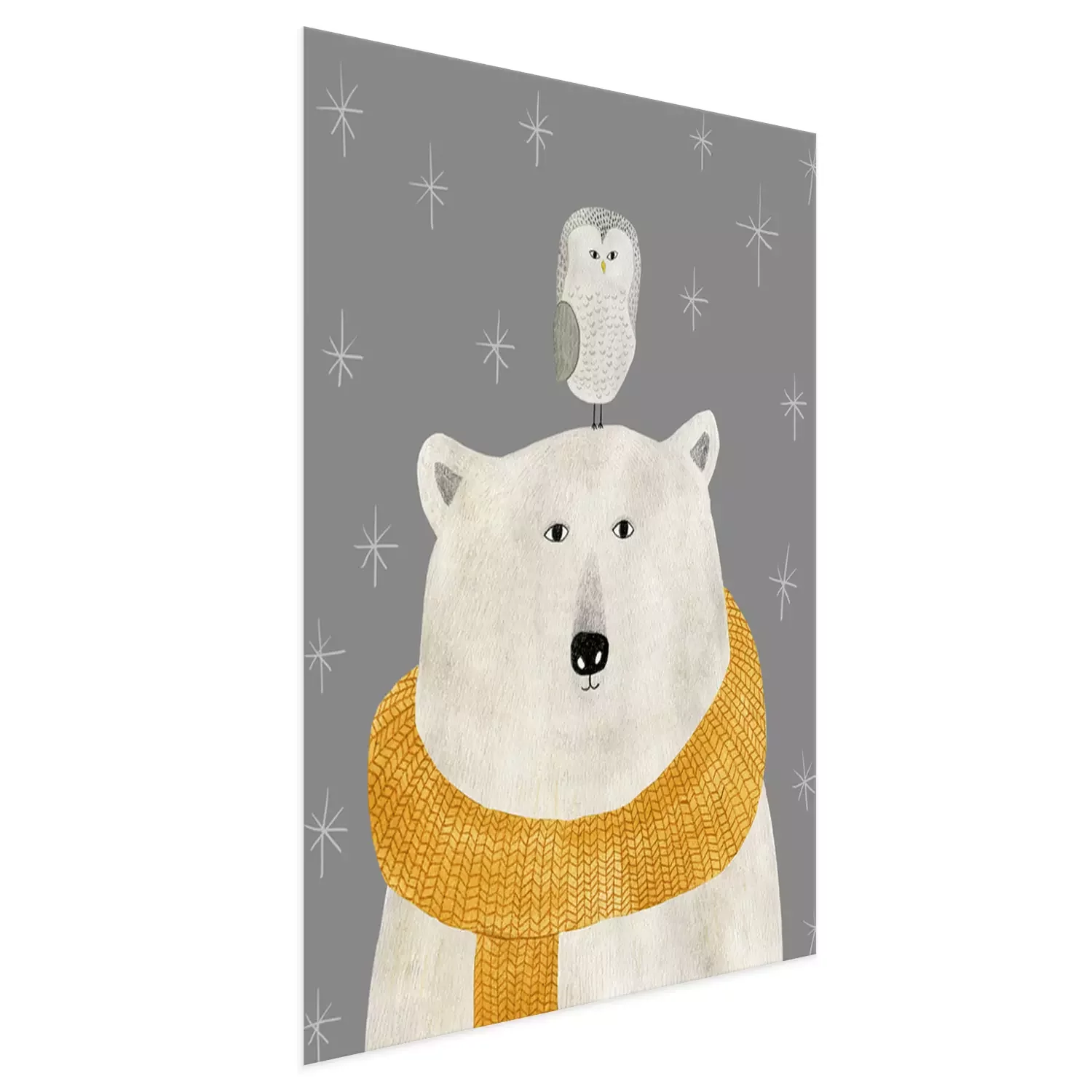 Poster: Weißer Bär mit einer Eule auf dem Kopf