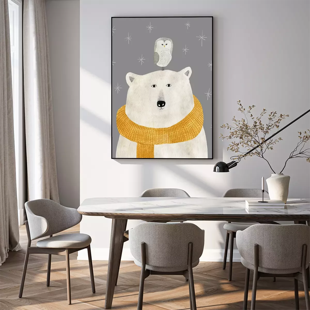 Poster Weißer Bär mit einer Eule auf dem Kopf
