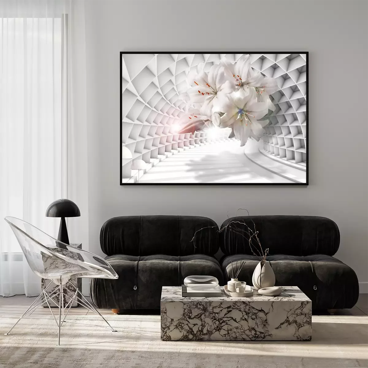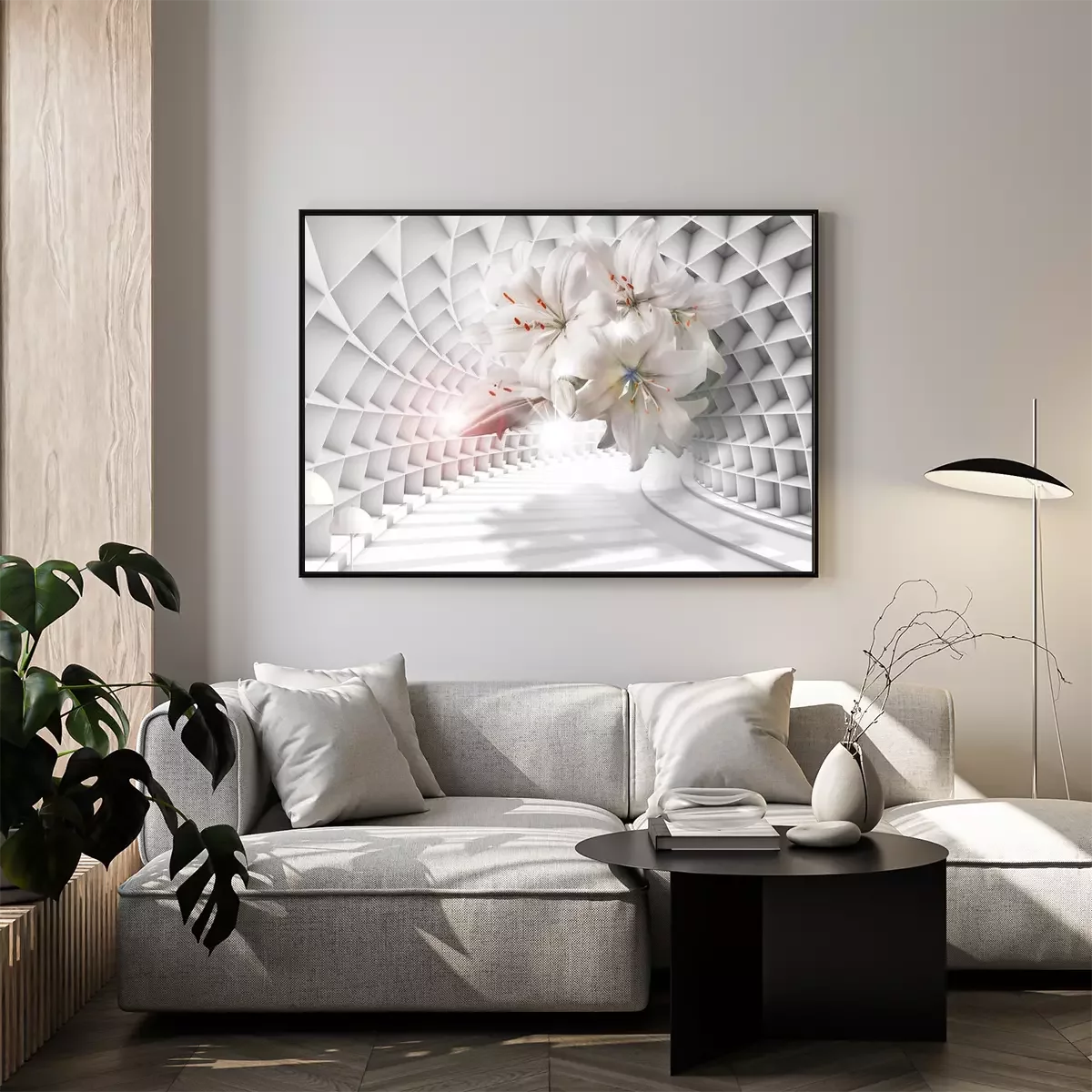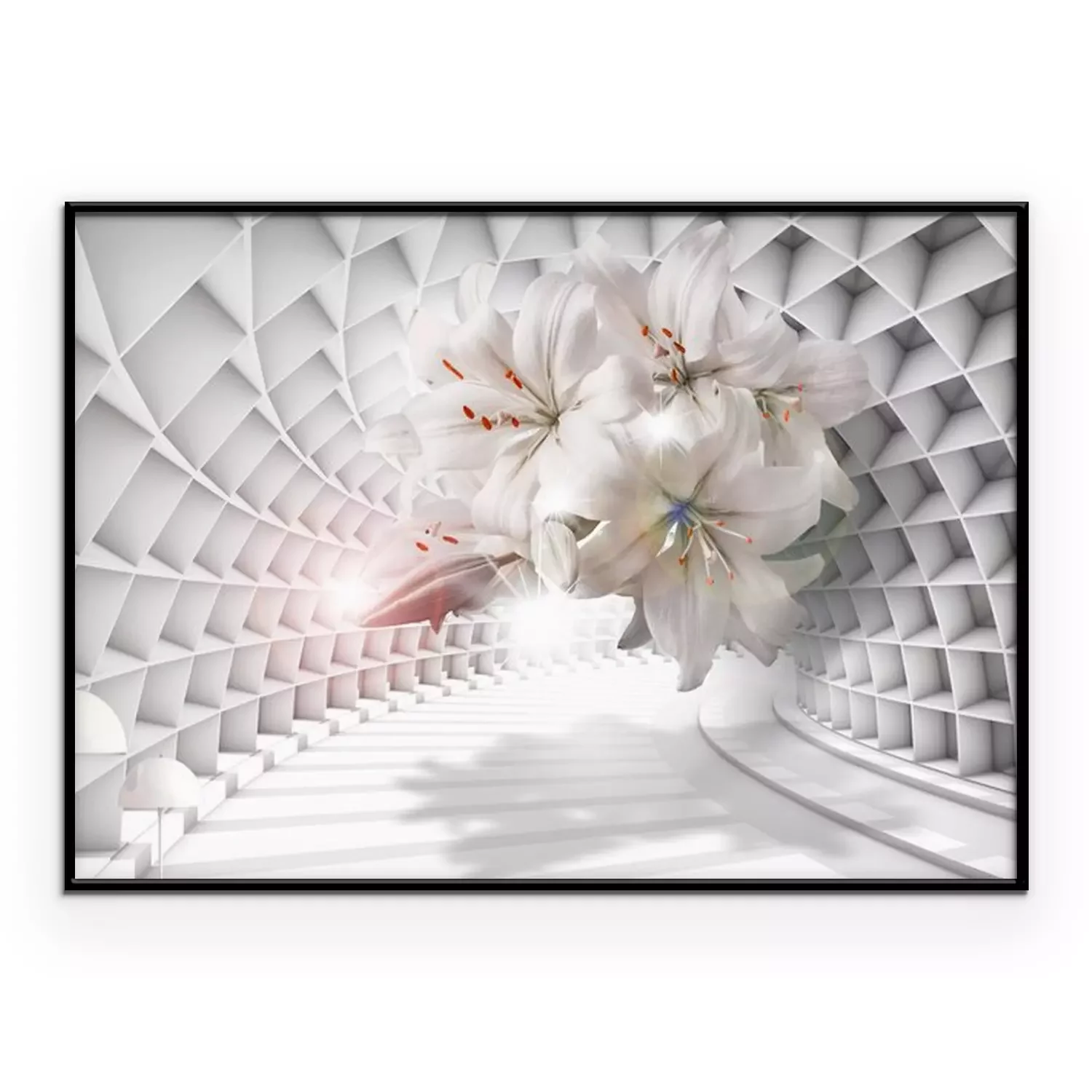 Poster: Weißer gewundener Korridor mit Blumen 3d
