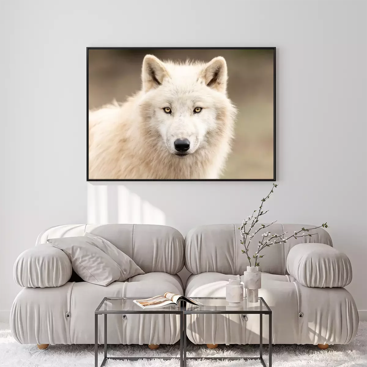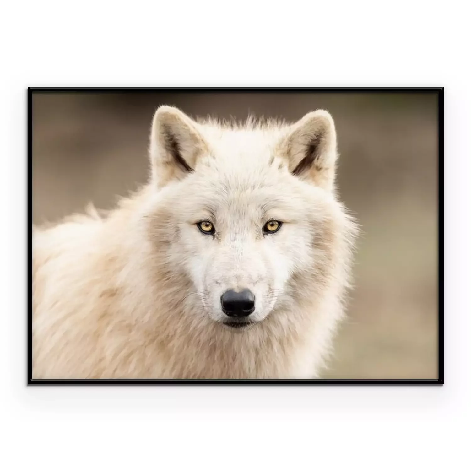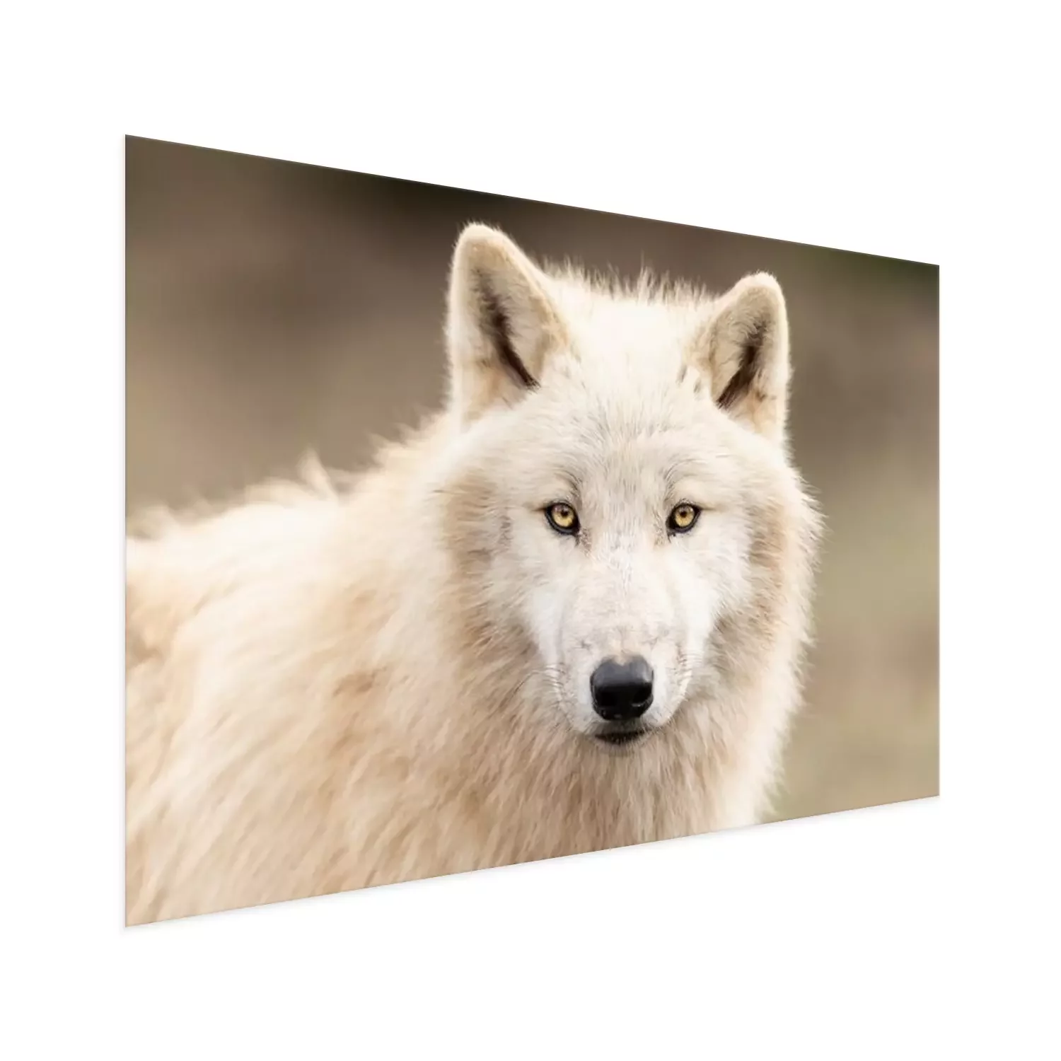 Poster: Weißer Wolf auf verschwommenem Hintergrund