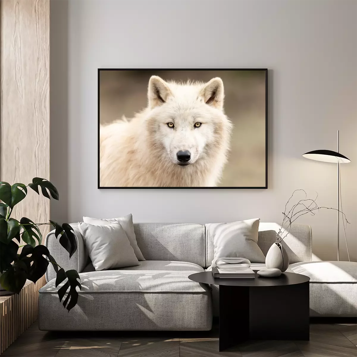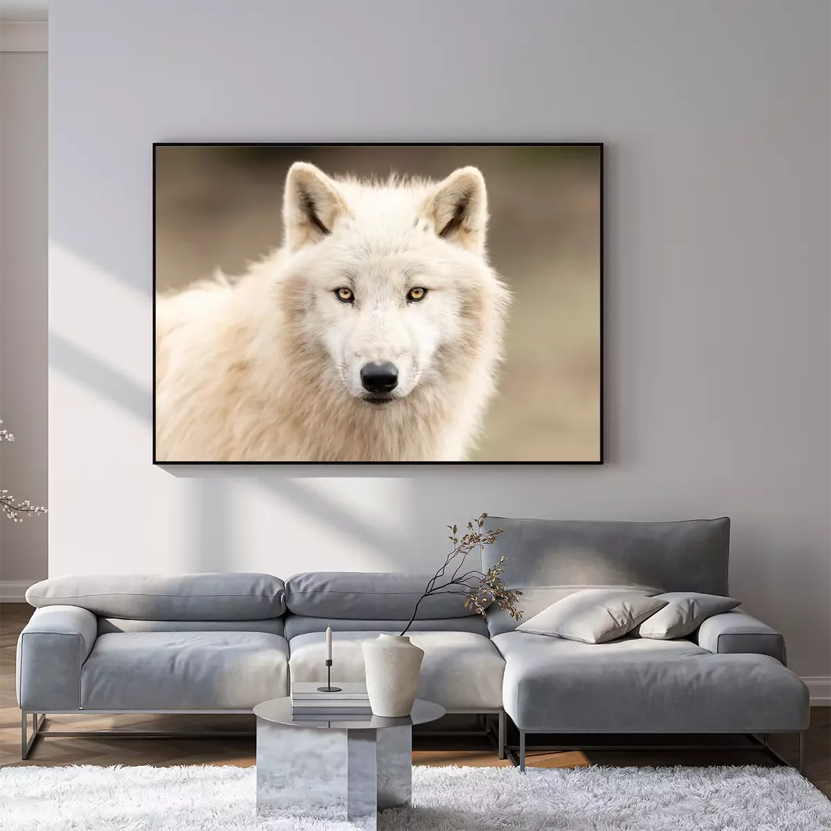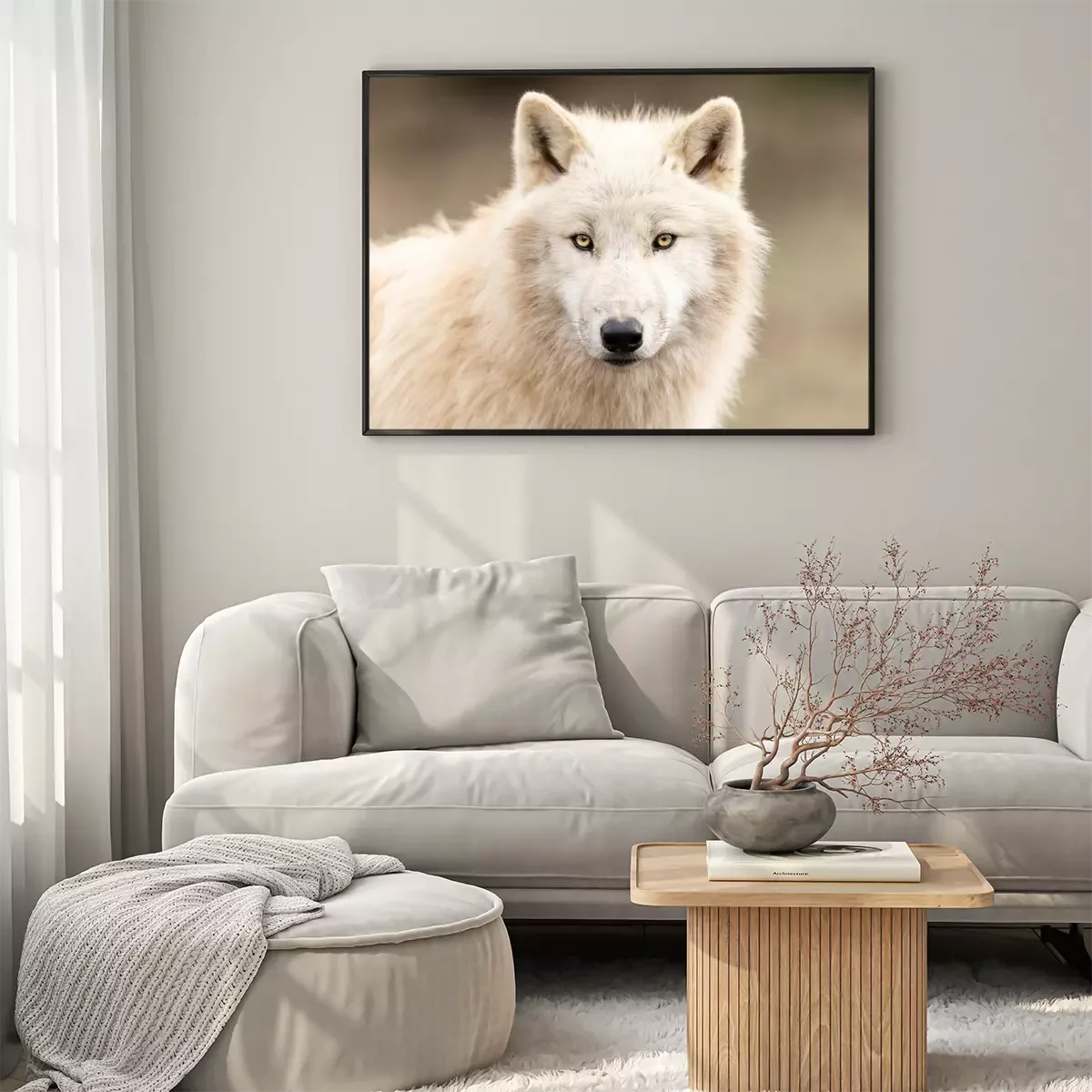 Poster: Weißer Wolf auf verschwommenem Hintergrund