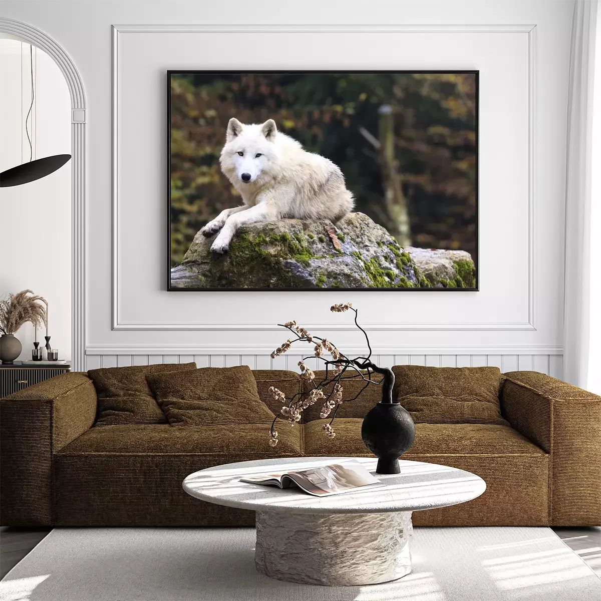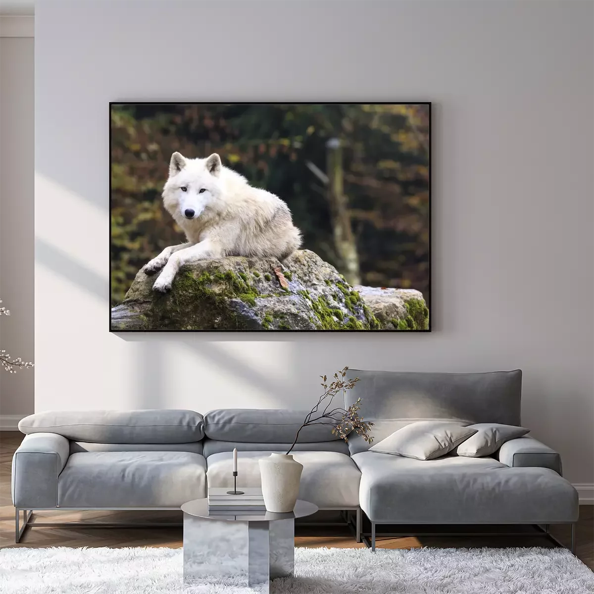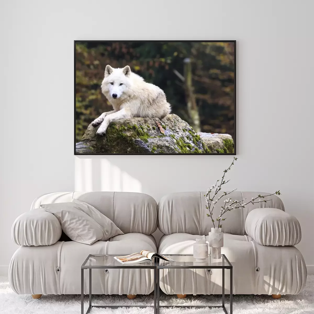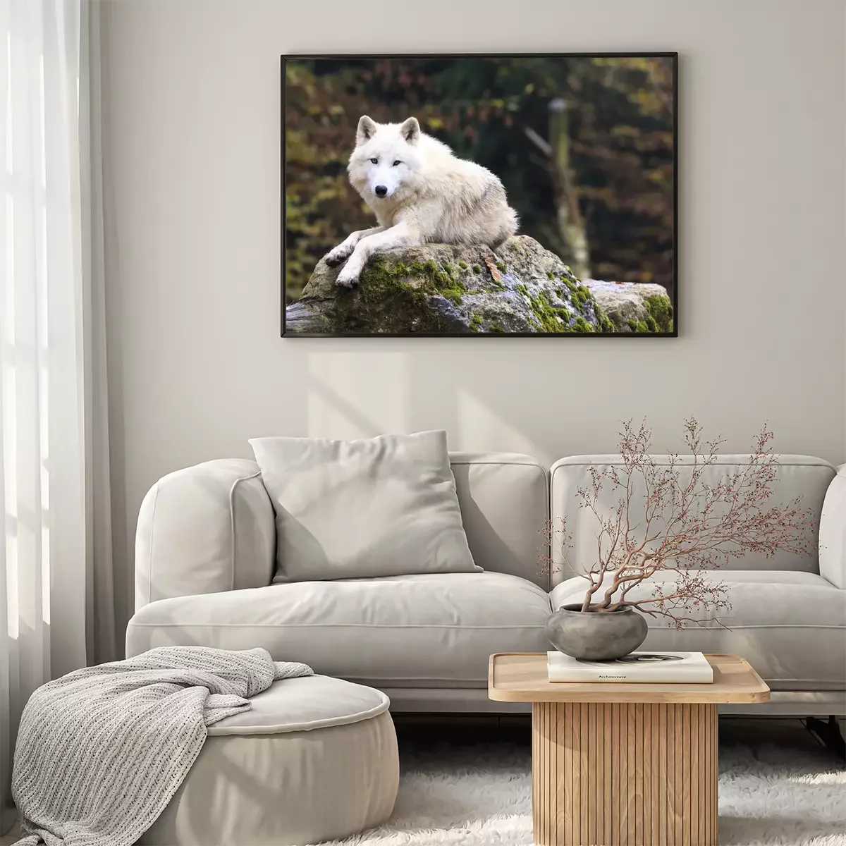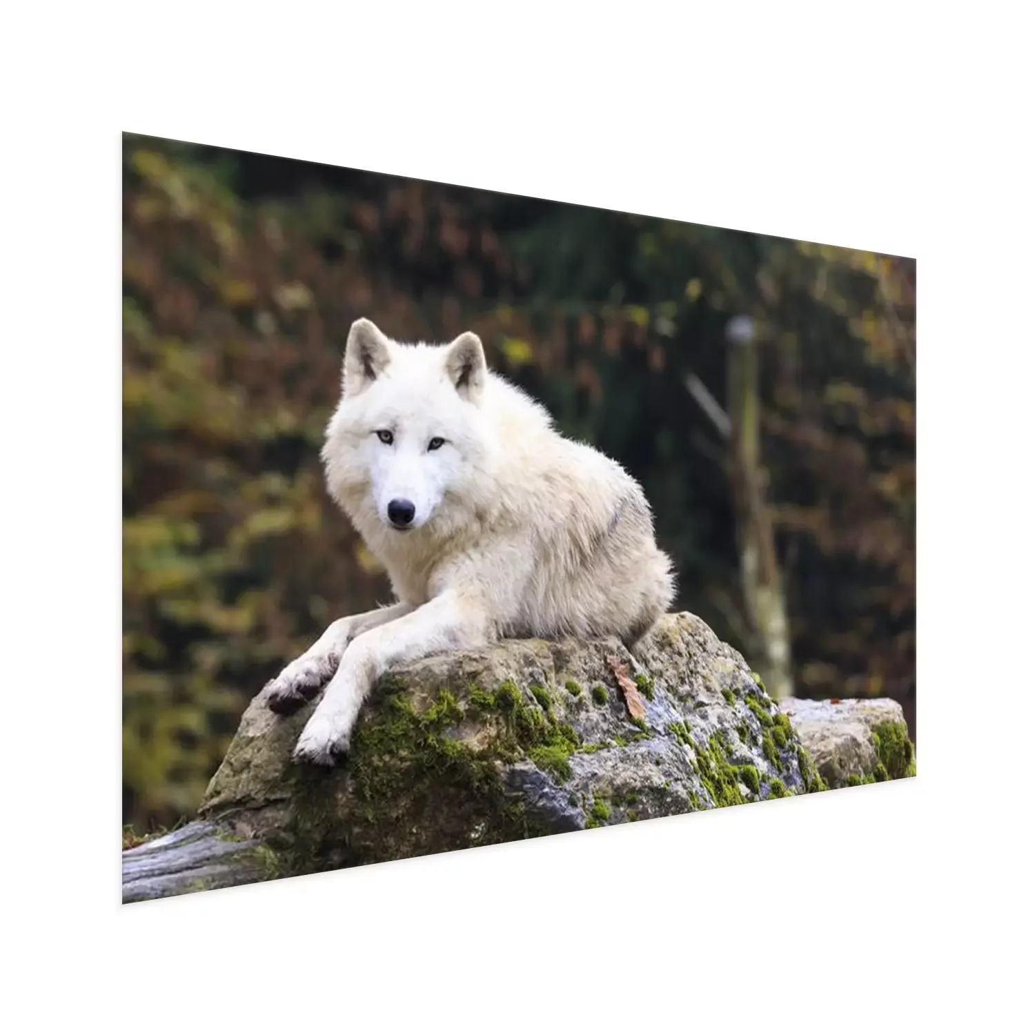 Poster: Weißer Wolf ruhend auf einem Felsen