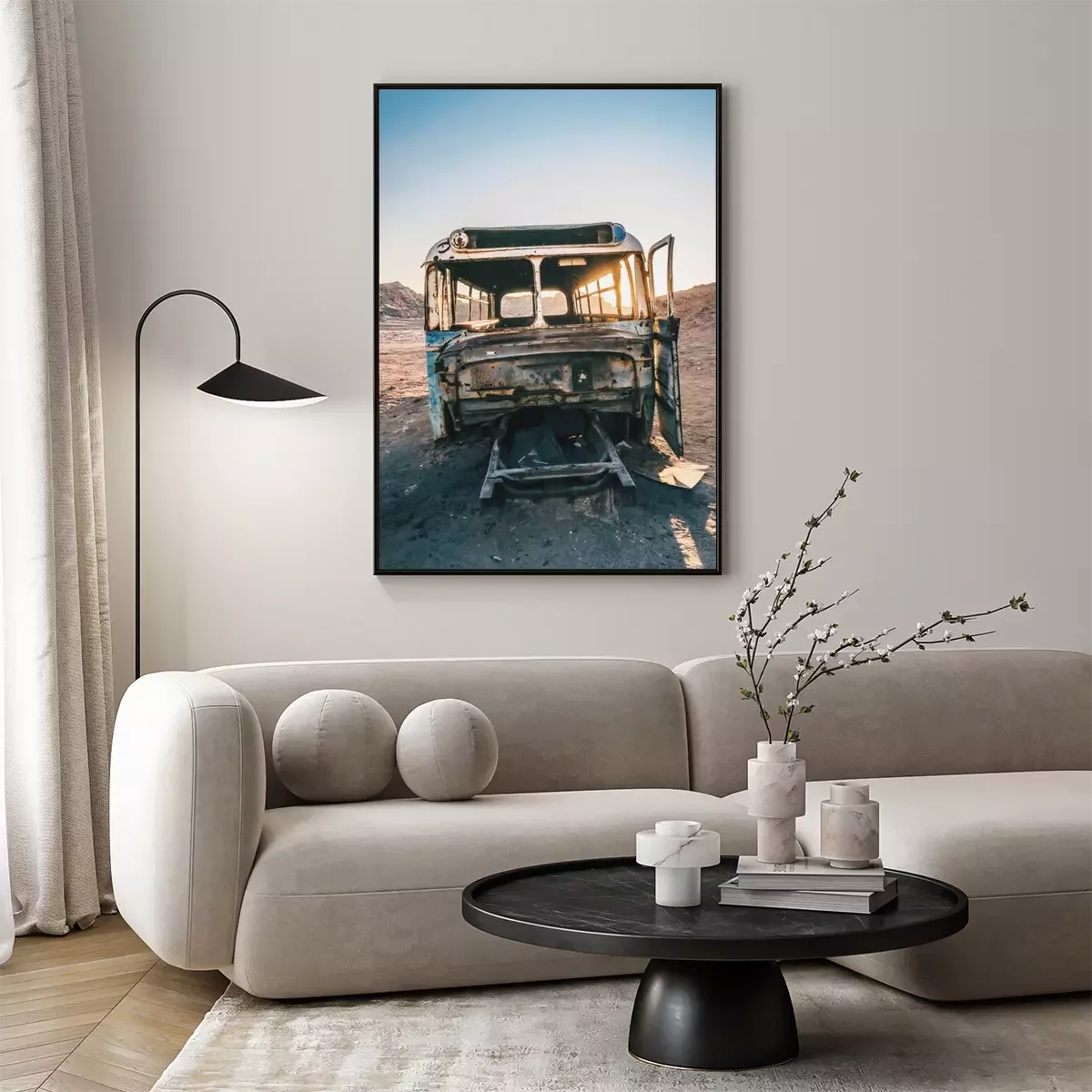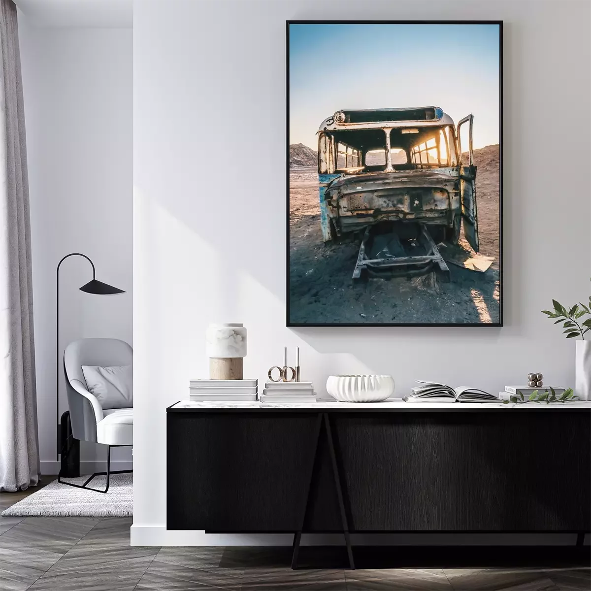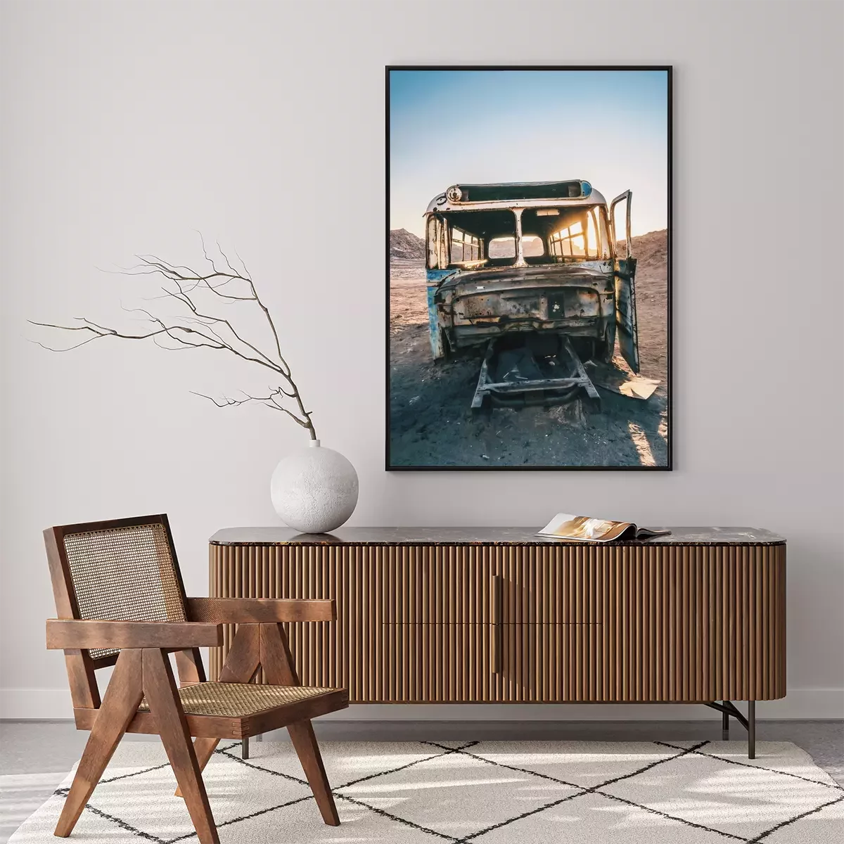 Poster Wüste mit einem Autowrack