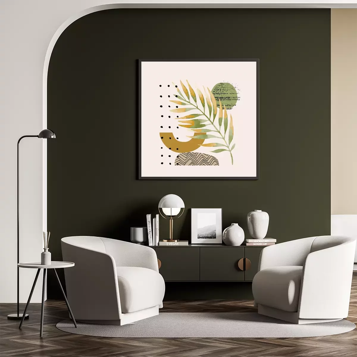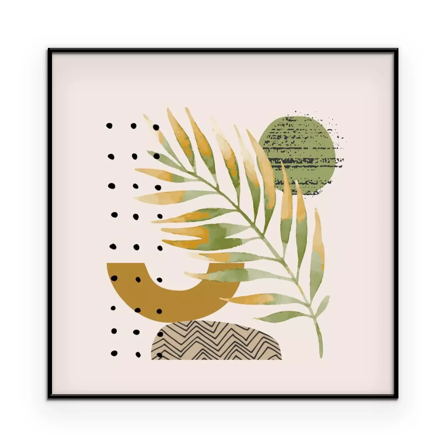 Tropical watercolor leaves, turned edge geometric shapes, terrazzo flooring elements collage