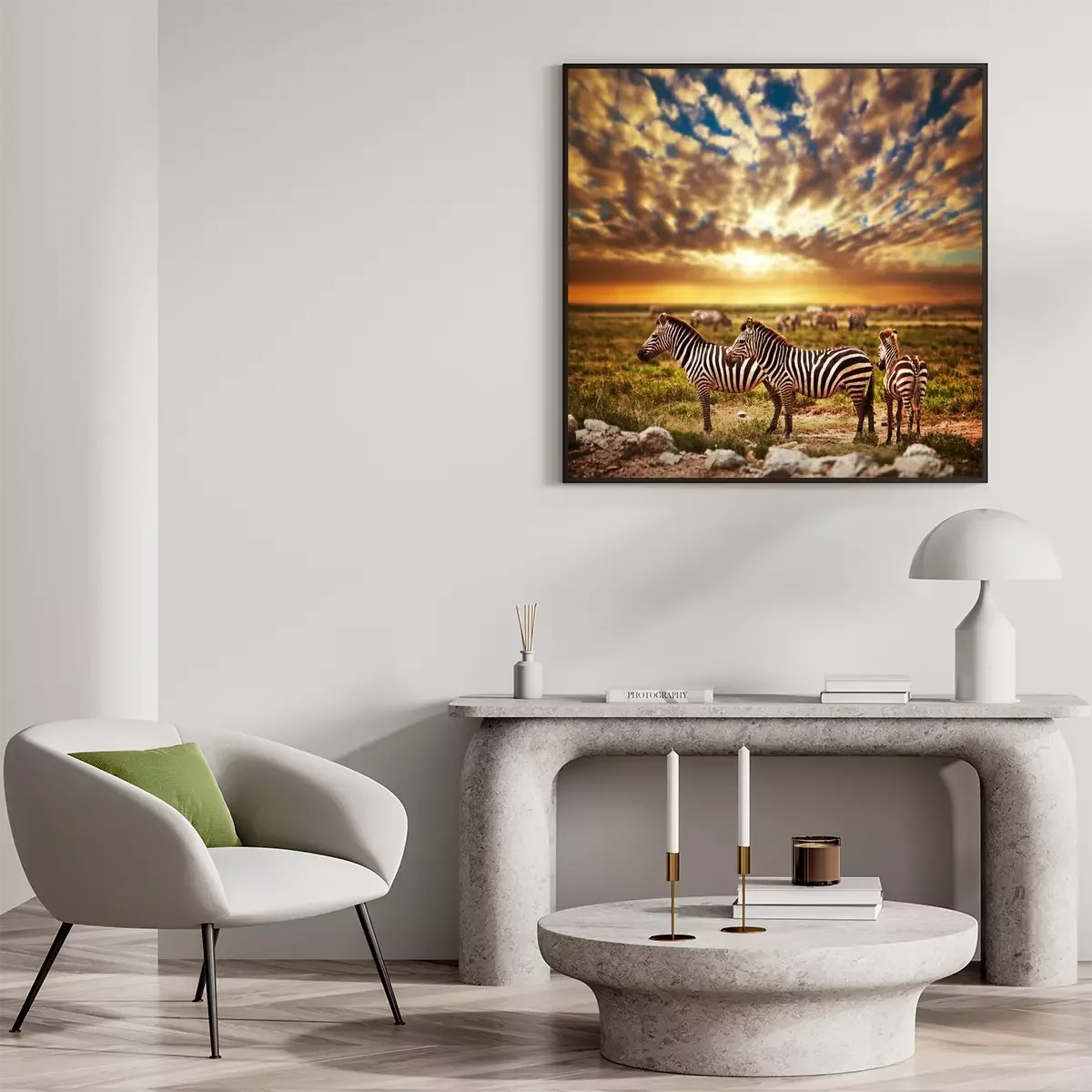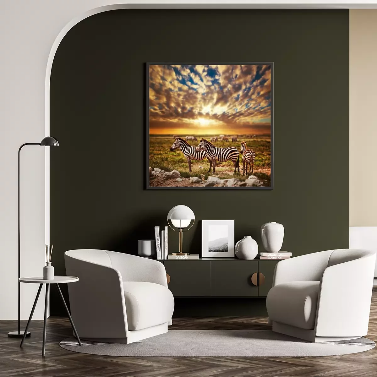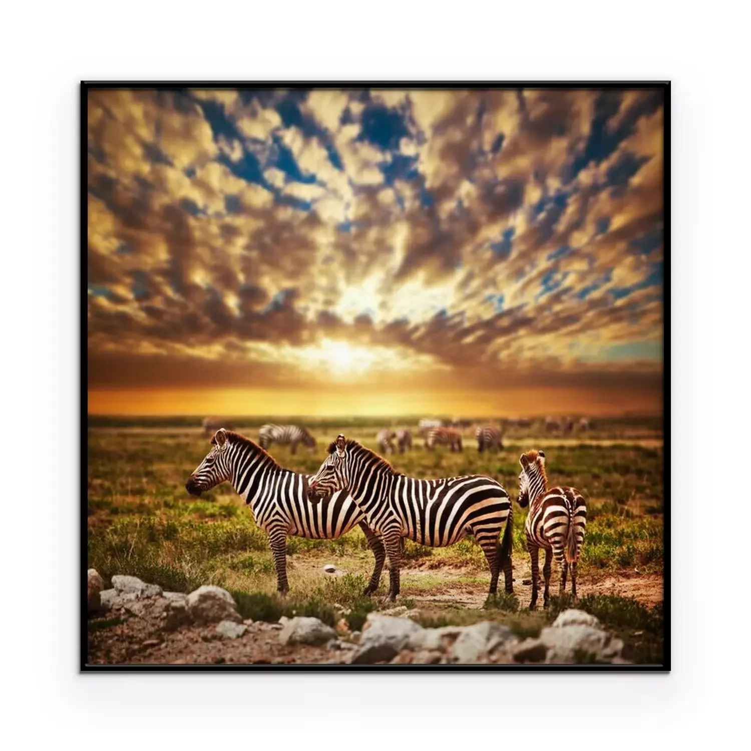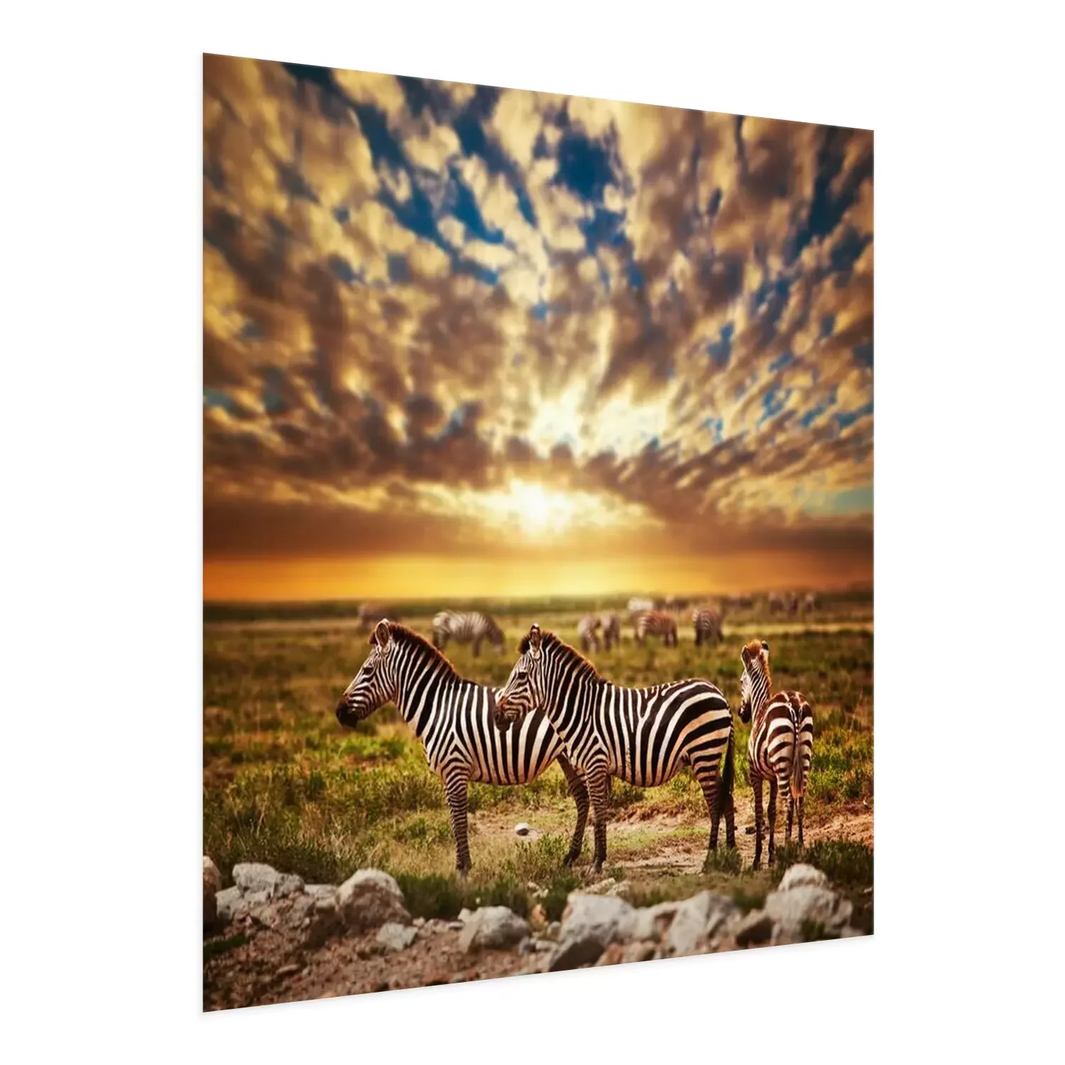 Poster: Zebras in der Serengeti vor dem Hintergrund eines Sonnenuntergangs