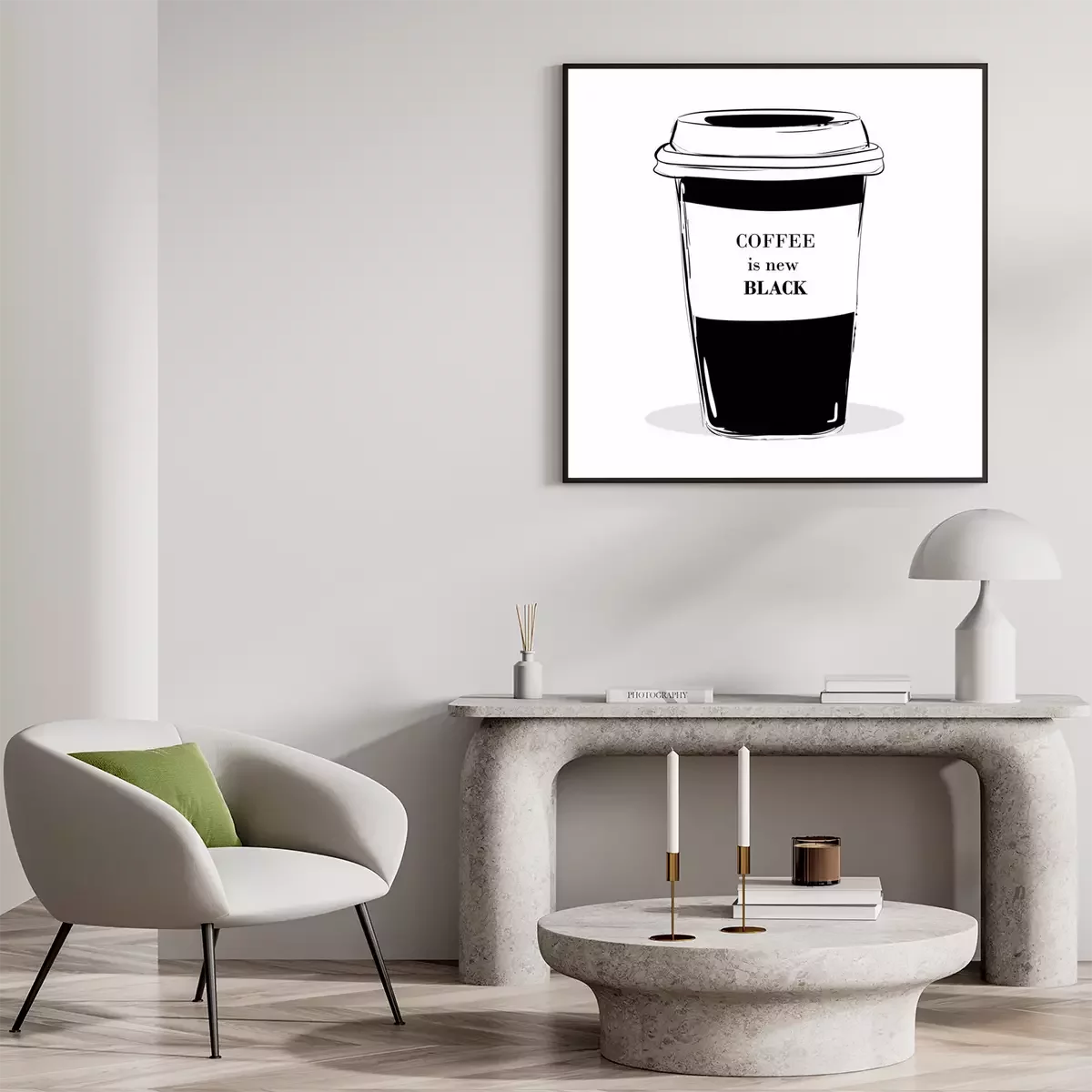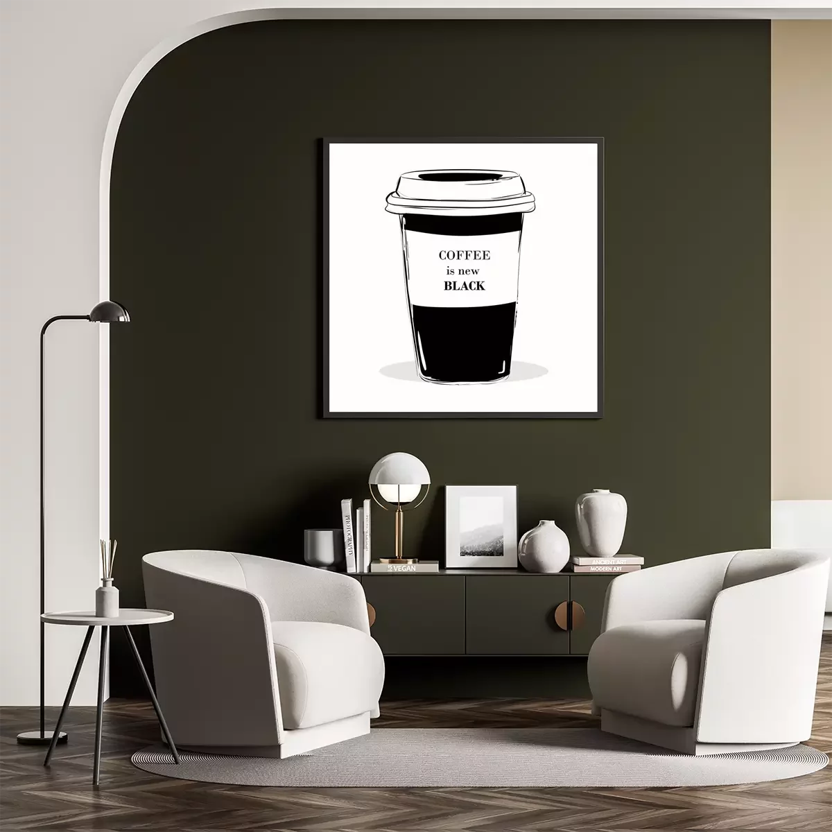 Poster: Zitat Beschriftung auf Kaffee schwarze Tasse. Kaffee ist neu schwarz Kalligraphie Stil Kaffee Zitat. Coffee Shop Promotion Motivation. Graphische Design-Typografie. Hand gezeichnet Mode Illustration