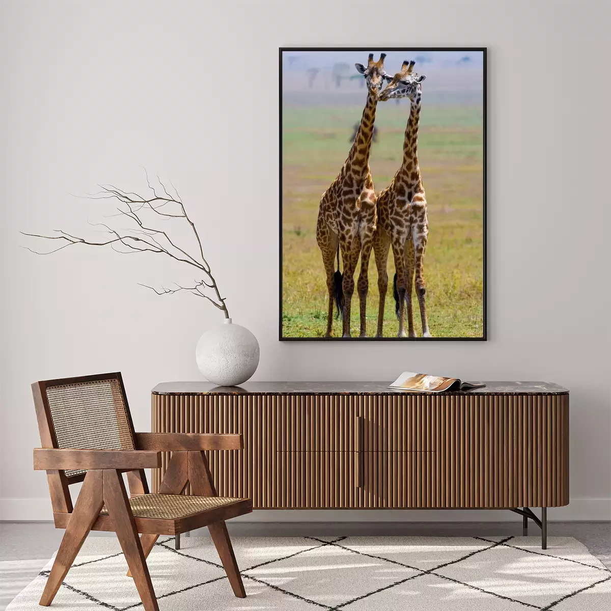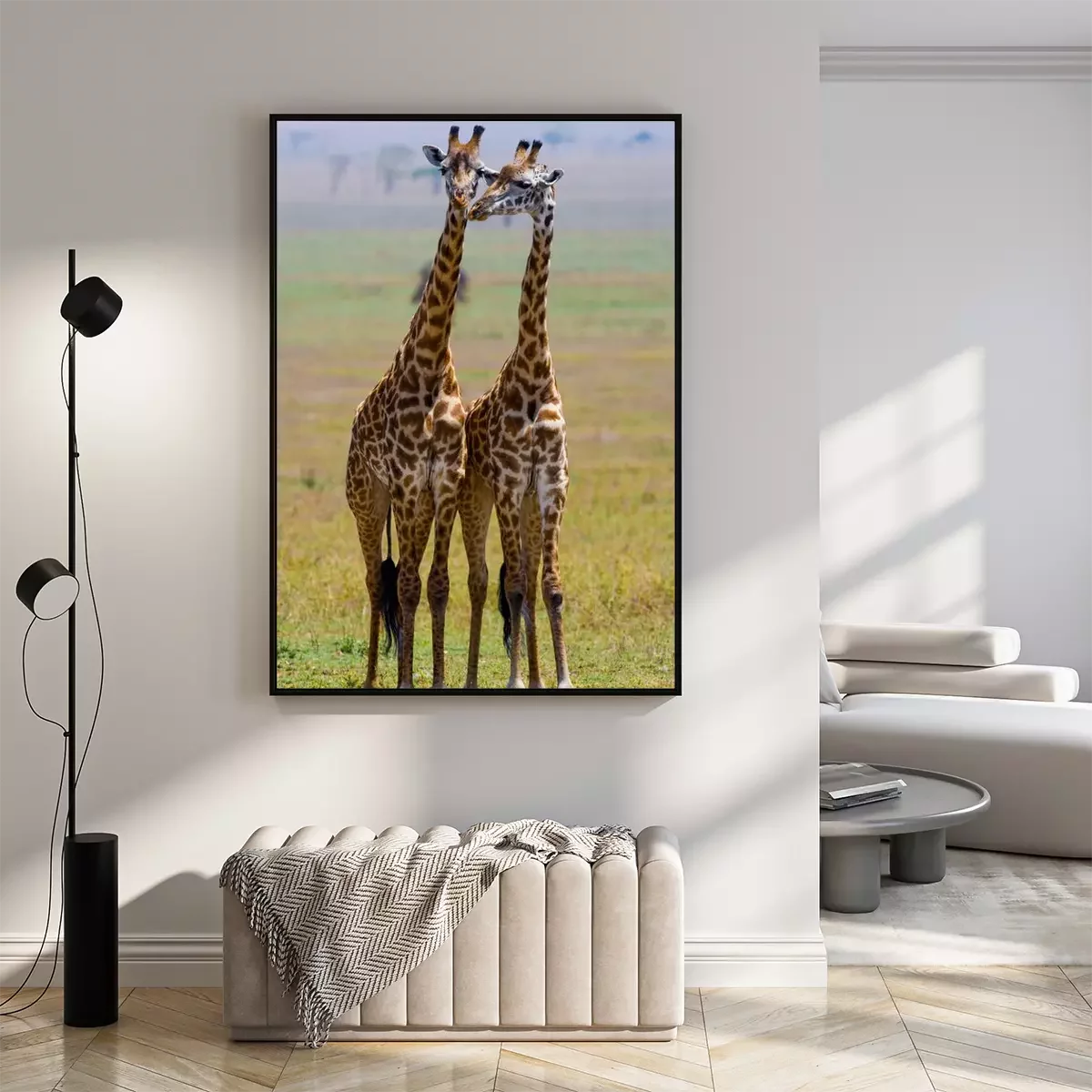 Mama und Baby Giraffe vor dem Hintergrund einer Landschaft