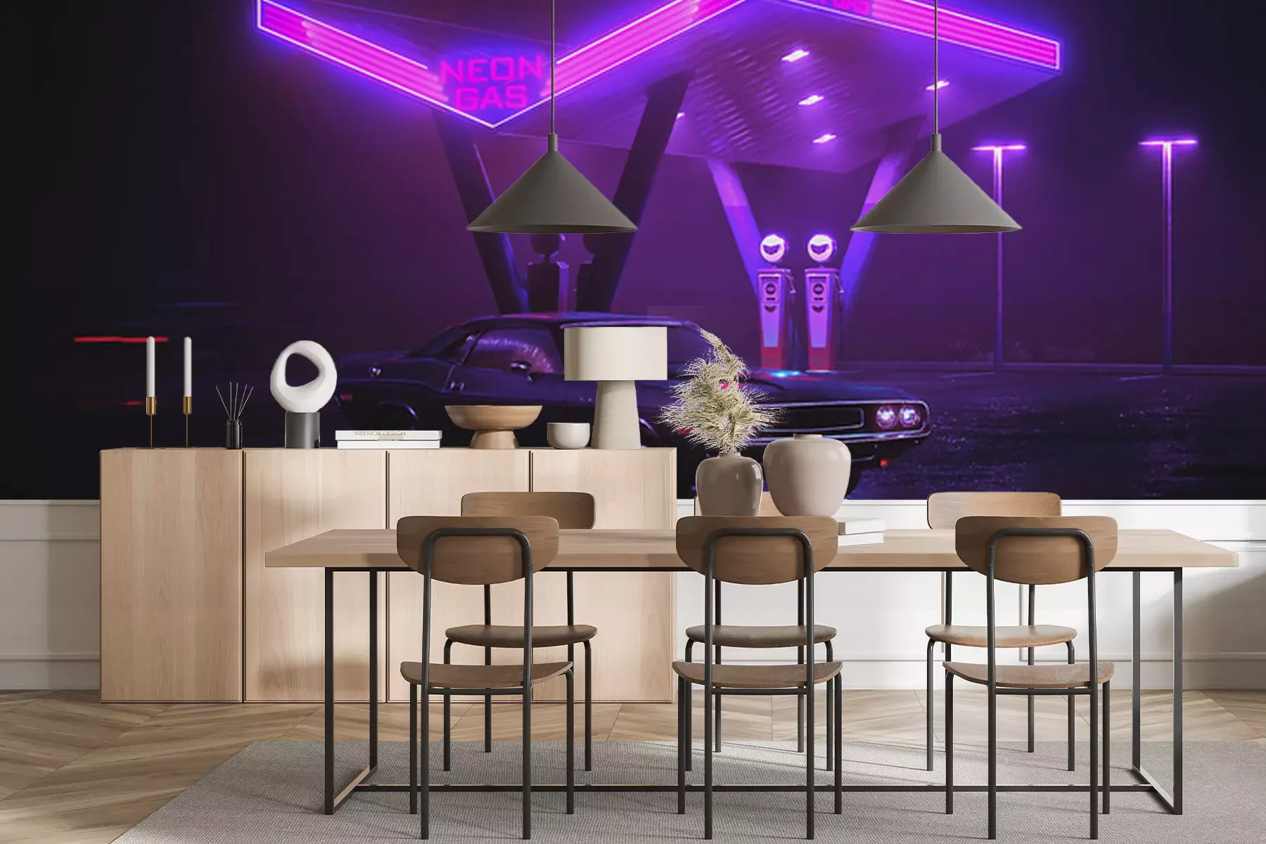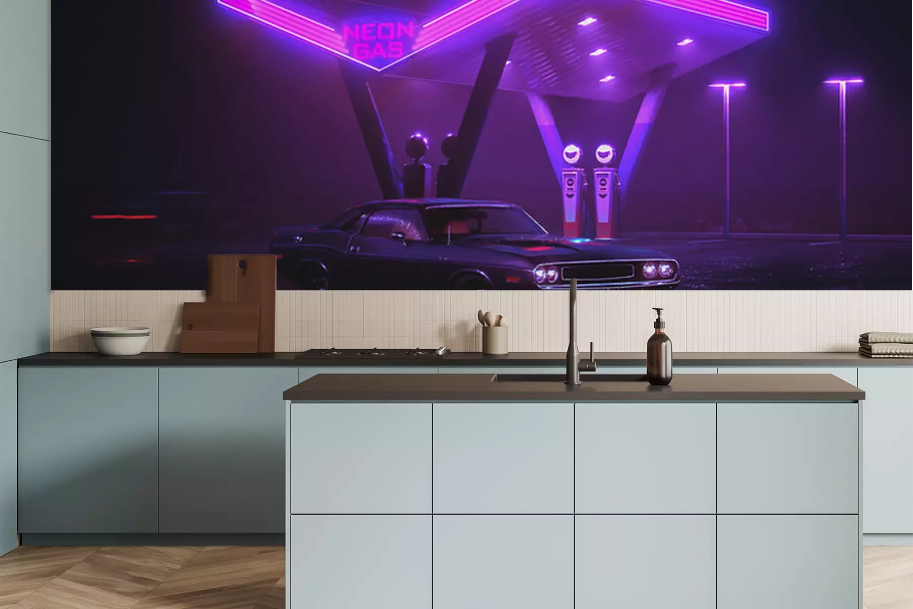 Sticker 3D illustration of retro car and gas station