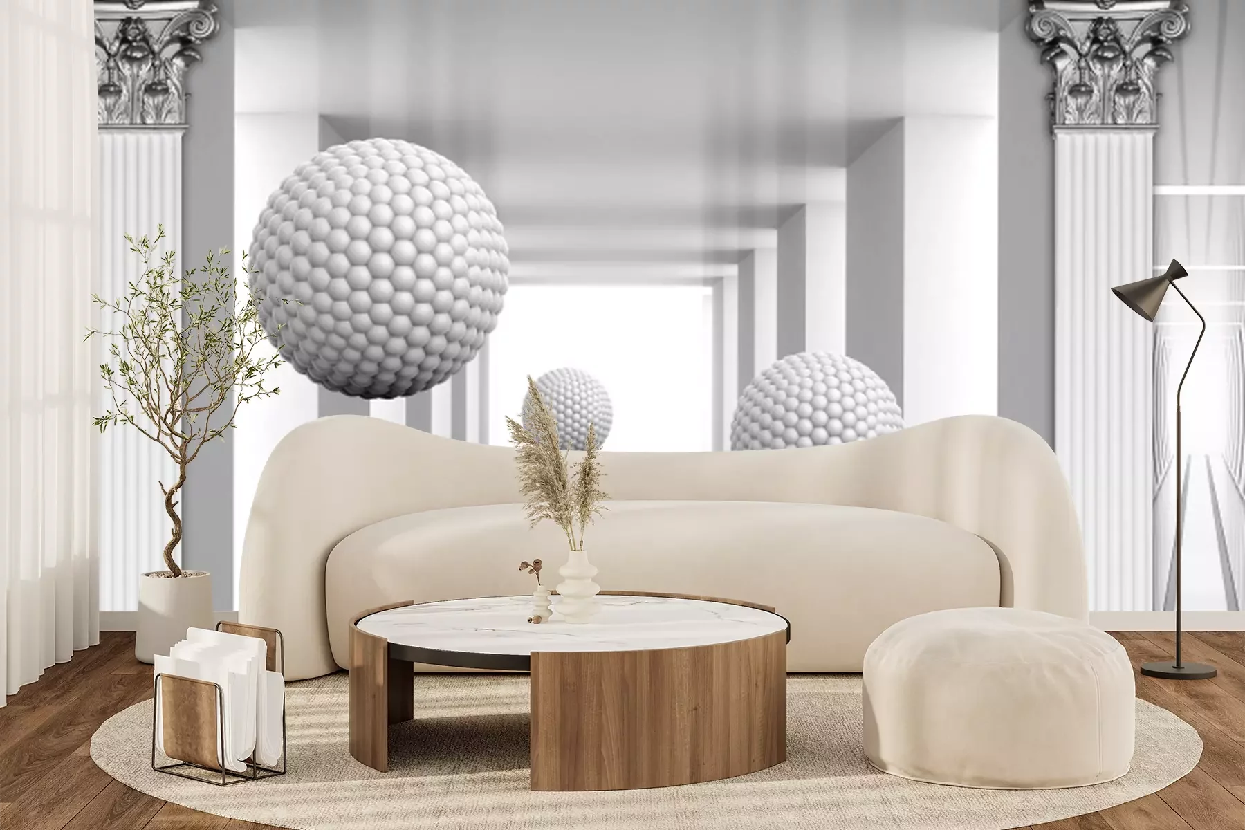Sticker 3d-Kugeln in einem dekorativen grauen Korridor