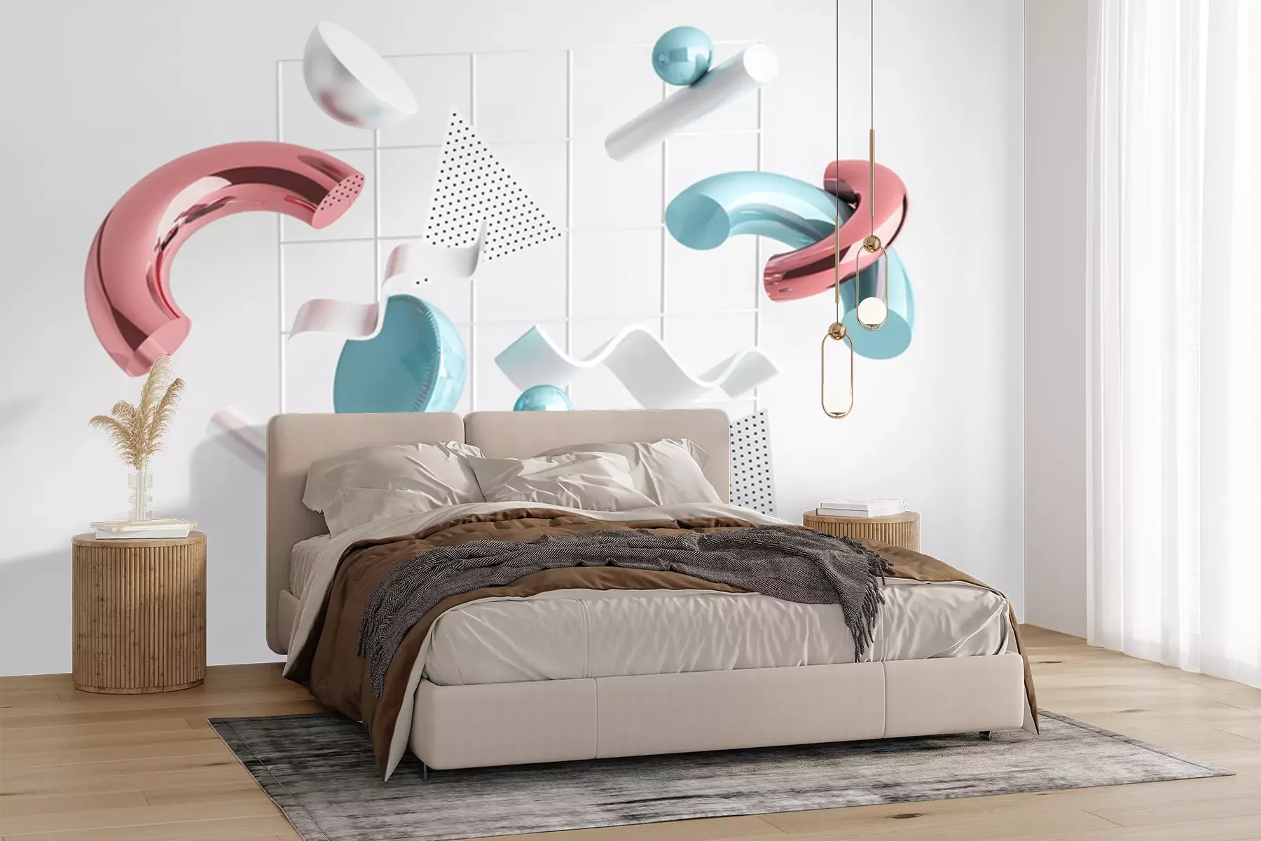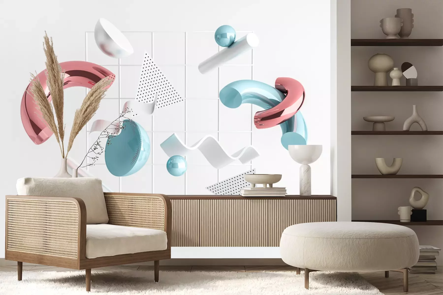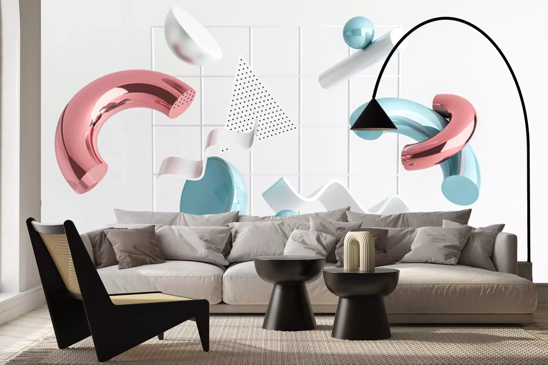 Sticker 3D rendern realistische Grundelementzusammensetzung.  Fliegende Formen in Bewegung lokalisiert auf weißem Hintergrund.  Abstraktes Thema für trendige Designs.  Kugeln, Torus, Röhren, Zapfen in metalli