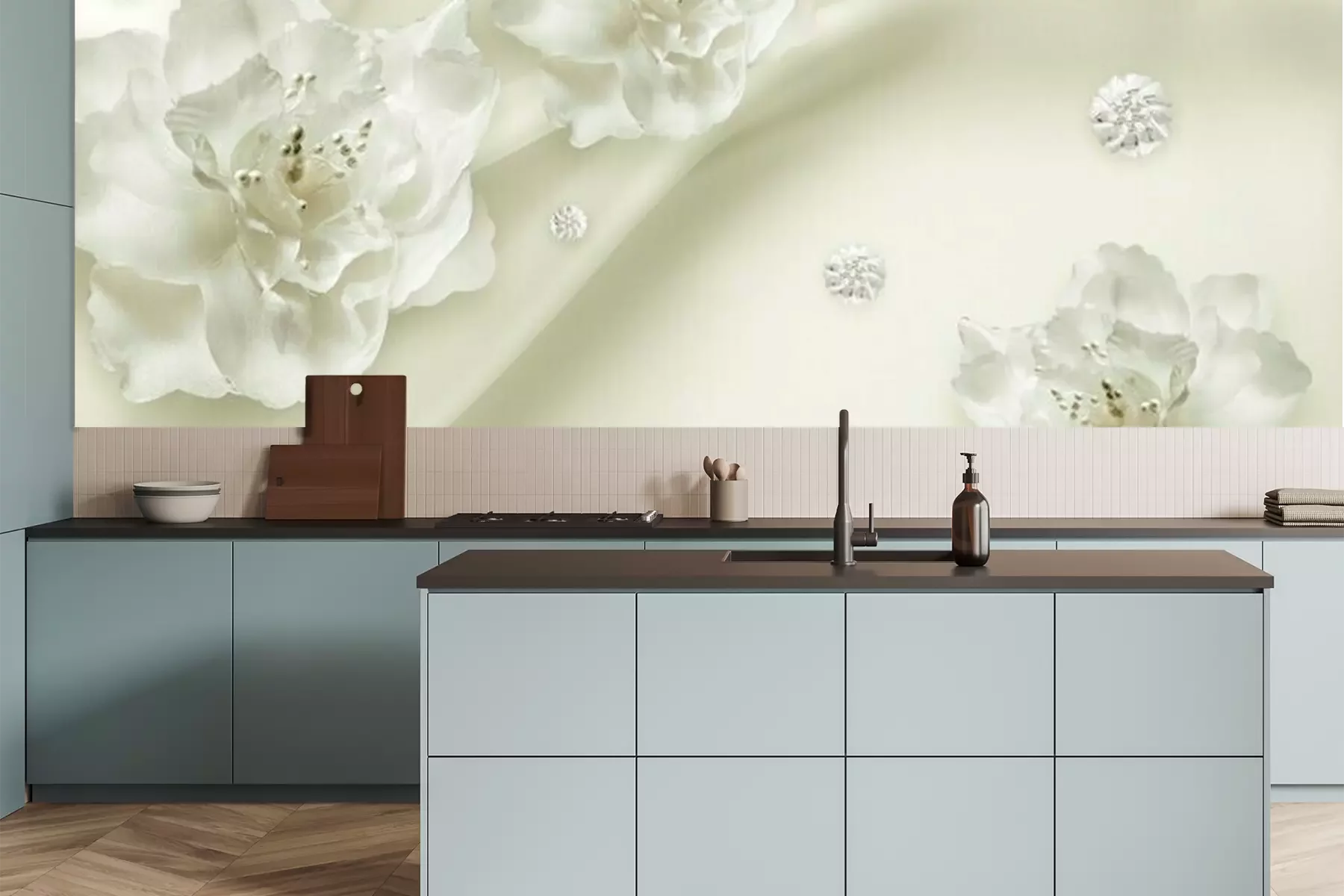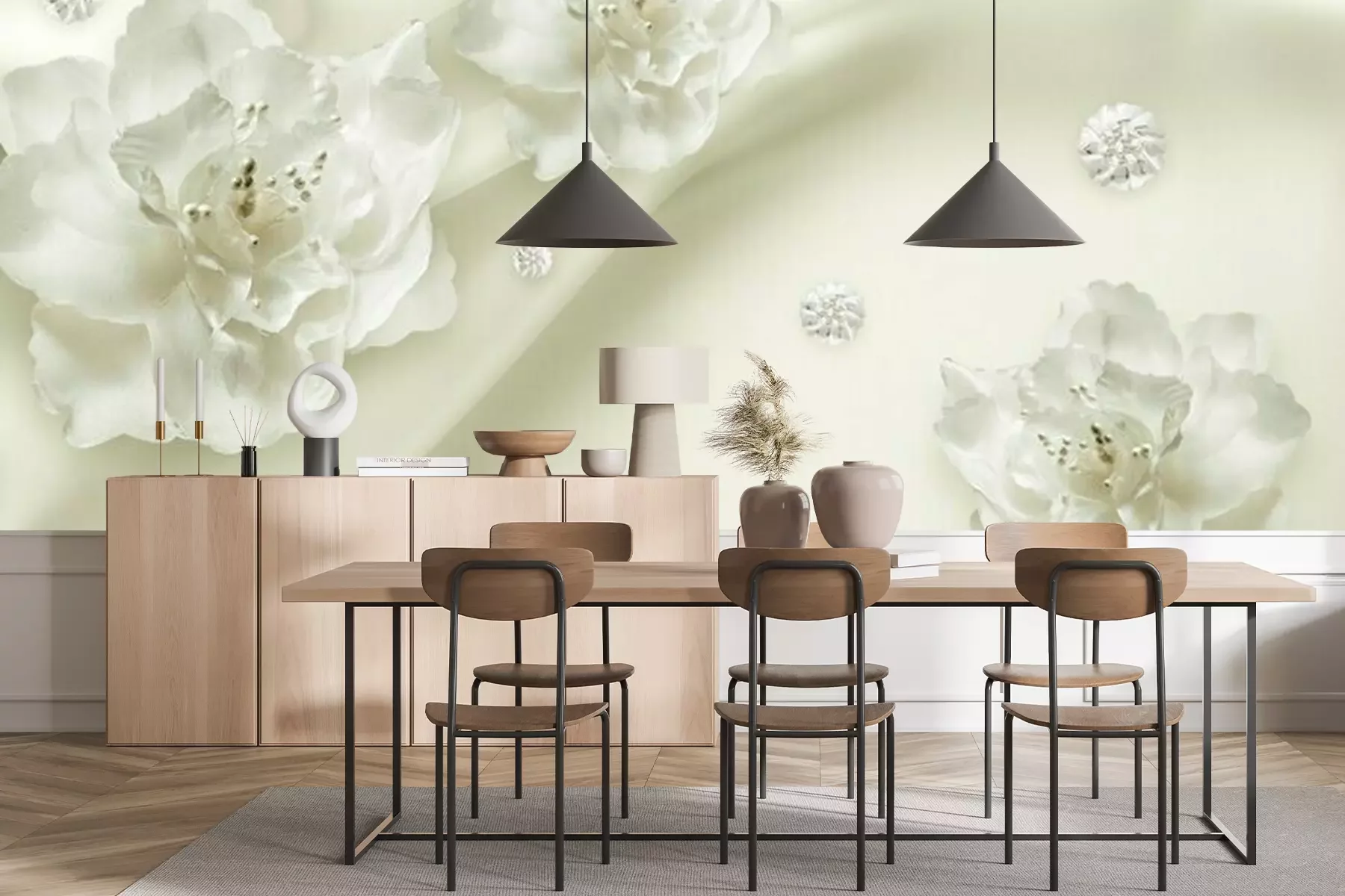 Sticker 3d weiße Blumen auf einem cremefarbenen Hintergrund