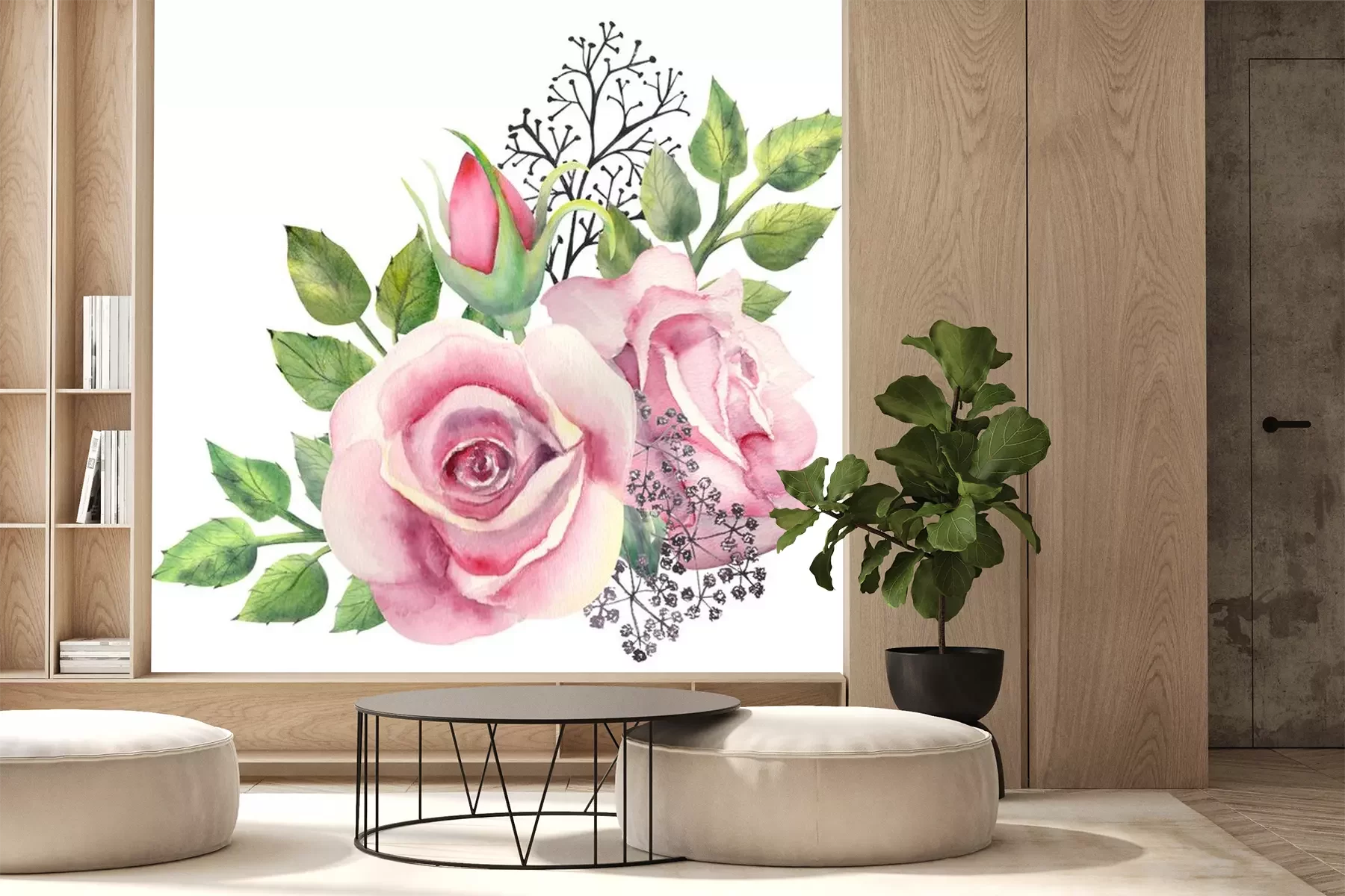 Sticker A bouquet of pink rose flowers, green leaves, red berries, decorative twigs on a white isolated background. Flower poster, invitation. Watercolor composition for decorating greeting cards or