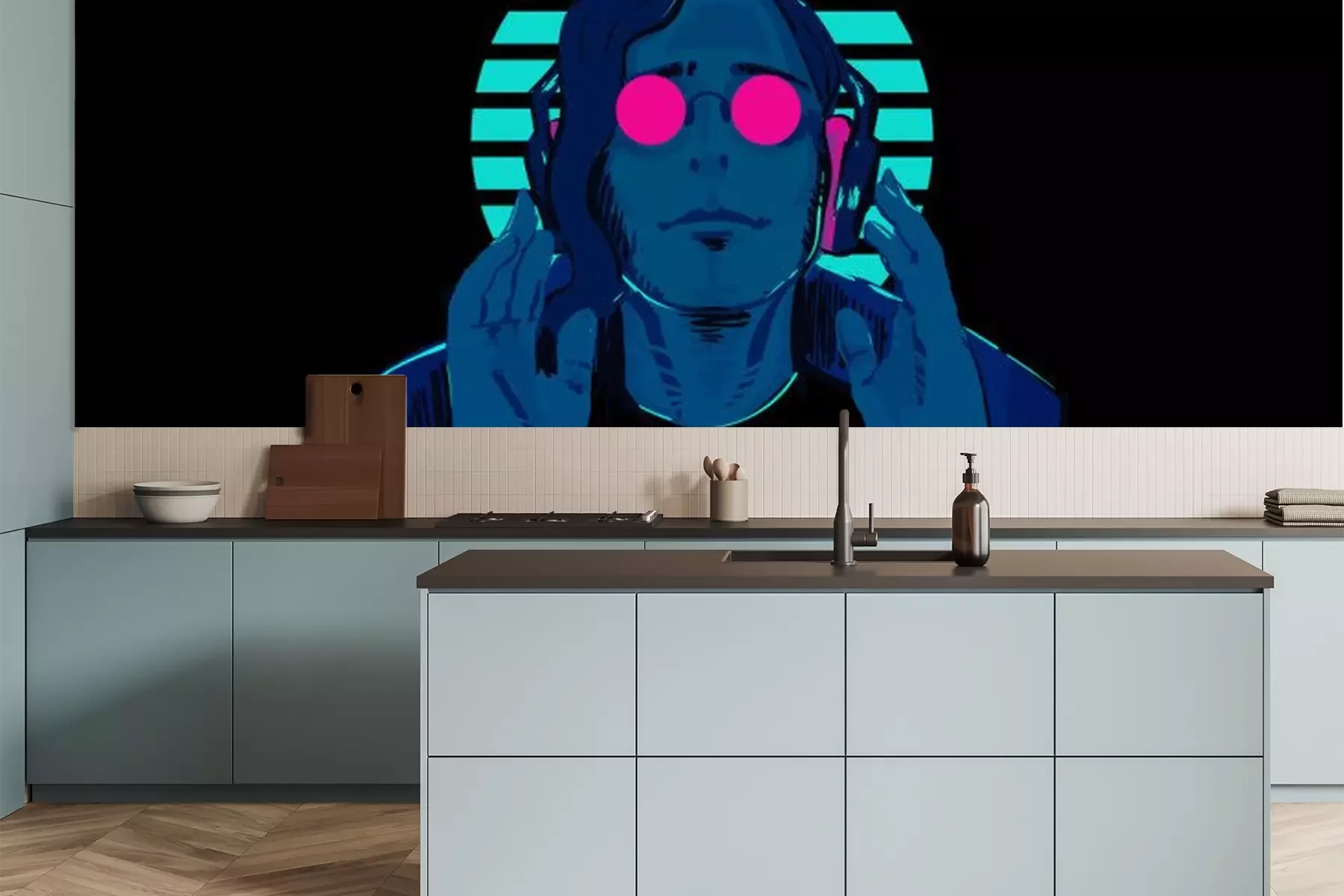 Sticker A guy with blue skin in pink, round glasses against a striped neon circle is listening to music in stereo headphones. Illustration of a sci-fi retro wave 80's on a black background.
