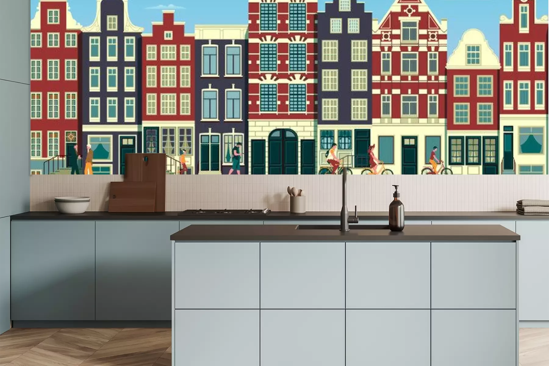 Sticker A street in Amsterdam with traditional buildings, walking people and reflections in the water
