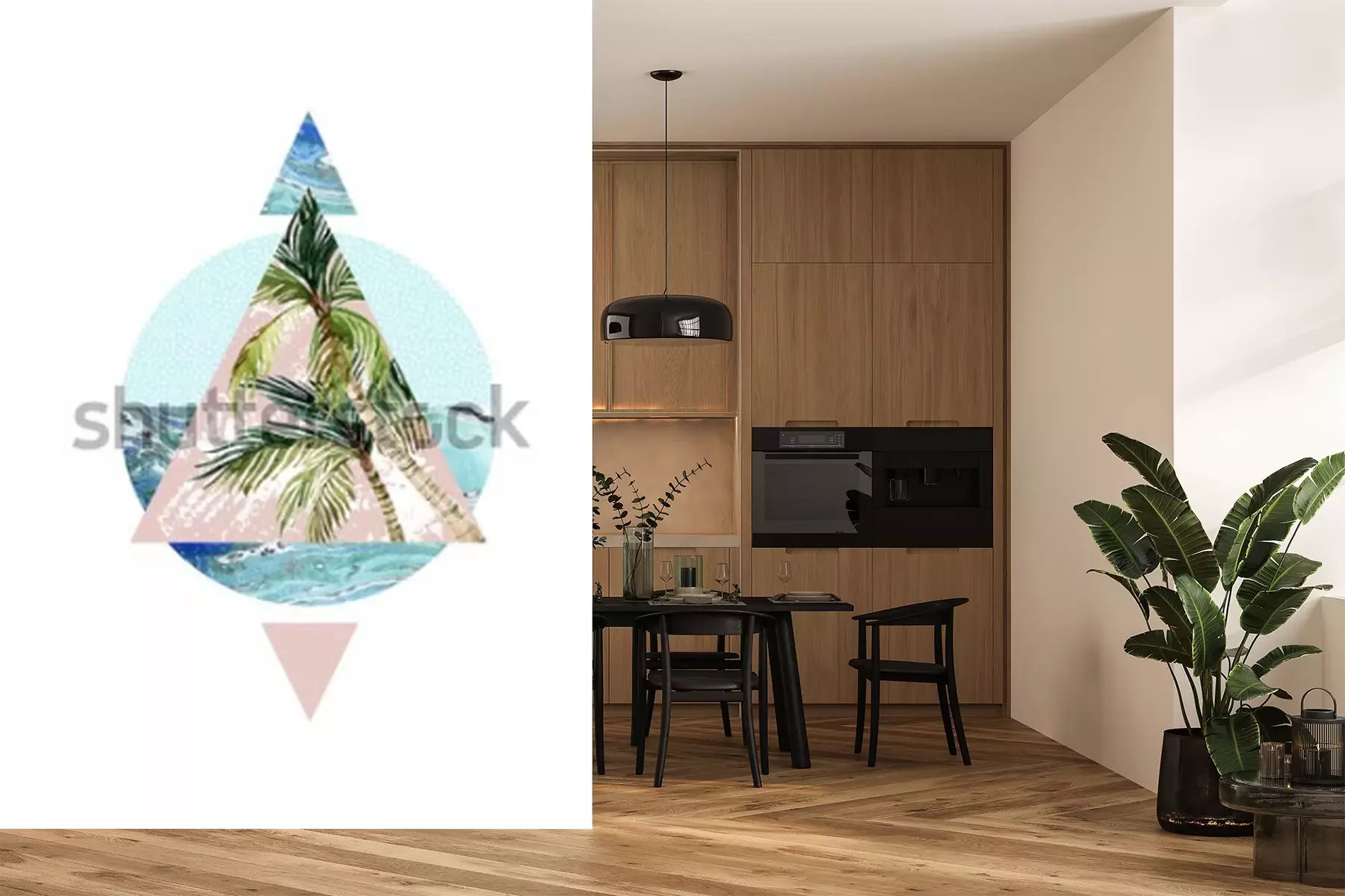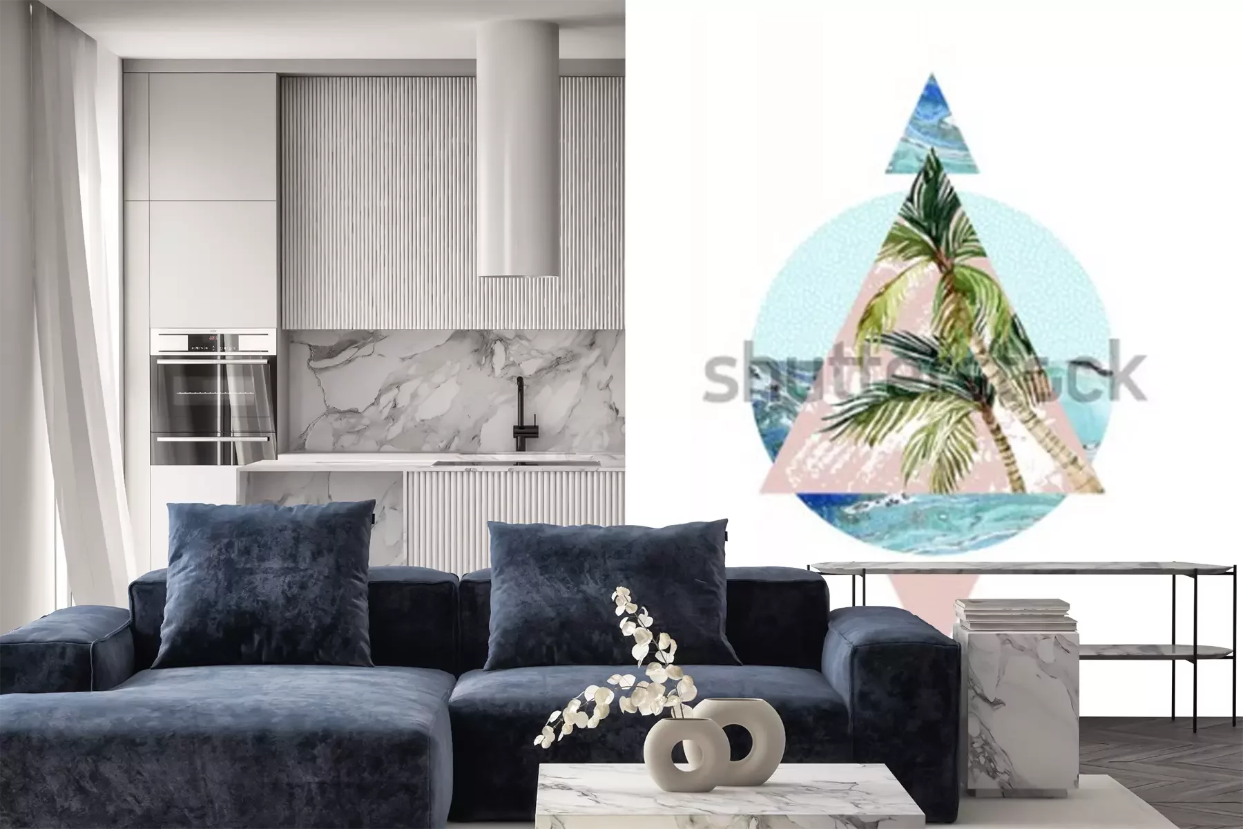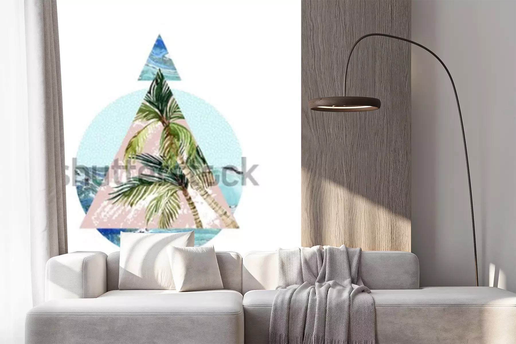 Sticker Abstrakter Sommerhintergrund. Dreieck, Kreis, Aquarellpalme, Blatt, Marmorschmutzbeschaffenheiten. Geometrisches Design für T-Shirt, Flyer, Poster im Retro-80er, 90er Jahre. Handgemalte Sommerstrandil