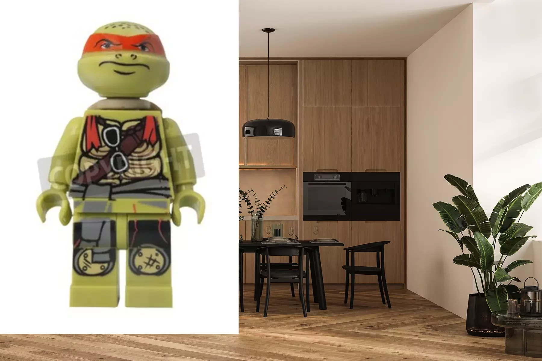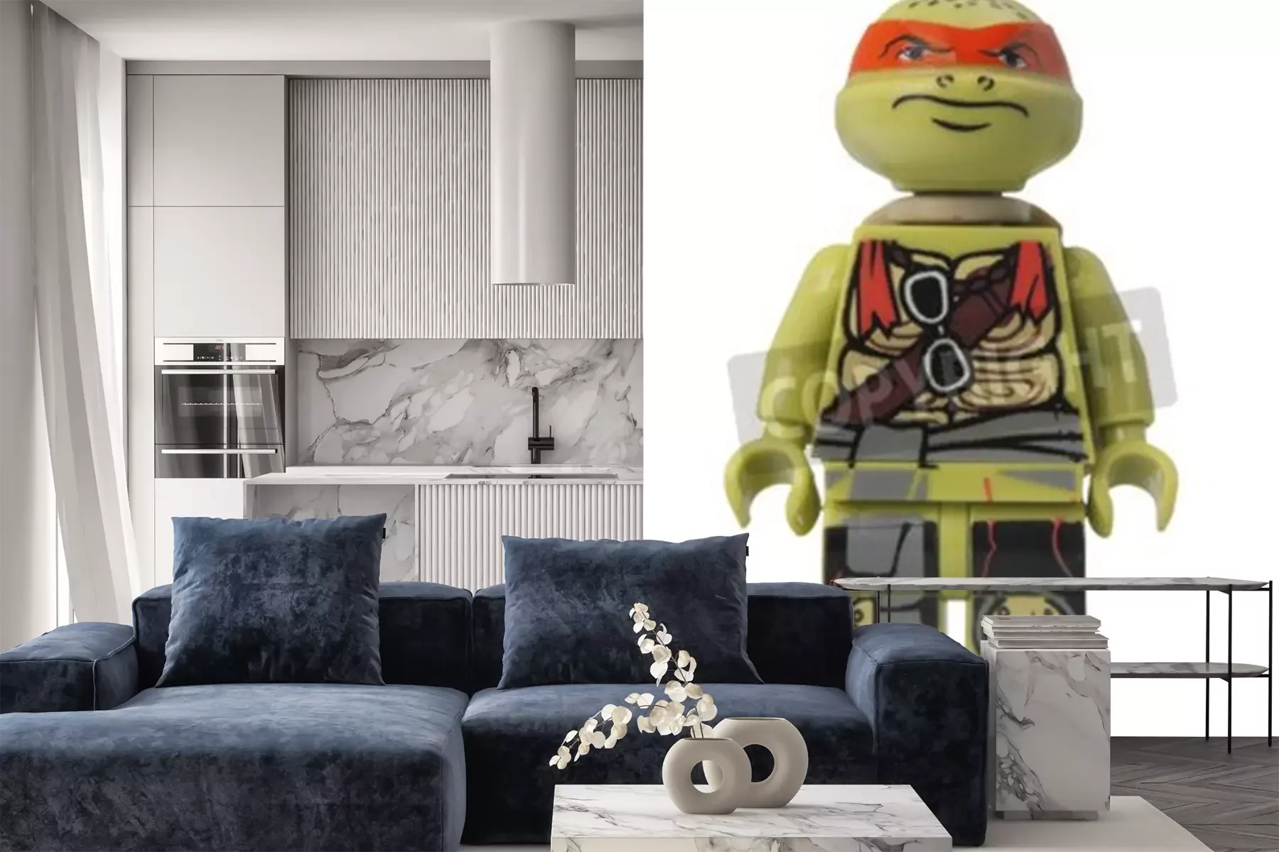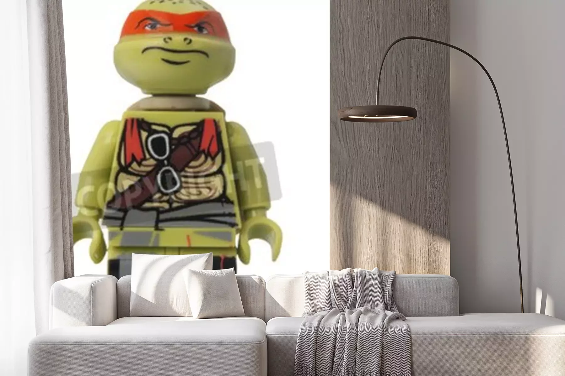 Sticker ADELAIDE, AUSTRALIEN - 26. Februar 2015: Eine Studioaufnahme einer Michelangelo Lego-Minifigur aus der TMNT-Fernseh- und Filmreihe. Lego ist weltweit bei Kindern und Sammlern sehr beliebt