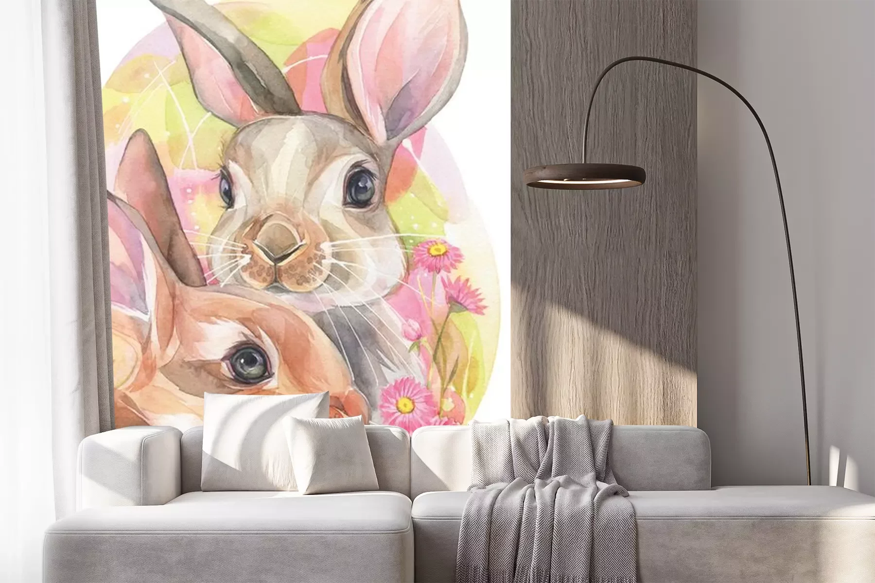 Sticker Aquarell-Hasenpaar inmitten von rosa Blumen