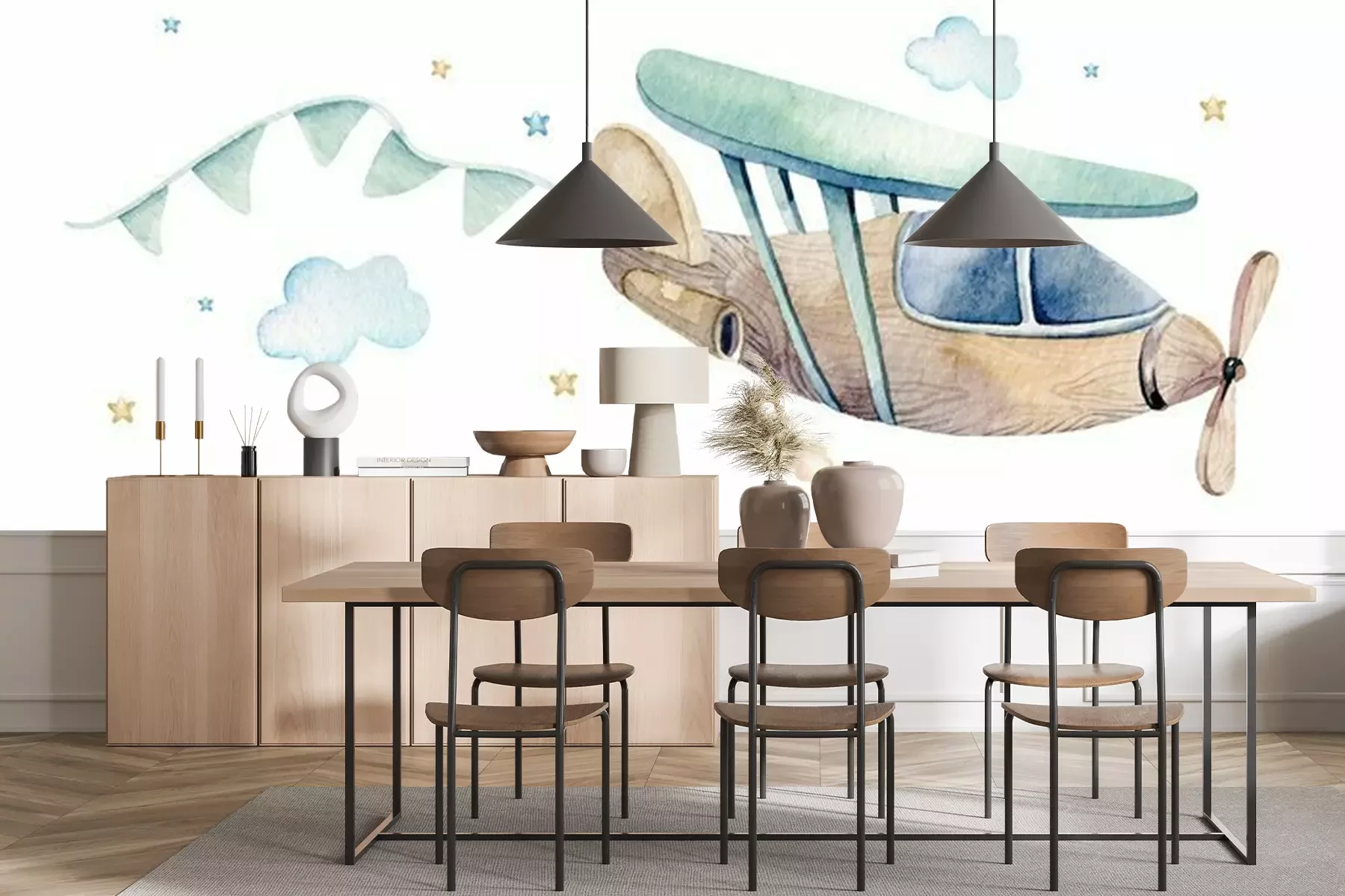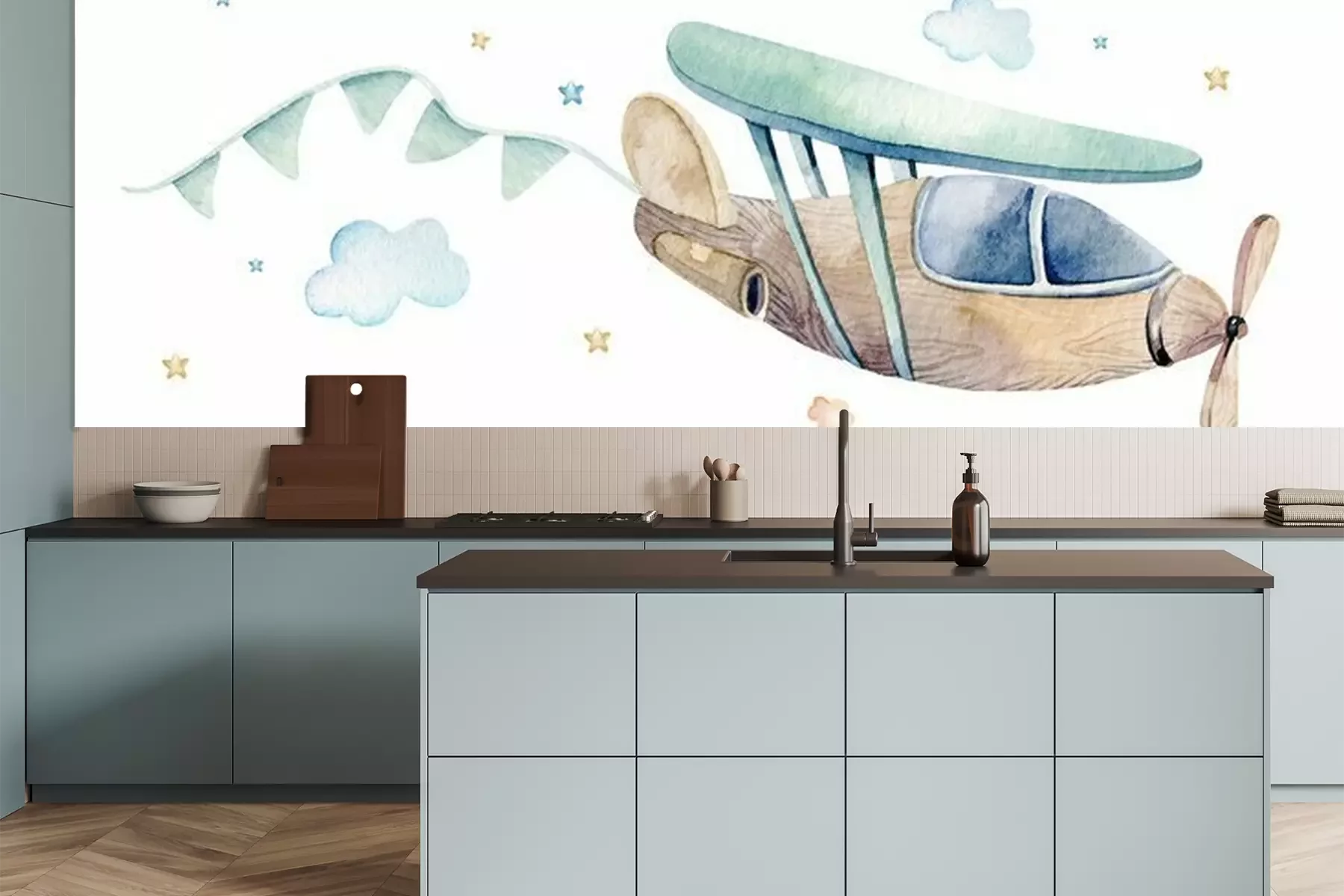 Sticker Aquarell stellte Hintergrundillustration einer niedlichen Karikatur- und ausgefallenen Himmelsszene zusammen mit Flugzeugen, Hubschraubern, Flugzeug und Luftballons, Wolken ein. Nahtloses Muster des J