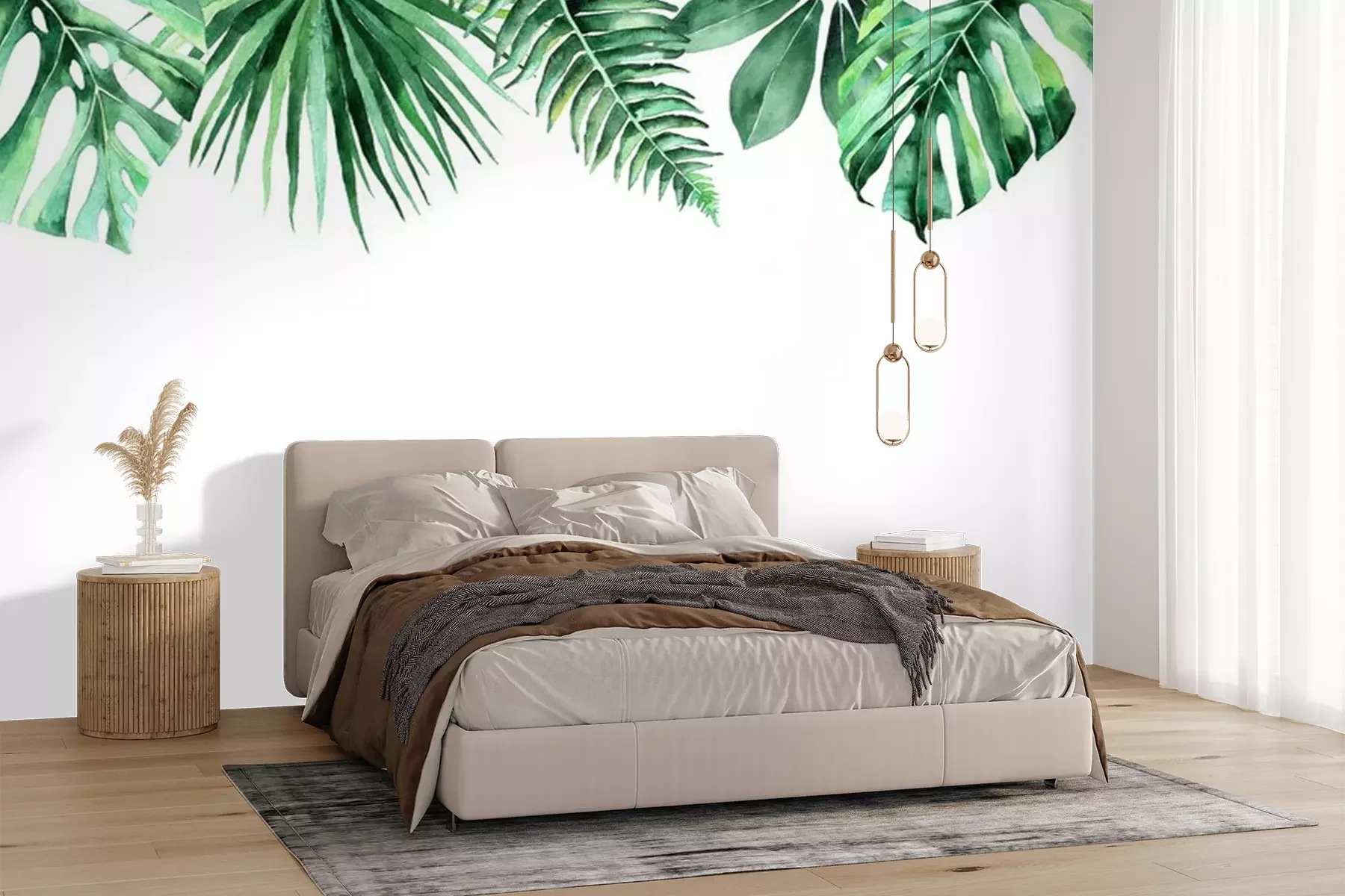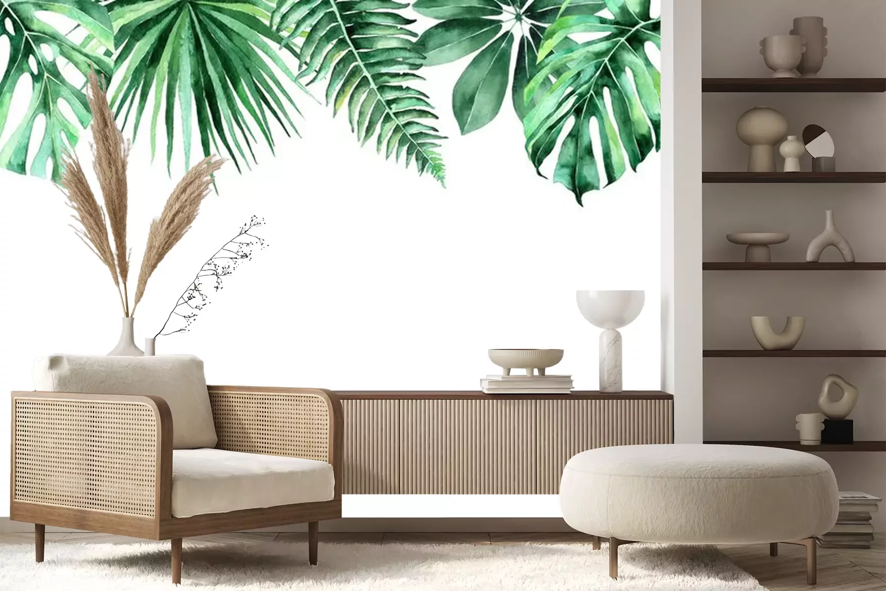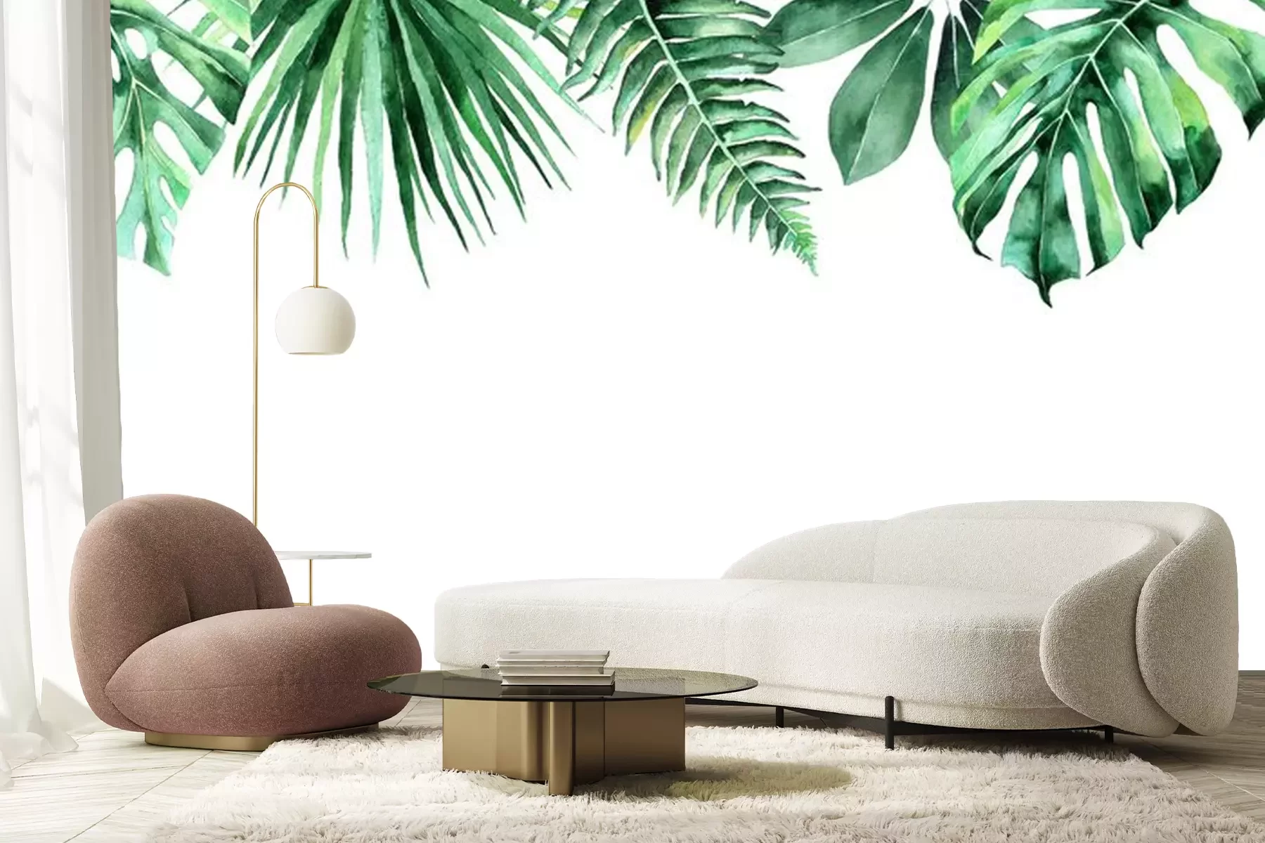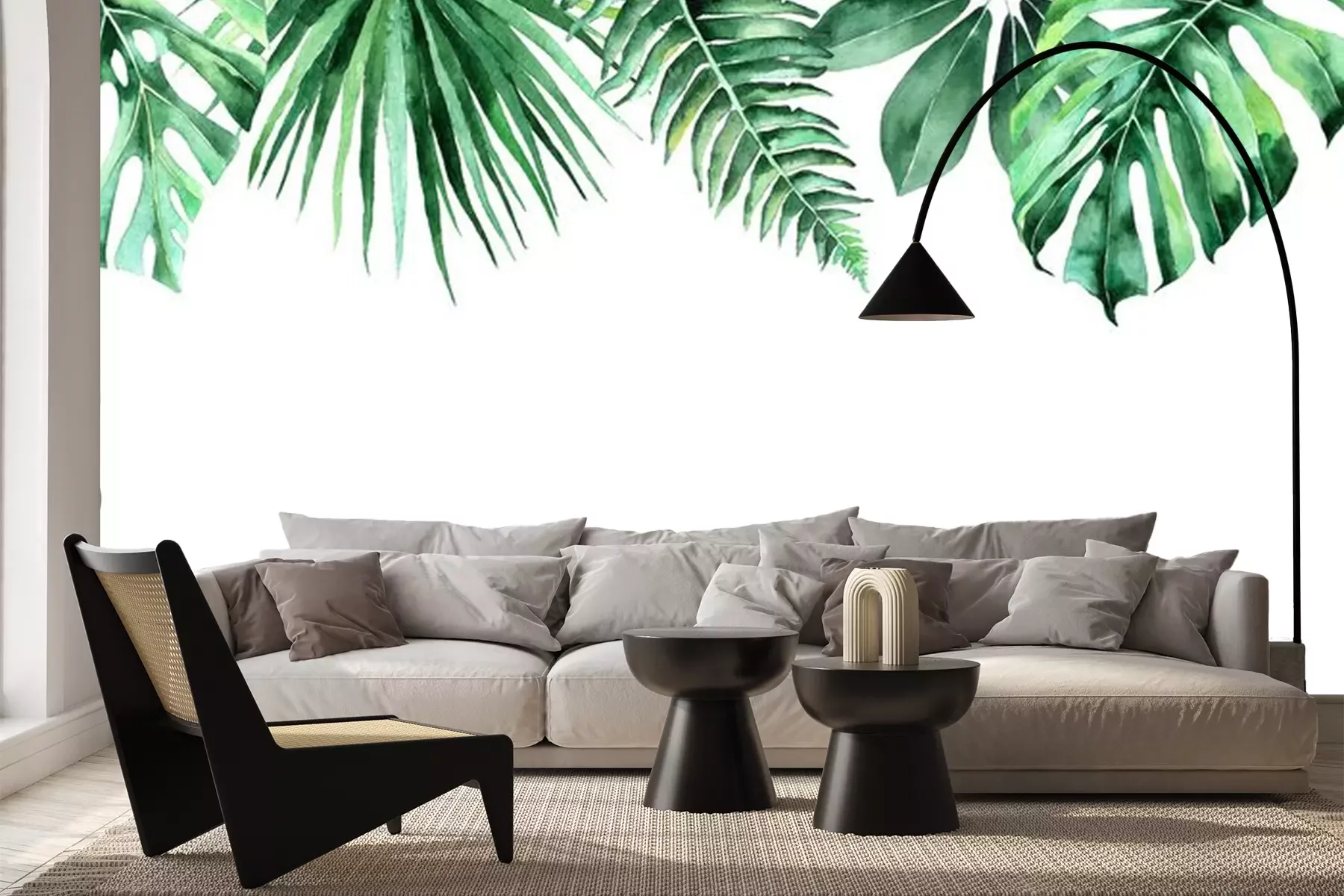 Sticker Aquarellillustration von tropischen Blättern. Rahmen aus tropischen Blättern. Einladung zur Hochzeit