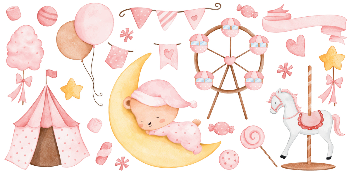Sticker: Aquarellkomposition eines Vergnügungsparks mit einem Bären auf dem Mond