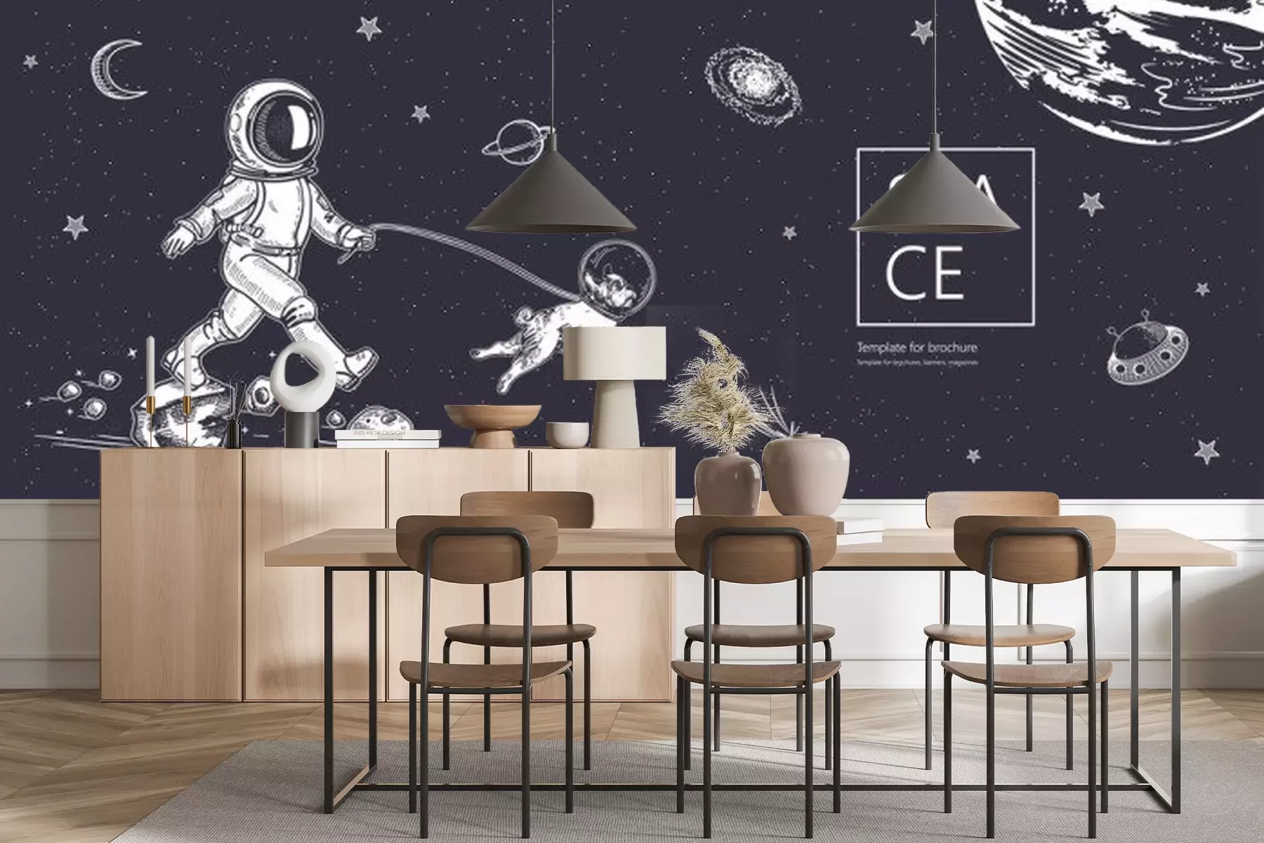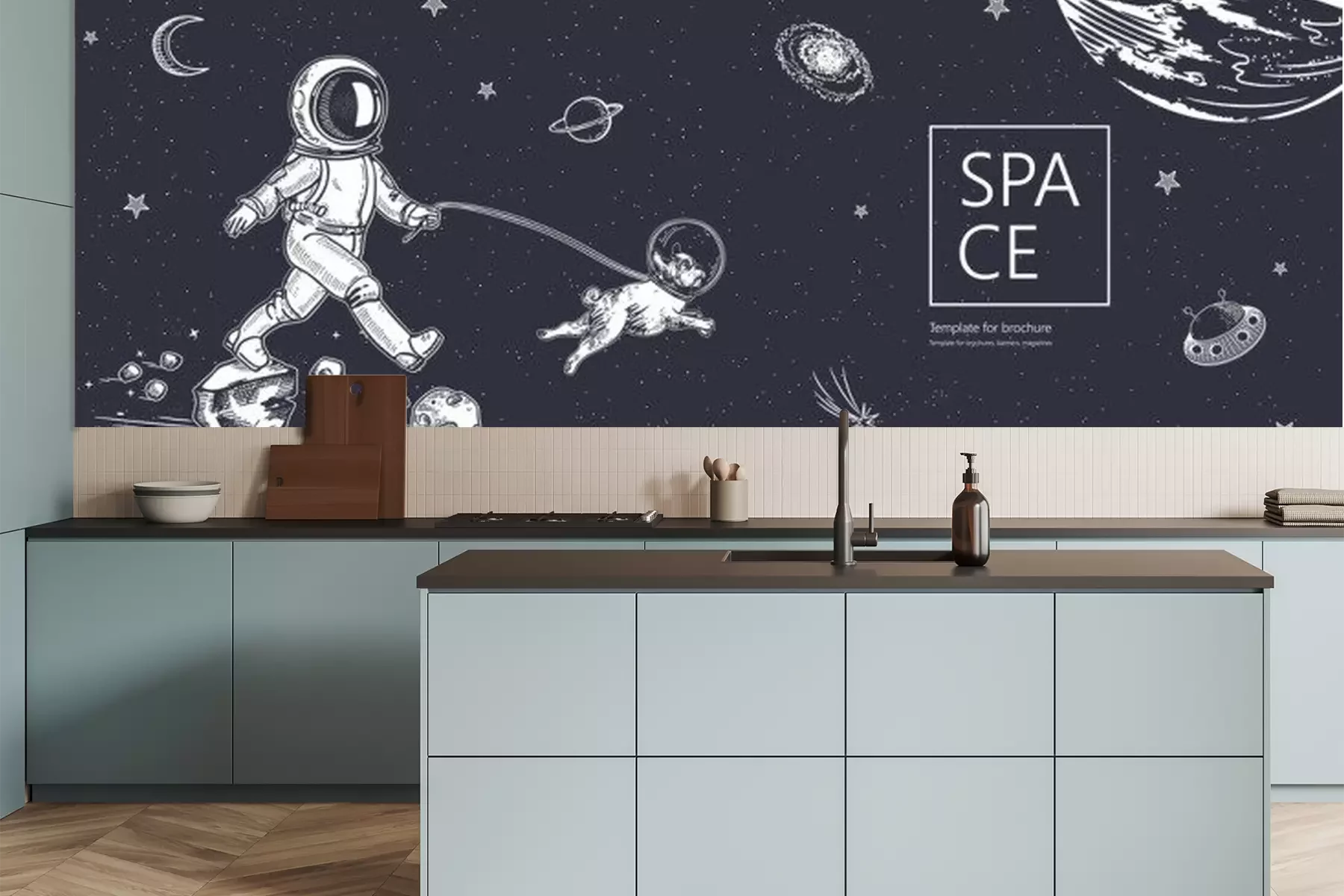 Sticker Astronaut im Weltraum mit dem Hund Gassi gehend
