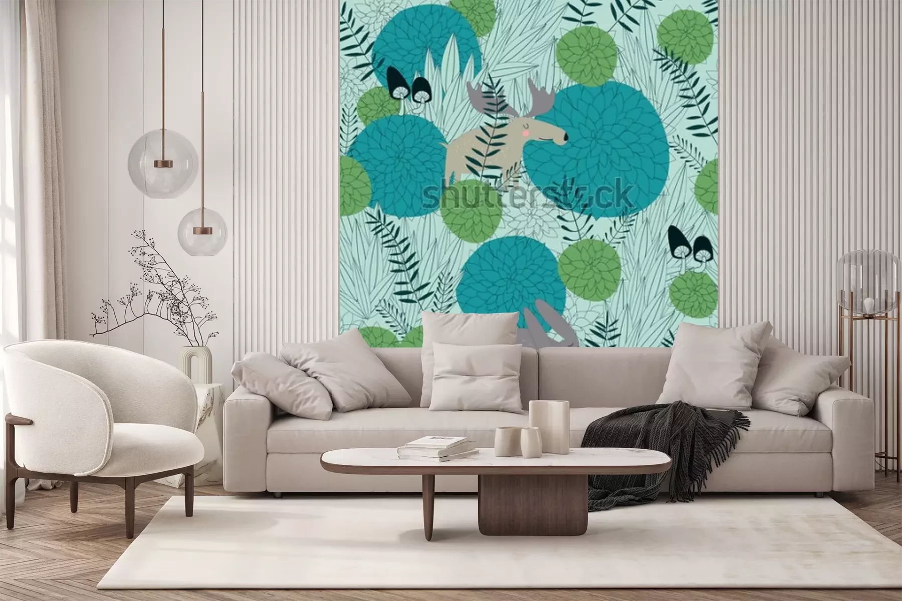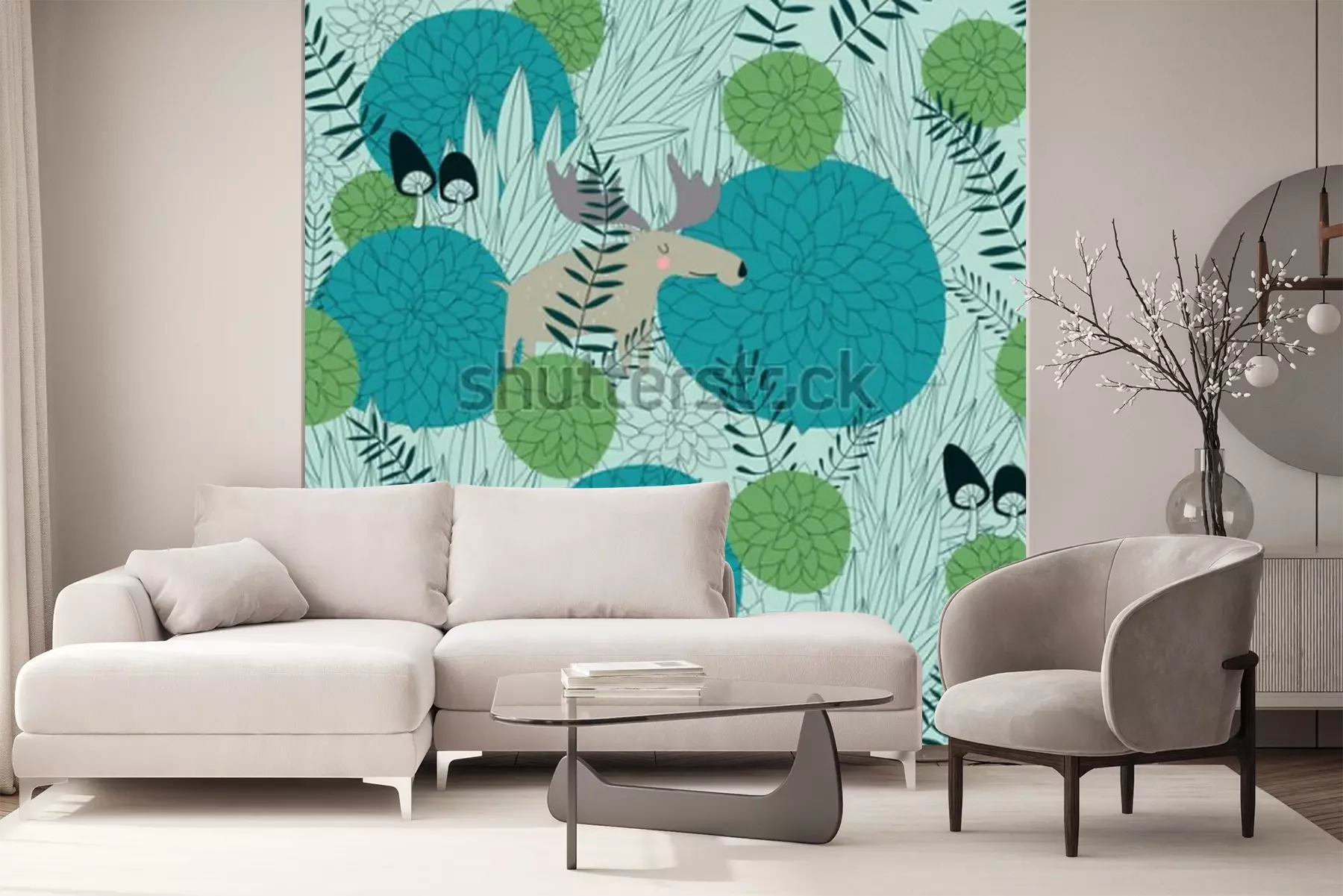 Sticker Beinhaltet Waldhintergrund mit niedlichen Waldpflanzen, Lachs, Hase und Pilzen im Cartoon-Design
