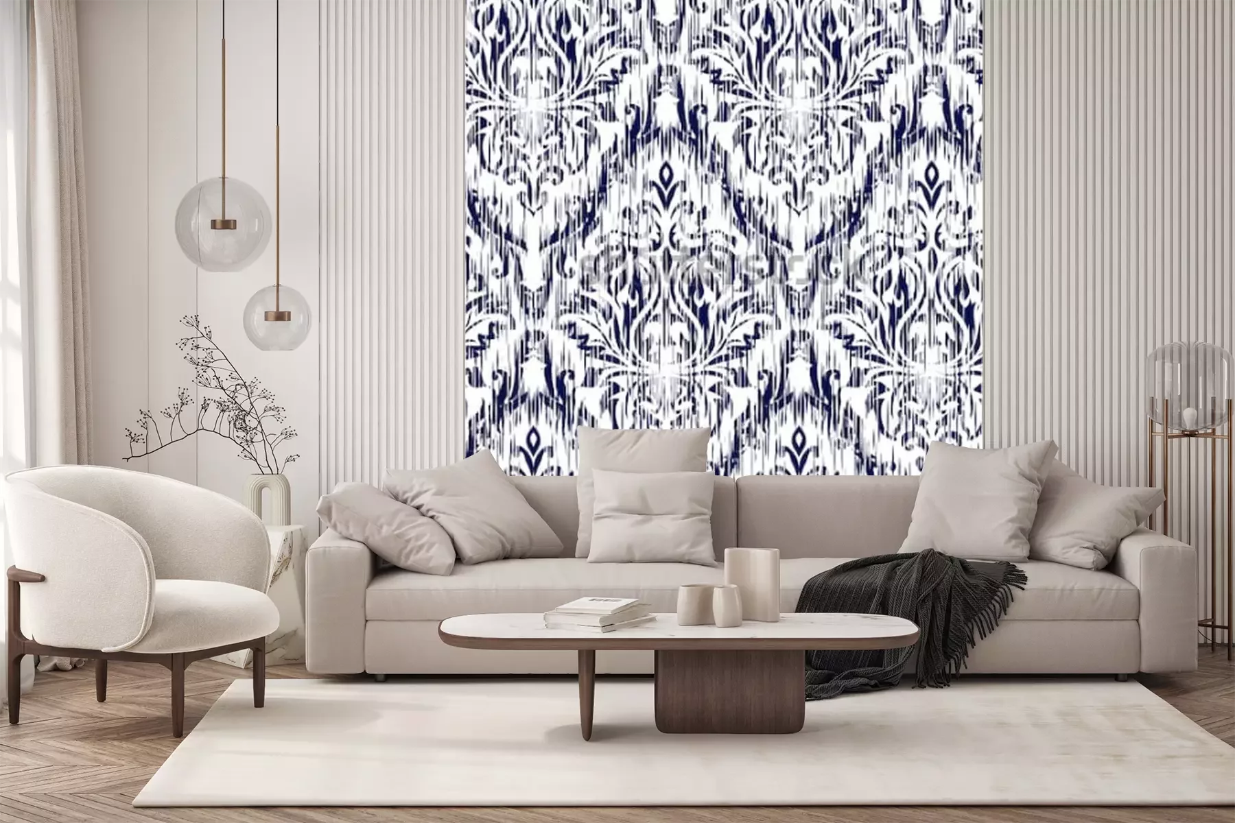 Sticker Blaue Verzierung Ikat Ogee und Damaskus nahtloses Hintergrundmuster. Abstrakter Hintergrund für Textildesign, Tapete, Oberflächenbeschaffenheiten.