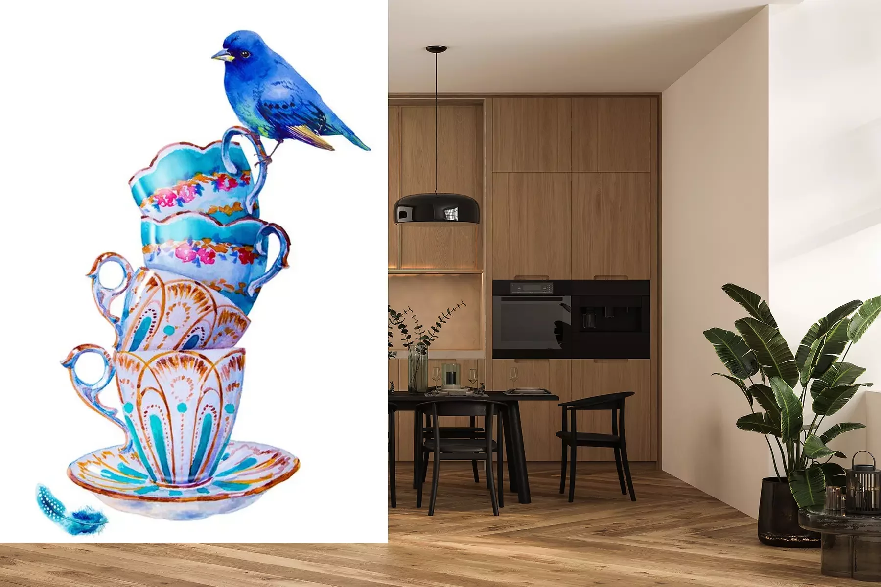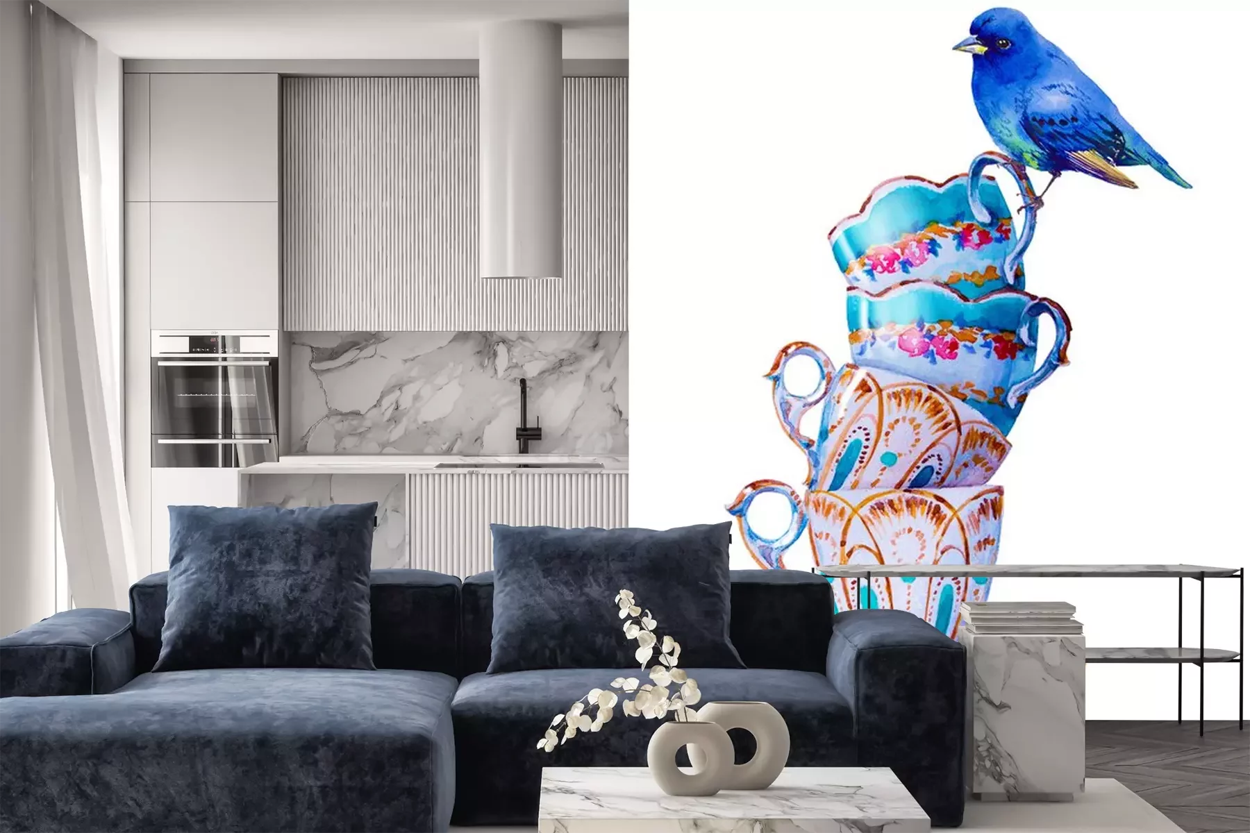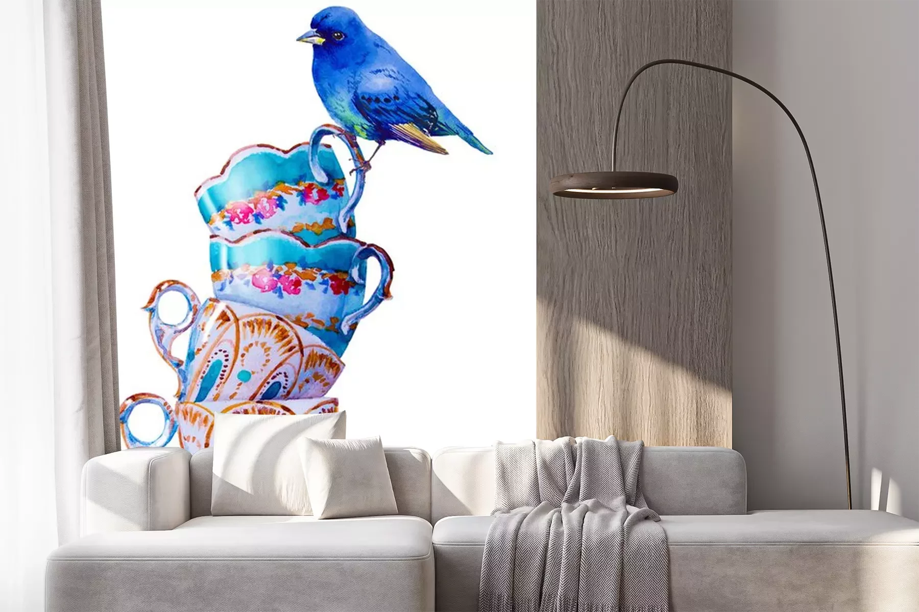 Sticker Blauer Vogel und Shabby-Chic-Tassen