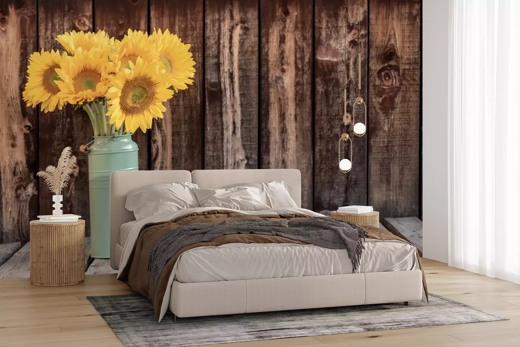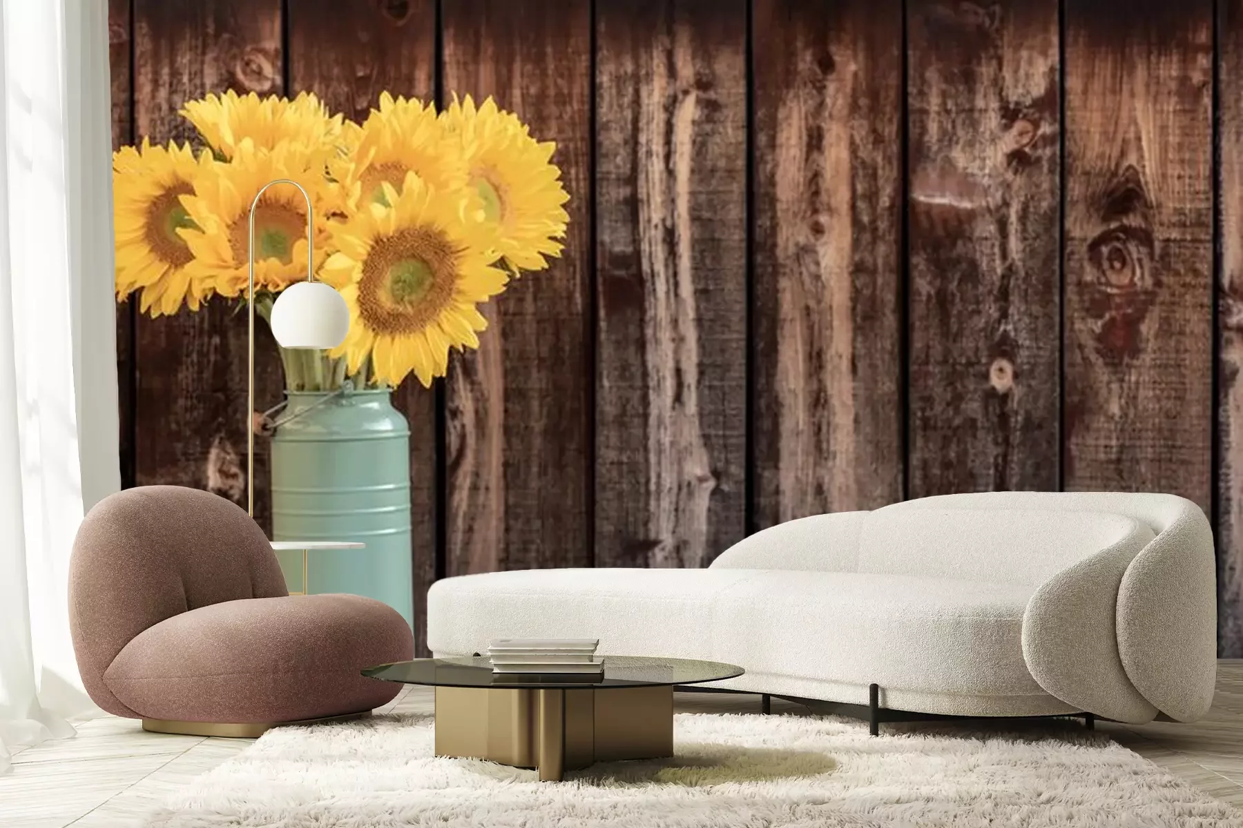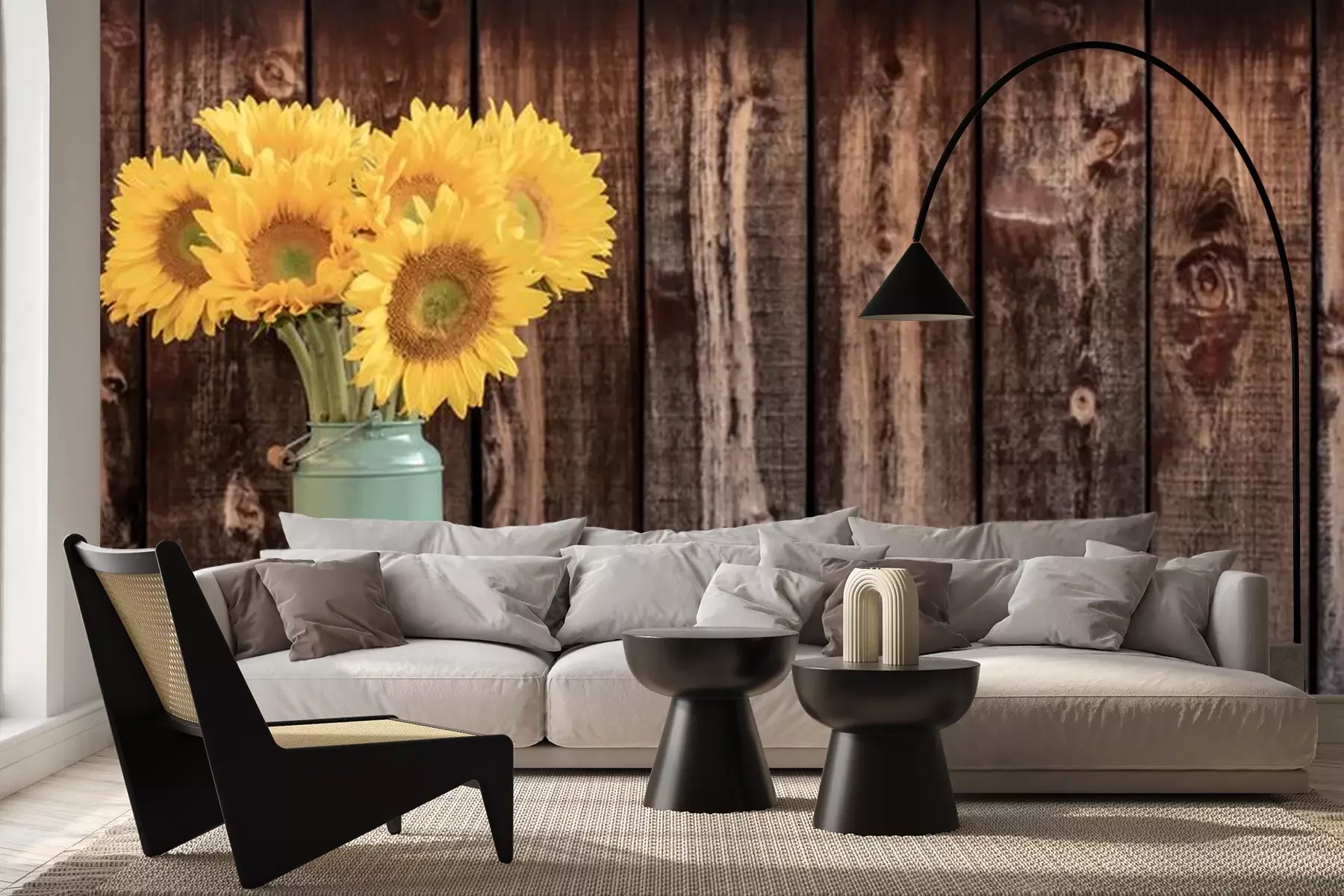 Sticker Blumenstrauß aus Sonnenblumen auf einem hölzernen Hintergrund