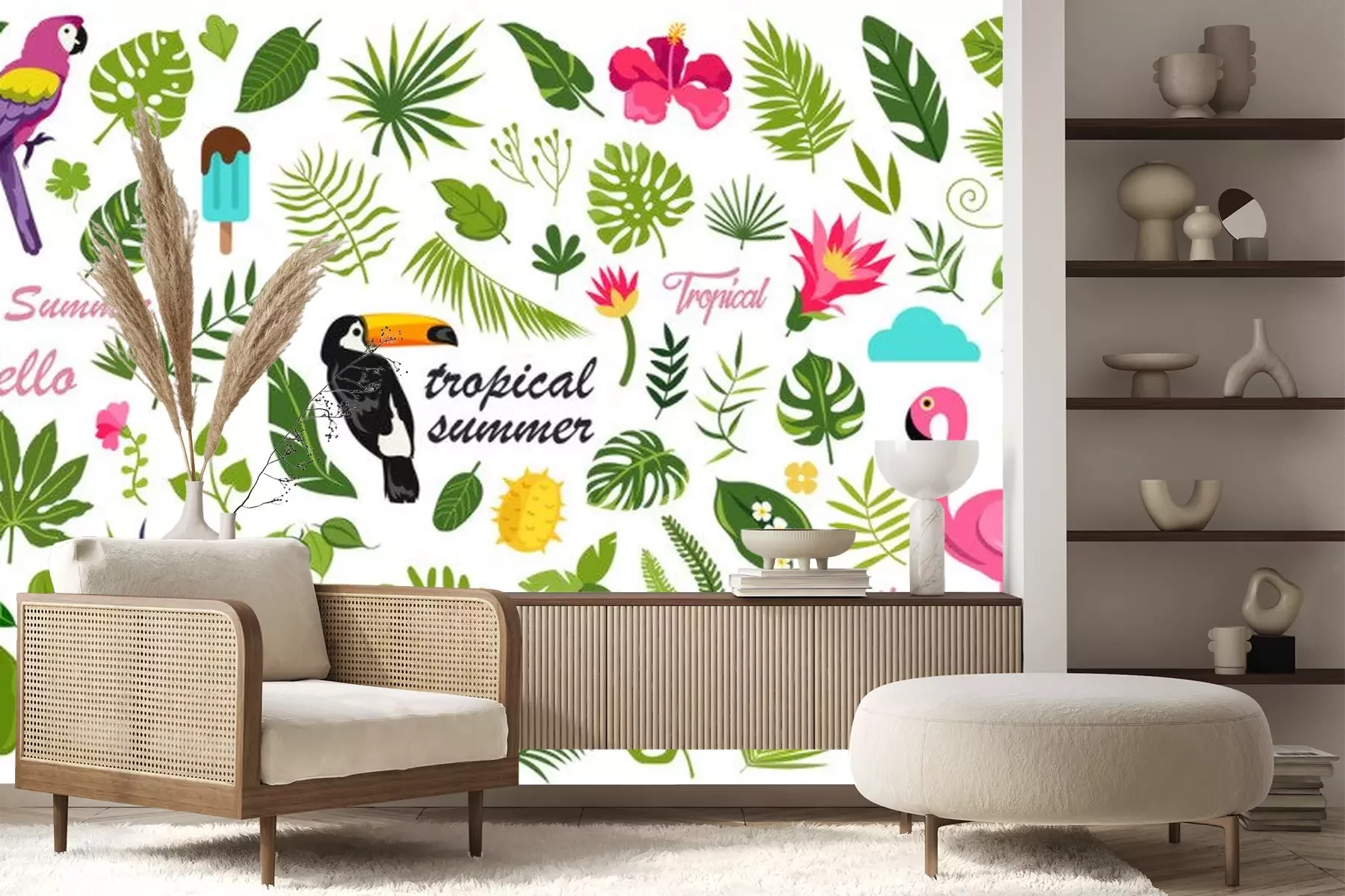 Sticker Cartoon-Satz von flachen Sommerdekorelementen.  tropisches Design.  Vektorillustration