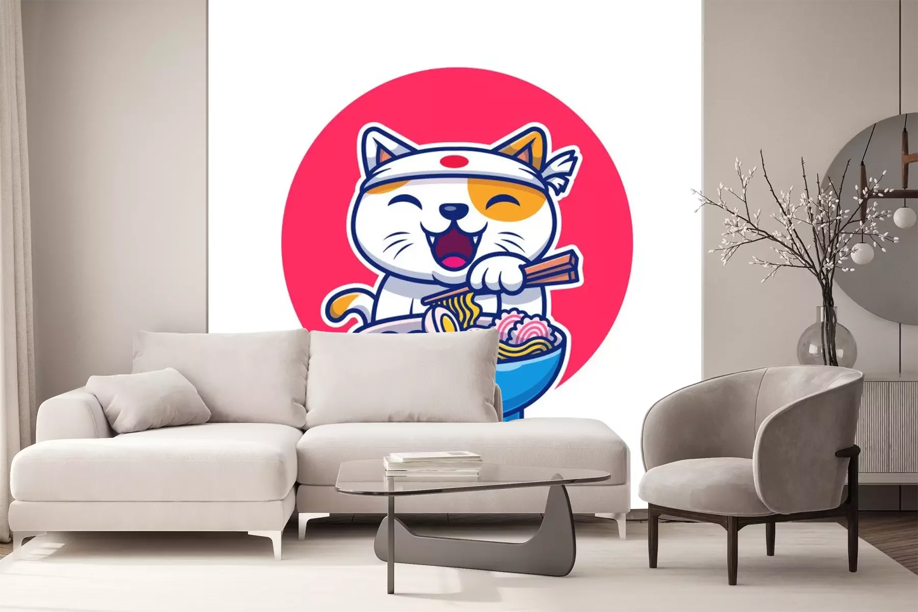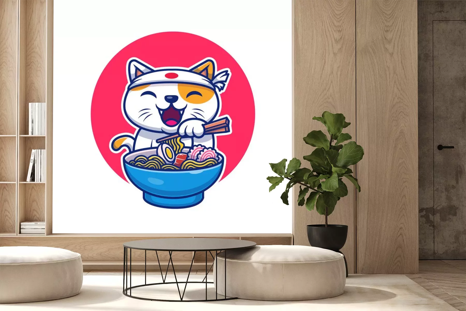 Sticker Cat Eating Ramen Noodle Vector Icon Illustration. Cat Logo Mascot Cartoon Character. Animal Icon Concept White Isolated. Flat Cartoon Style Suitable for Web Landing Page, Banner, Flyer, Sticker, Card