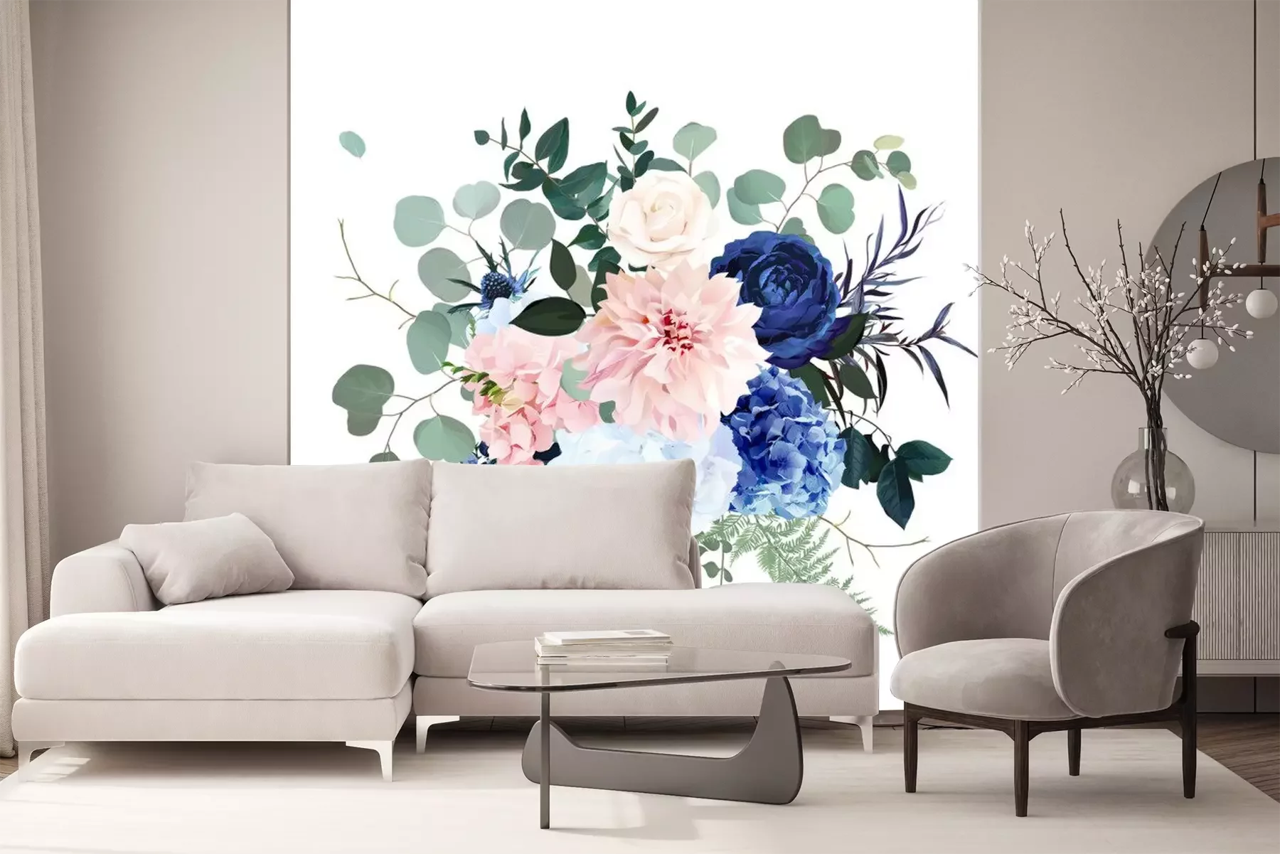 Sticker Classic blue rose, pink hydrangea, ranunculus, dahlia, thistle flowers, emerald greenery