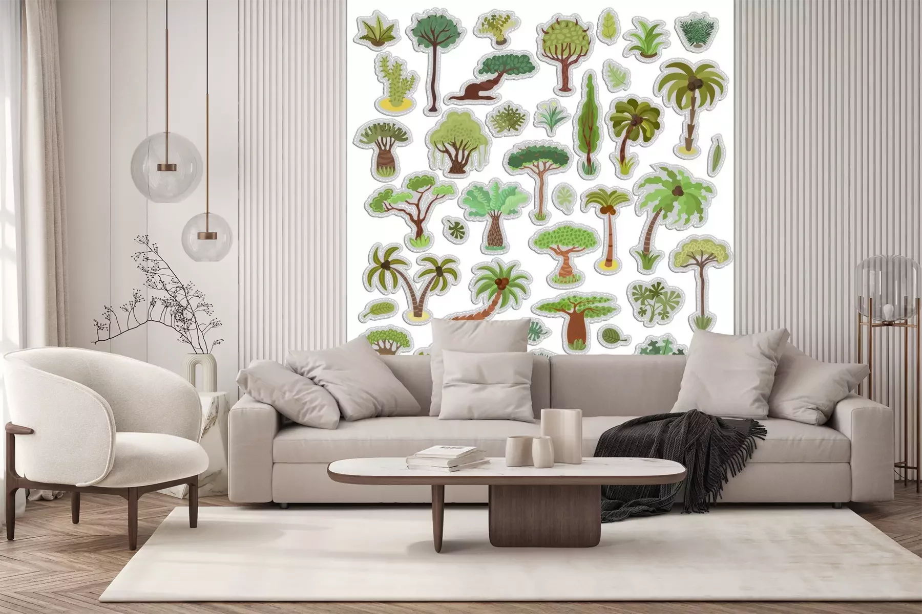 Sticker Collection of tropical trees stickers, palms and other tropical exotic plants, sticker vector illustration set. Rainforest jungle trees, plants, shrubs, leaves, paradise beach resort crooked palm