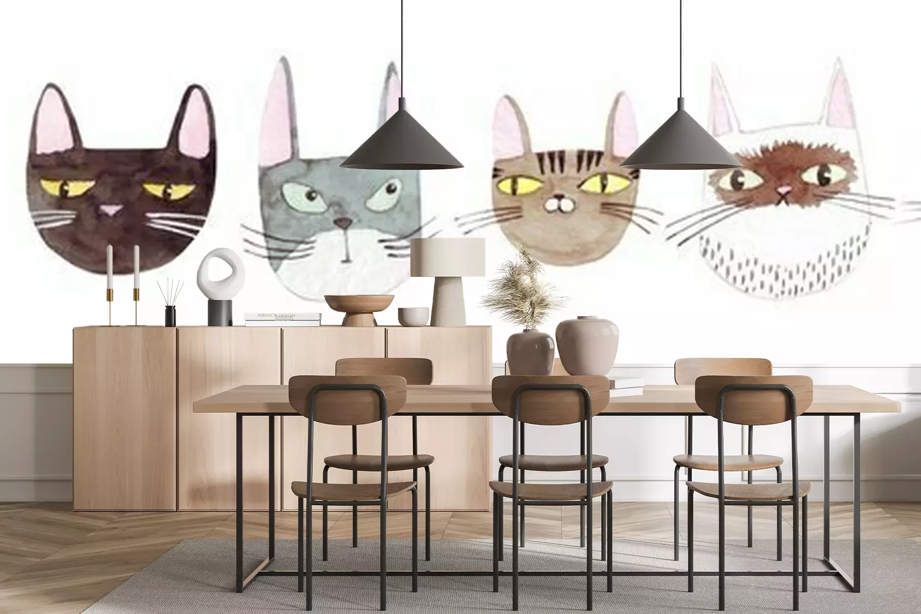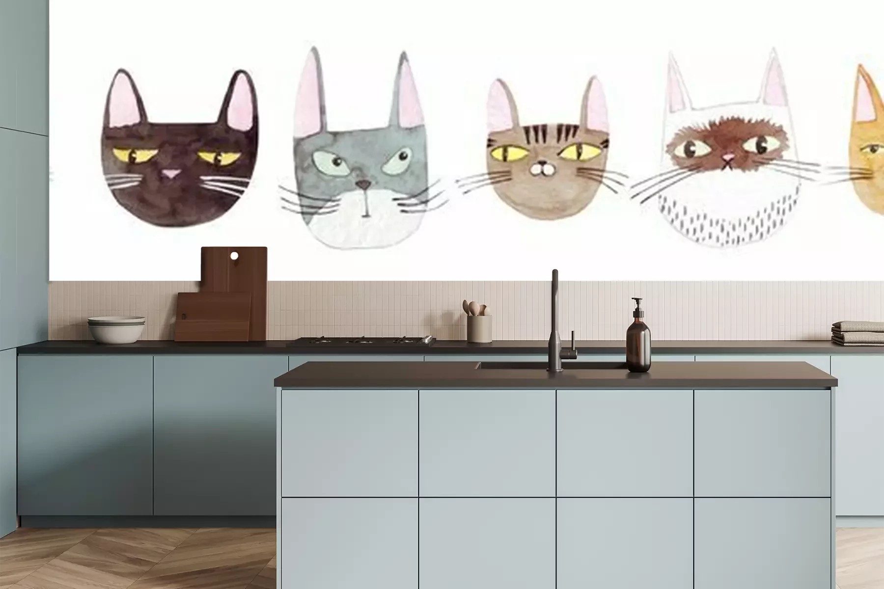 Sticker Cute cats collection on white background. Colorful graphic cats, poster design. Watercolor hand drawn illustration. Painted backdrop. Cloth pattern. Cat, kitten, head.