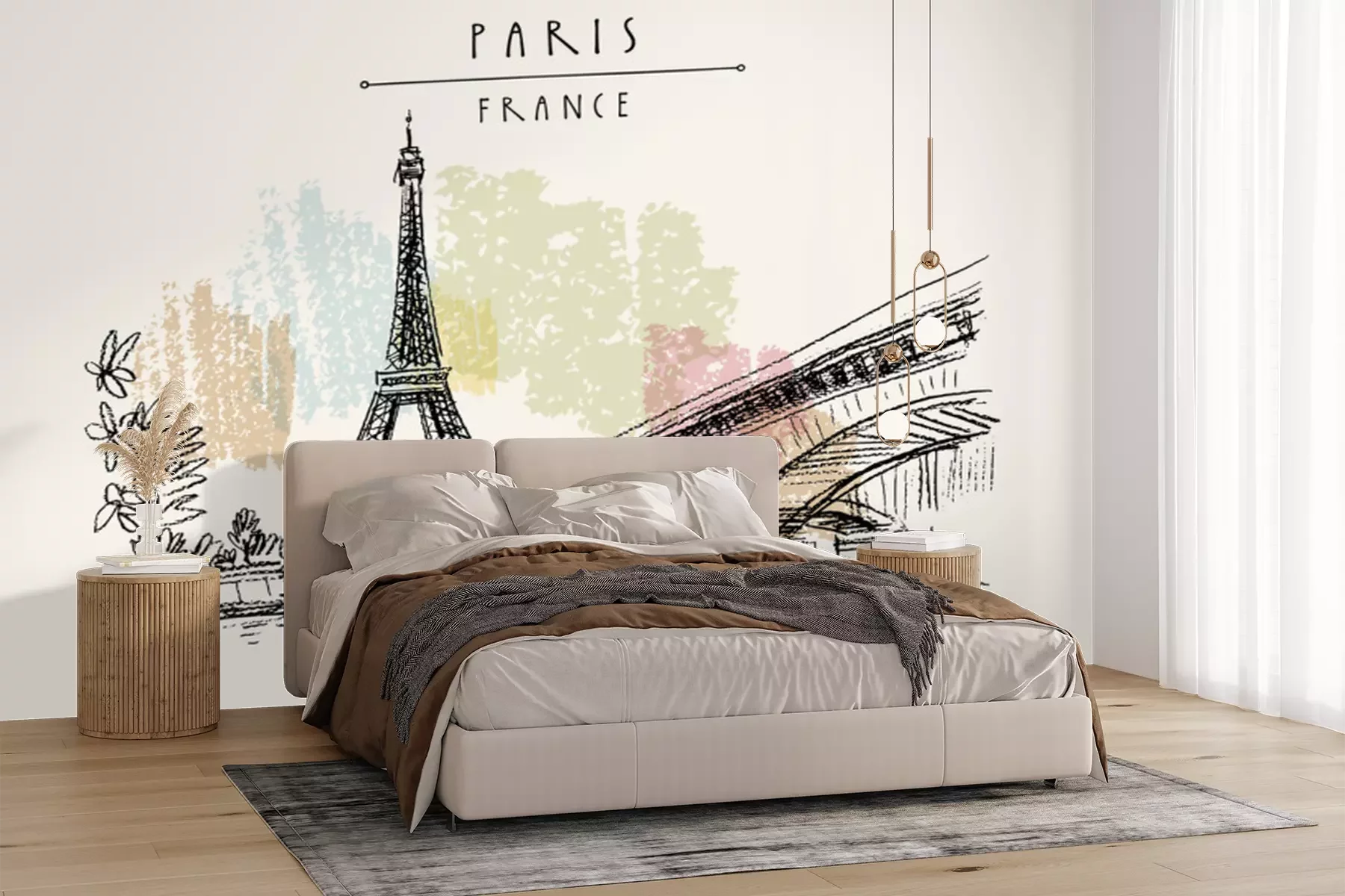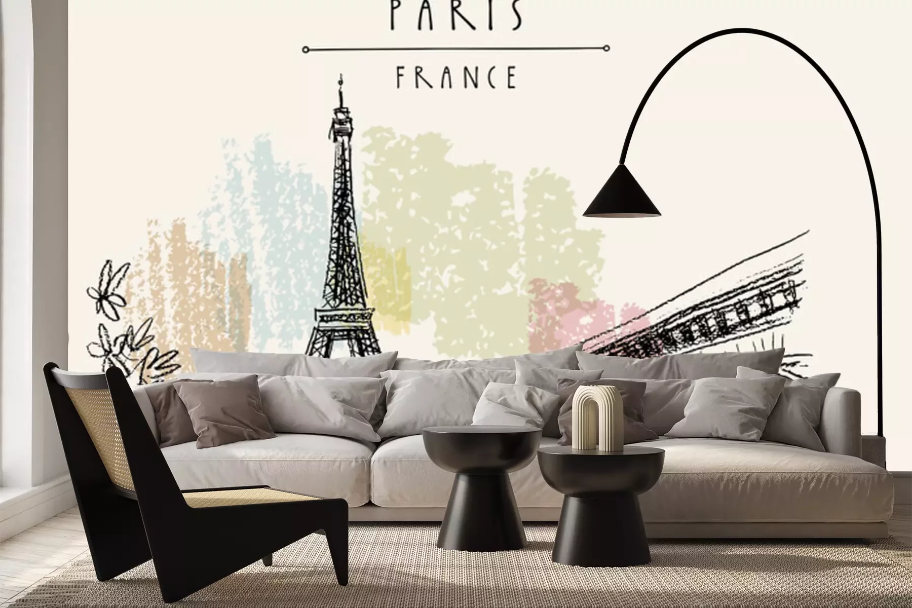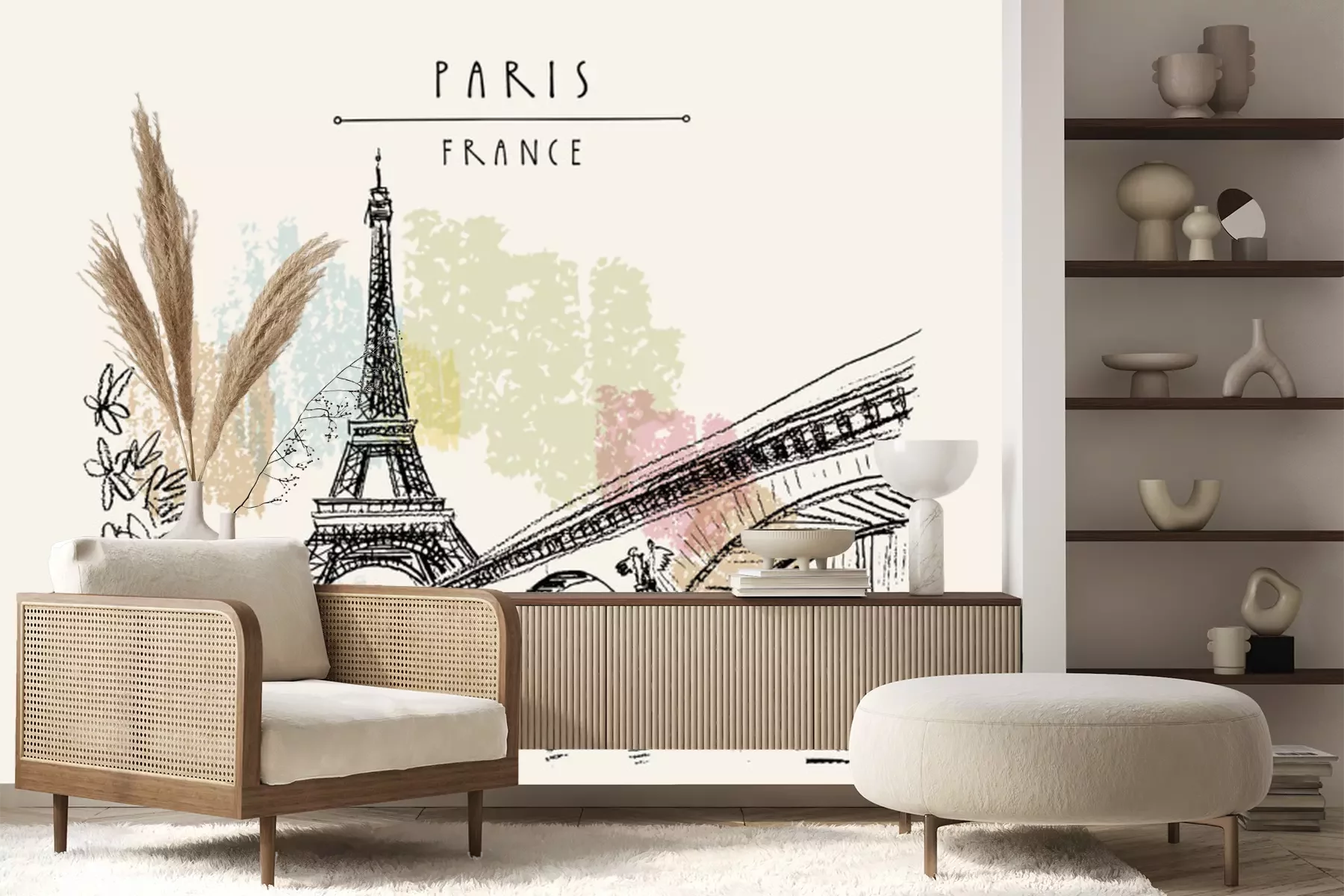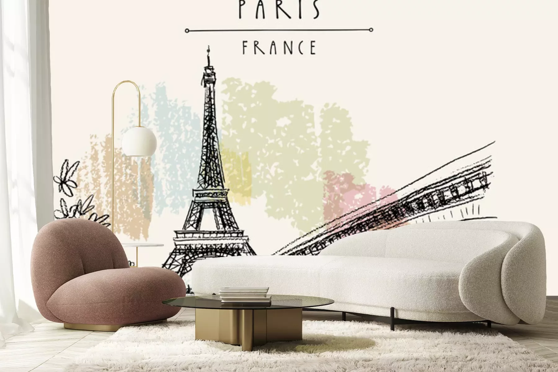 Sticker Eiffel Tower in Paris, France. Vintage hand drawn touristic postcard