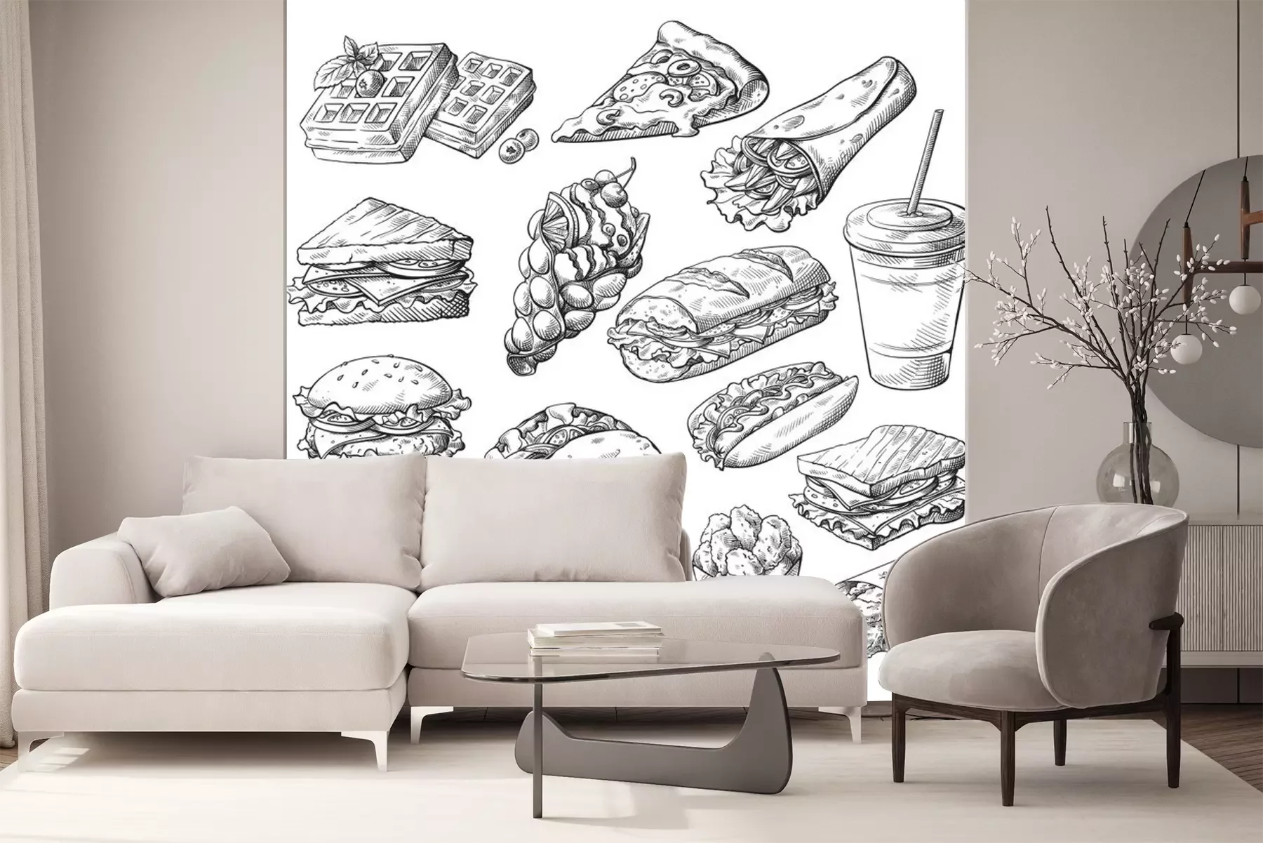 Sticker Essen Fast Food realistische schwarz-weiße Zeichnungen