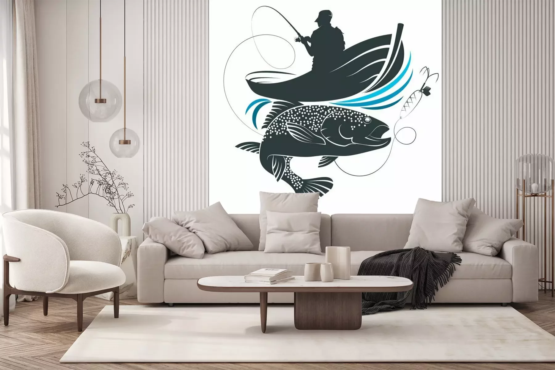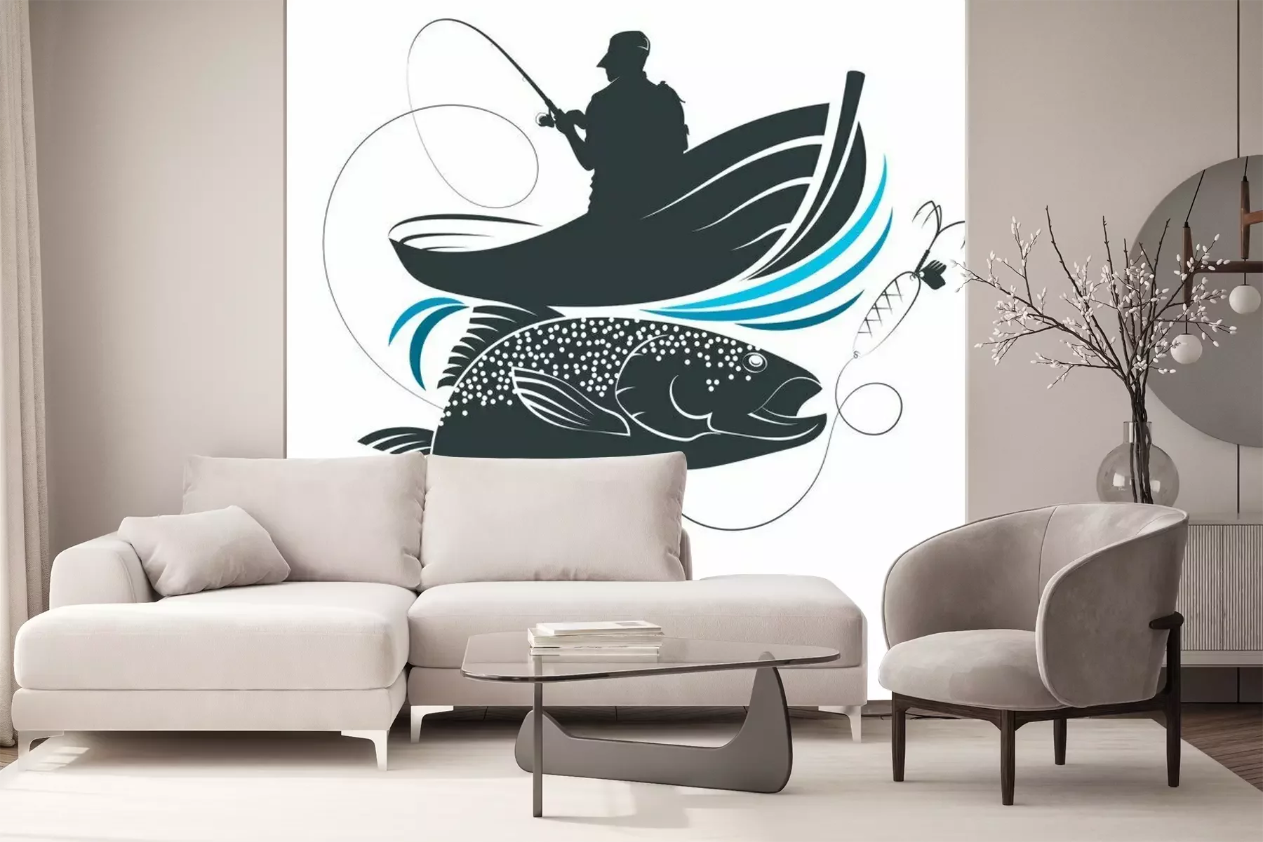 Sticker Fische Grafik Angler in einem Boot und schwarz-weißer Fisch